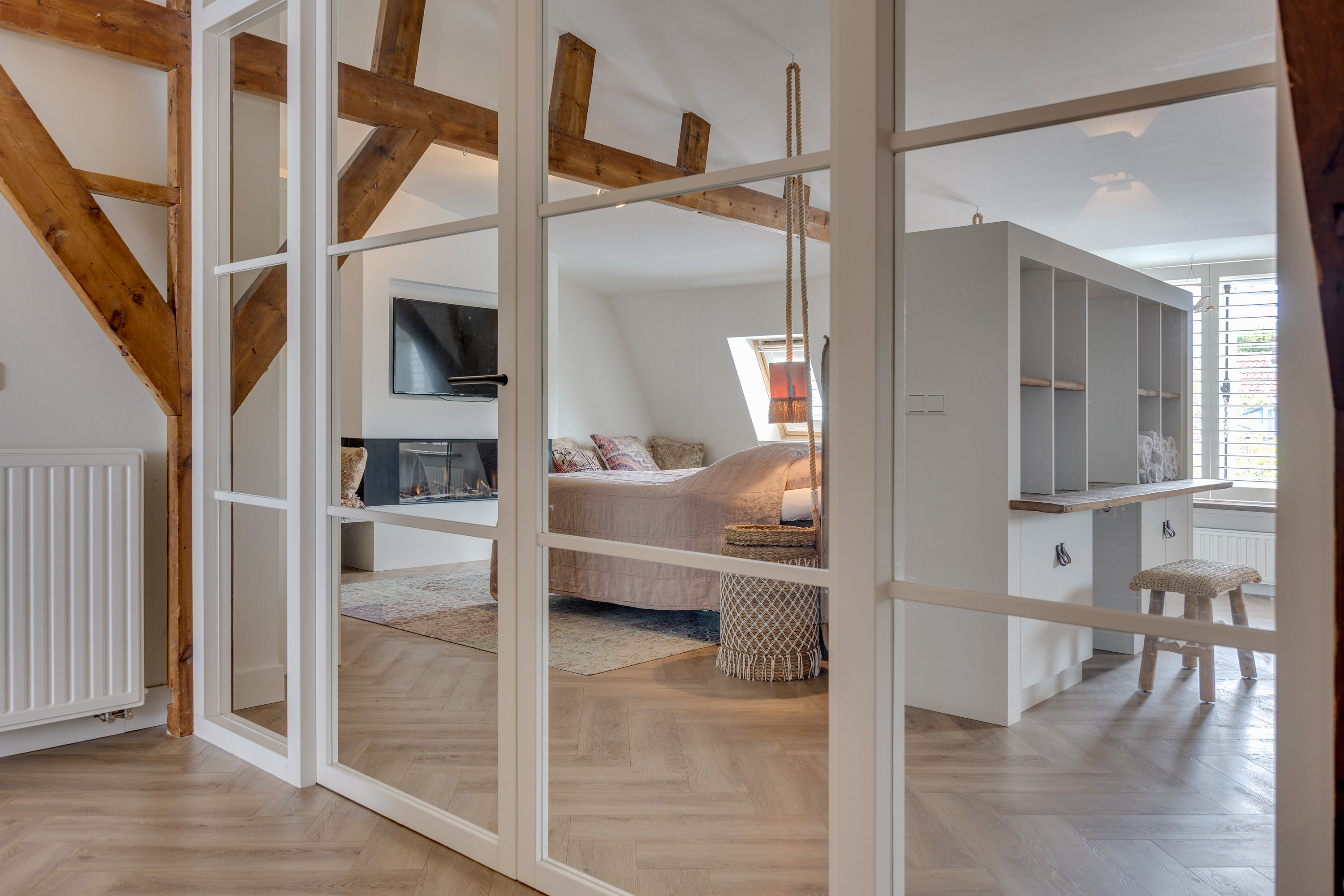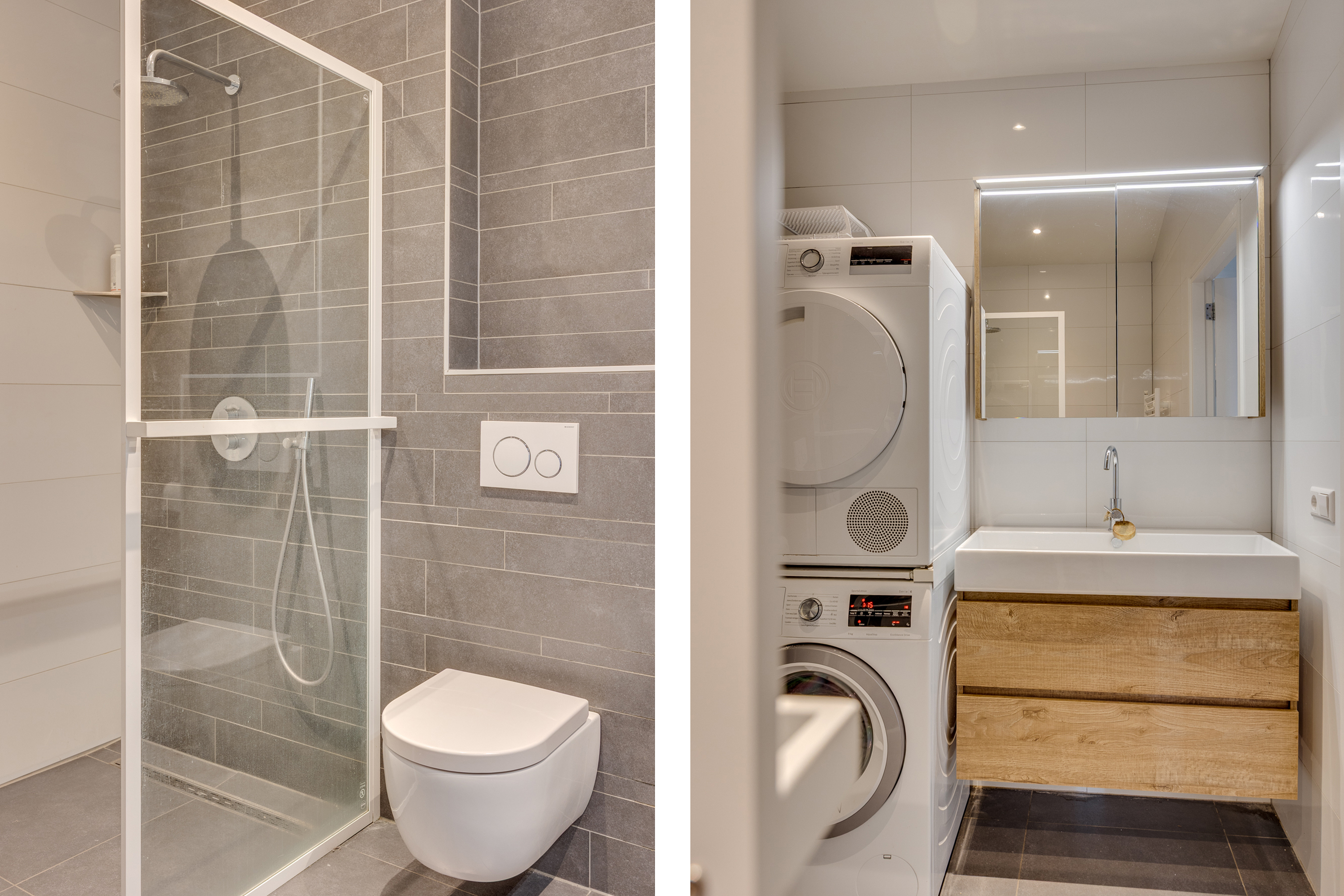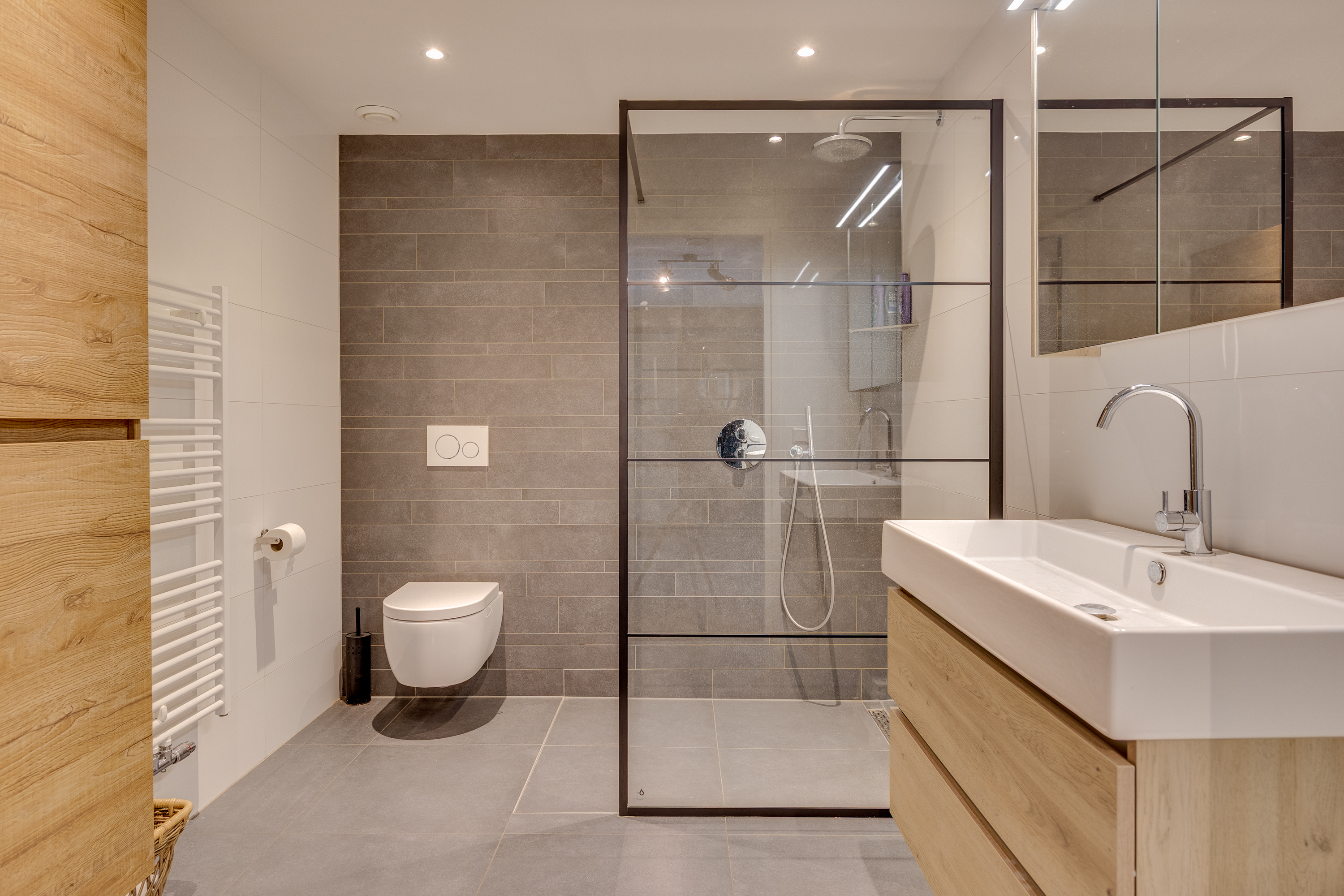 Daarnaast is er een tweede badkamer met inloopdouche, wastafelmeubel, toilet en ruimte voor wasmachine en droger. Een extra separaat toilet bevindt zich op de overloop. Authentieke houten balken zijn in het zicht gebleven en zorgen voor een sfeervol contrast met de moderne afwerking.