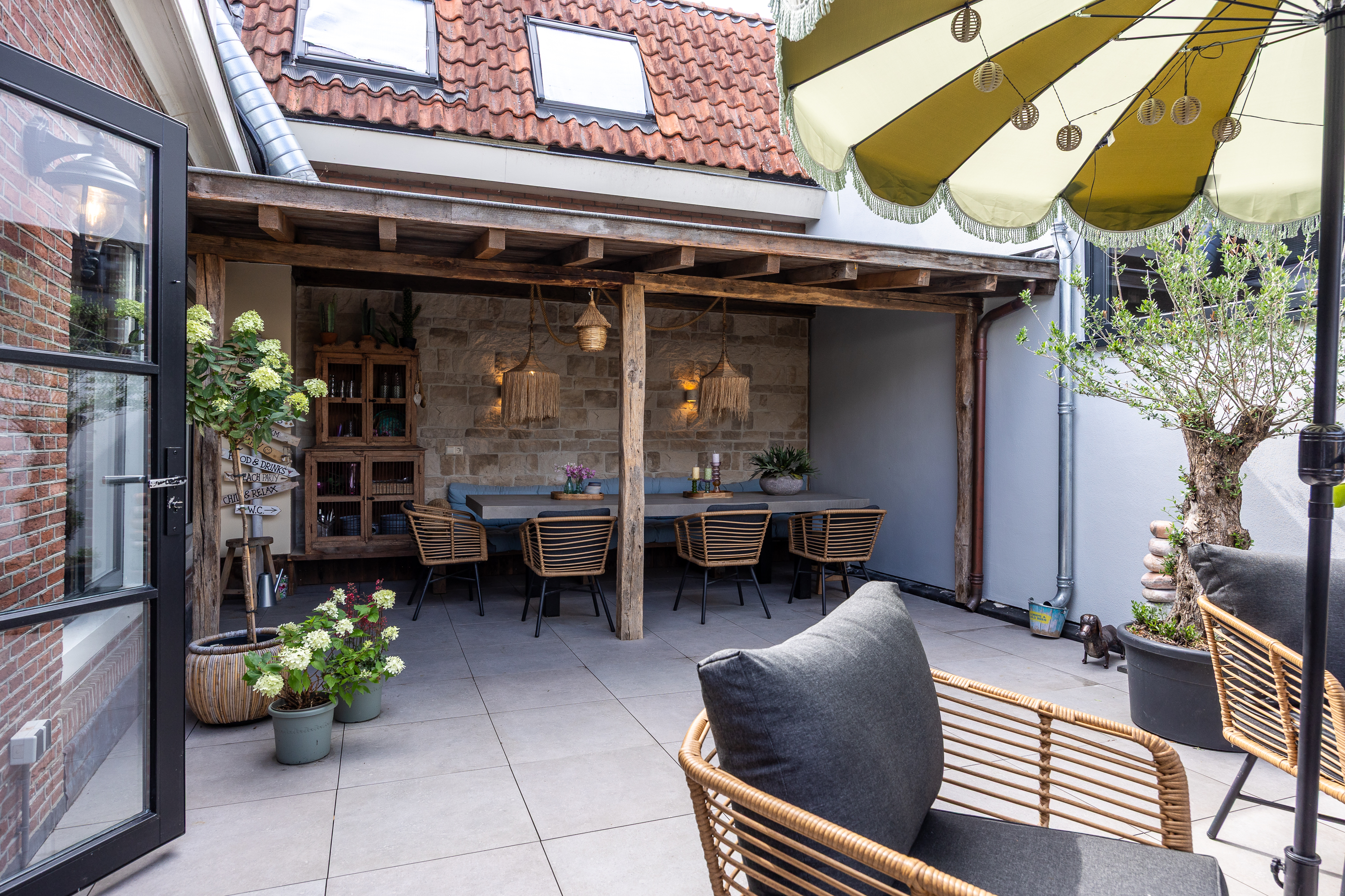 Via een tussenruimte, voorzien van inbouwkasten en plek voor een extra koelkast, stap je zó dakterras op. Dit ruime zonnige terras is volledig betegeld en voorzien van een sfeervolle overkapping, een vaste bank en op maat gemaakte tafel. Hier ervaar je volledige rust en privacy, midden in het centrum. Een heerlijk buitenverblijf, perfect voor diners, borrels of een kop koffie in de ochtendzon.