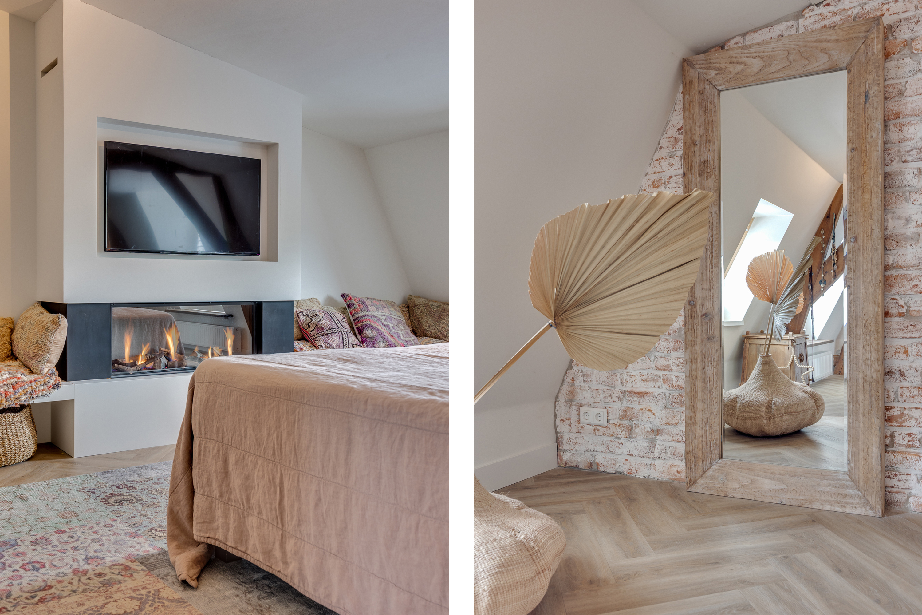 Tweede verdieping: Ook de bovenverdieping is bereikbaar via trap én lift. Hier bevinden zich drie ruime slaapkamers, alle voorzien van een hoogwaardige PVC-vloer en prachtig daglicht. De master bedroom is bijzonder royaal en ademt luxe: een en-suite badkamer met vrijstaand ligbad, ingebouwde televisie en elektrische haard in een nis, en knusse zitnissen aan weerszijden. De centrale roomdivider is praktisch én stijlvol, met aan de ene zijde ingebouwde kasten en make-up spiegel, en aan de andere zijde de mogelijkheid om een groot bed te plaatsen.