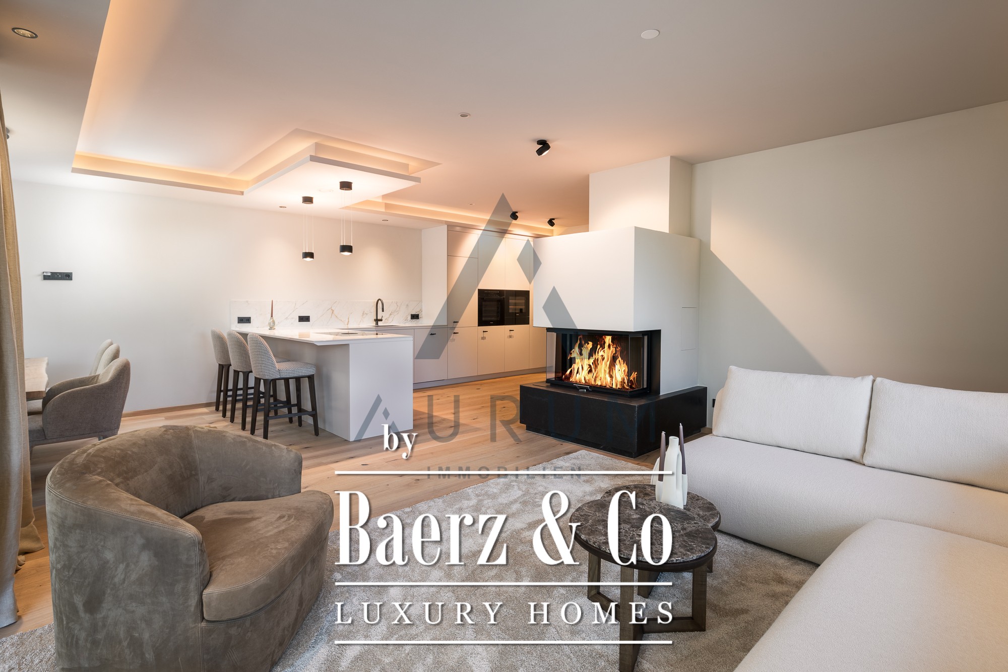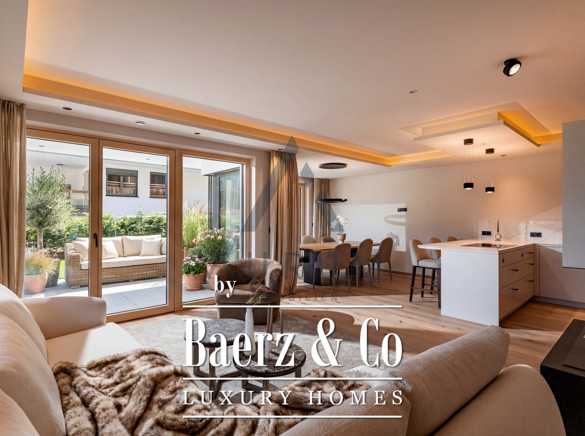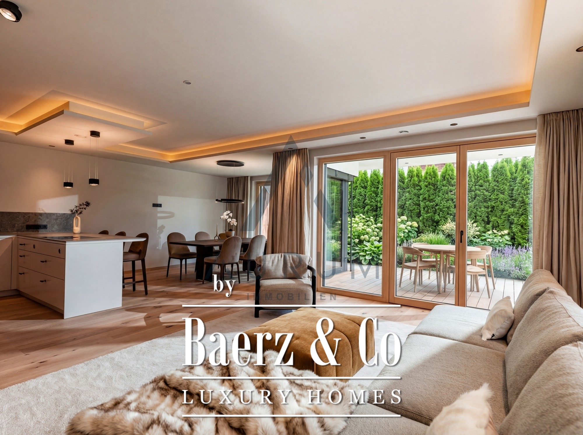 Binnen de 123 m² woonoppervlak harmoniëren twee slaapkamers en twee badkamers met royale leefruimtes en een sauna, waardoor een ruimtelijk gevoel ontstaat versterkt door natuurlijke materialen en zorgvuldige indeling. Vloerverwarming biedt het hele jaar door comfort; het Loxone BUS-systeem en elektrische zonwering zorgen voor hedendaagse efficiëntie. Een gastentoilet, stijlvolle lifttoegang en kelderberging dragen bij aan een vloeiende dagelijkse woonervaring.