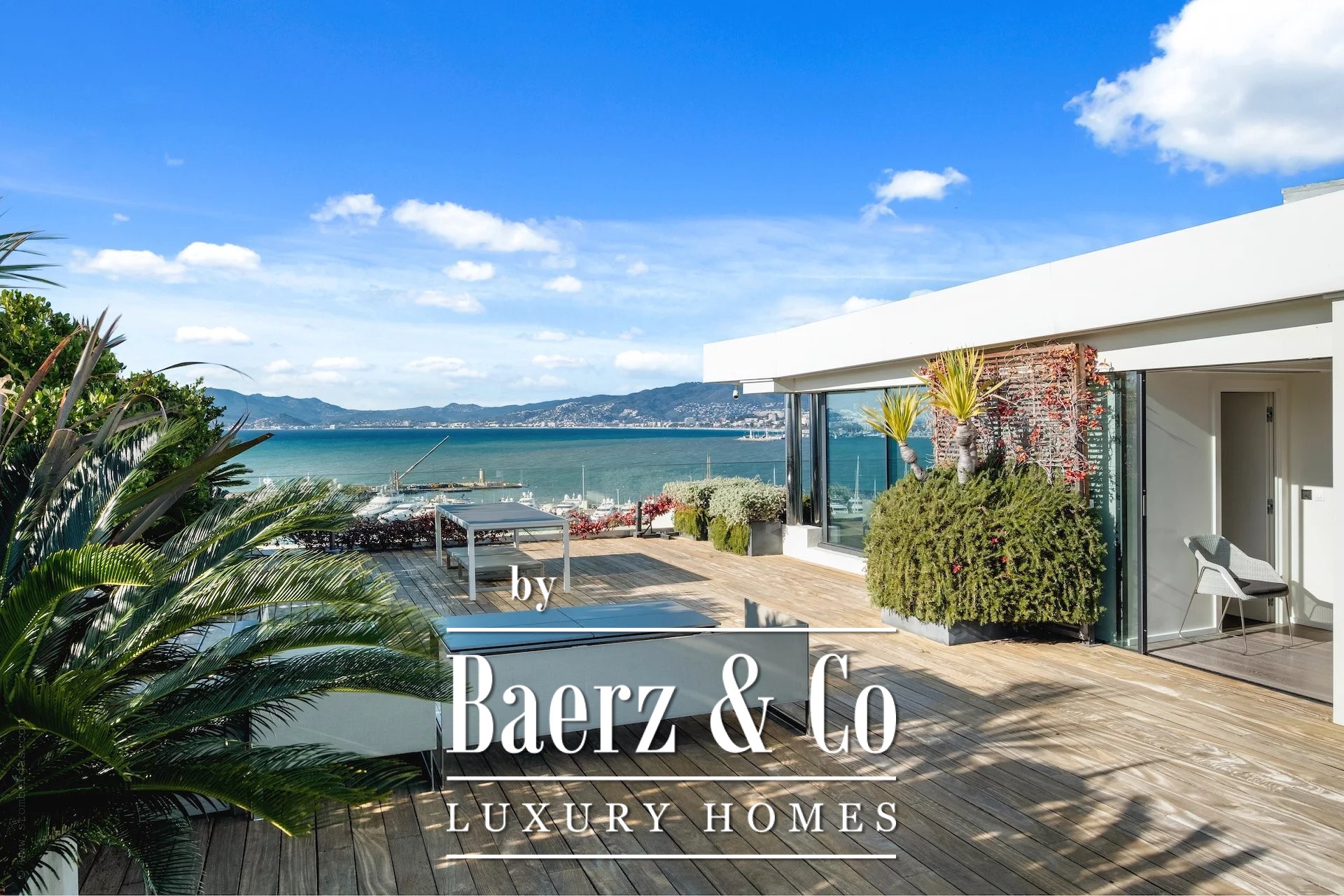 Dit penthouse in Cannes biedt een zeldzame combinatie van design en omvang, midden op La Croisette. Met een woonoppervlak van 580 m² verdeeld over twee niveaus, is de woning volledig gerenoveerd door Pellerin en vormt zij een eigentijds statement op een beveiligd en bewaakt adres. De entreeverdieping wordt gekenmerkt door een lichte woon- en eetruimte met een volledig uitgeruste keuken, vijf slaapkamers met eigen badkamer waarvan een imposante master suite, allen met panoramisch uitzicht op de baai van Cannes, de Middellandse Zee en het Esterel-gebergte.