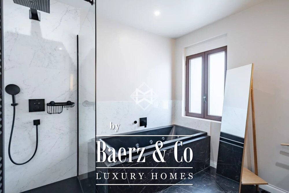Elke slaapkamer is zorgvuldig ingedeeld, met ruimte voor rust, privacy en een eigen badkamer, terwijl de zolder is getransformeerd tot een extra slaapkamer en douchekamer. Privévertrekken op de begane grond, discreet opbergmogelijkheden en een garage vergroten het comfort en de beslotenheid. Airconditioning, dubbele beglazing, elektrische rolluiken en slimme voorzieningen verhogen het dagelijks gemak.