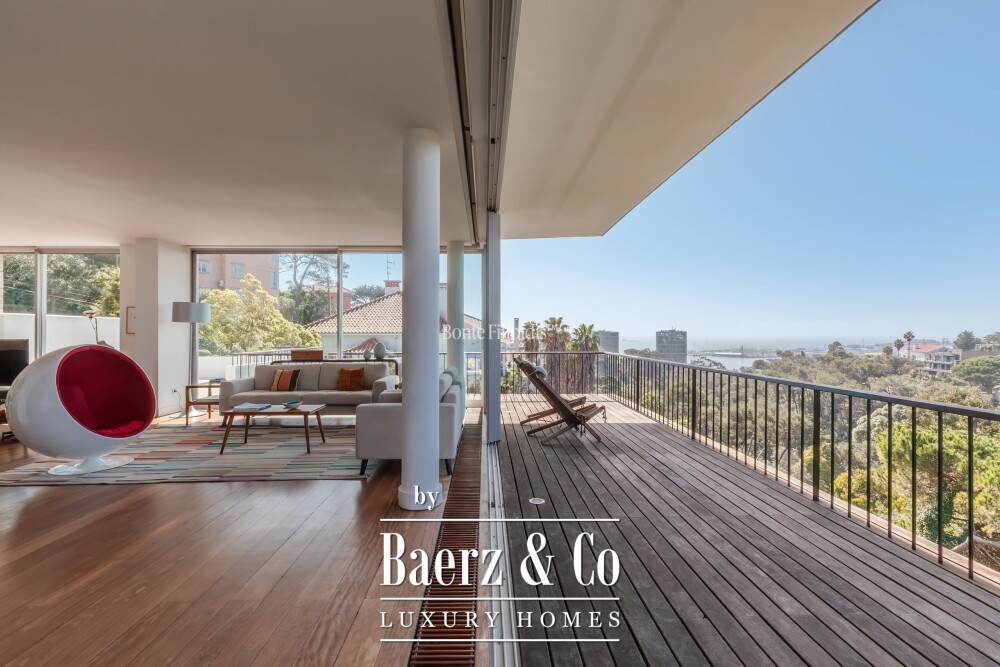 Villa Monte Estoril Cascais e Estoril is rustig gepositioneerd boven Parque Palmela en biedt een weids uitzicht over de baai van Cascais, wat bewoners een zeldzaam perspectief geeft binnen deze vooraanstaande kustwijk. Het perceel beslaat 1.610 m² en omvat 801 m² elegant ontworpen leefruimte, verdeeld over vier niveaus die met elkaar verbonden zijn door een lift. Grote ruimtes en kamerhoge ramen laten overvloedig daglicht toe en omlijsten het wijdse uitzicht over het park en de Atlantische Oceaan.
