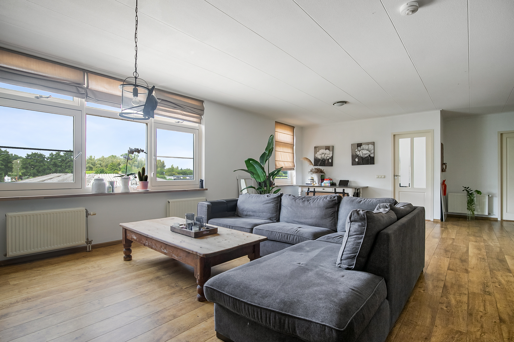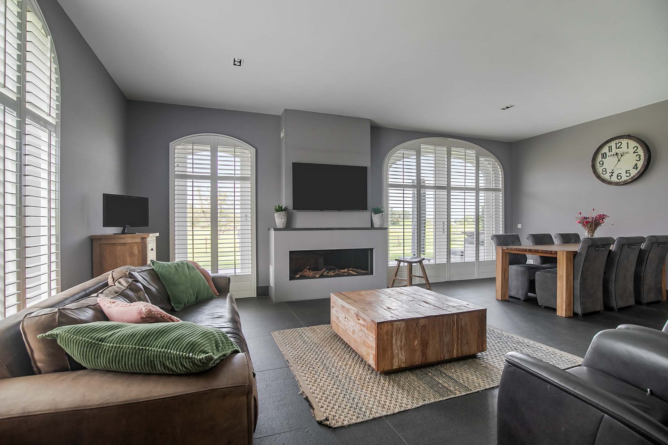 - De raampartijen in het achterhuis zijn voorzien van sfeervolle shutters.