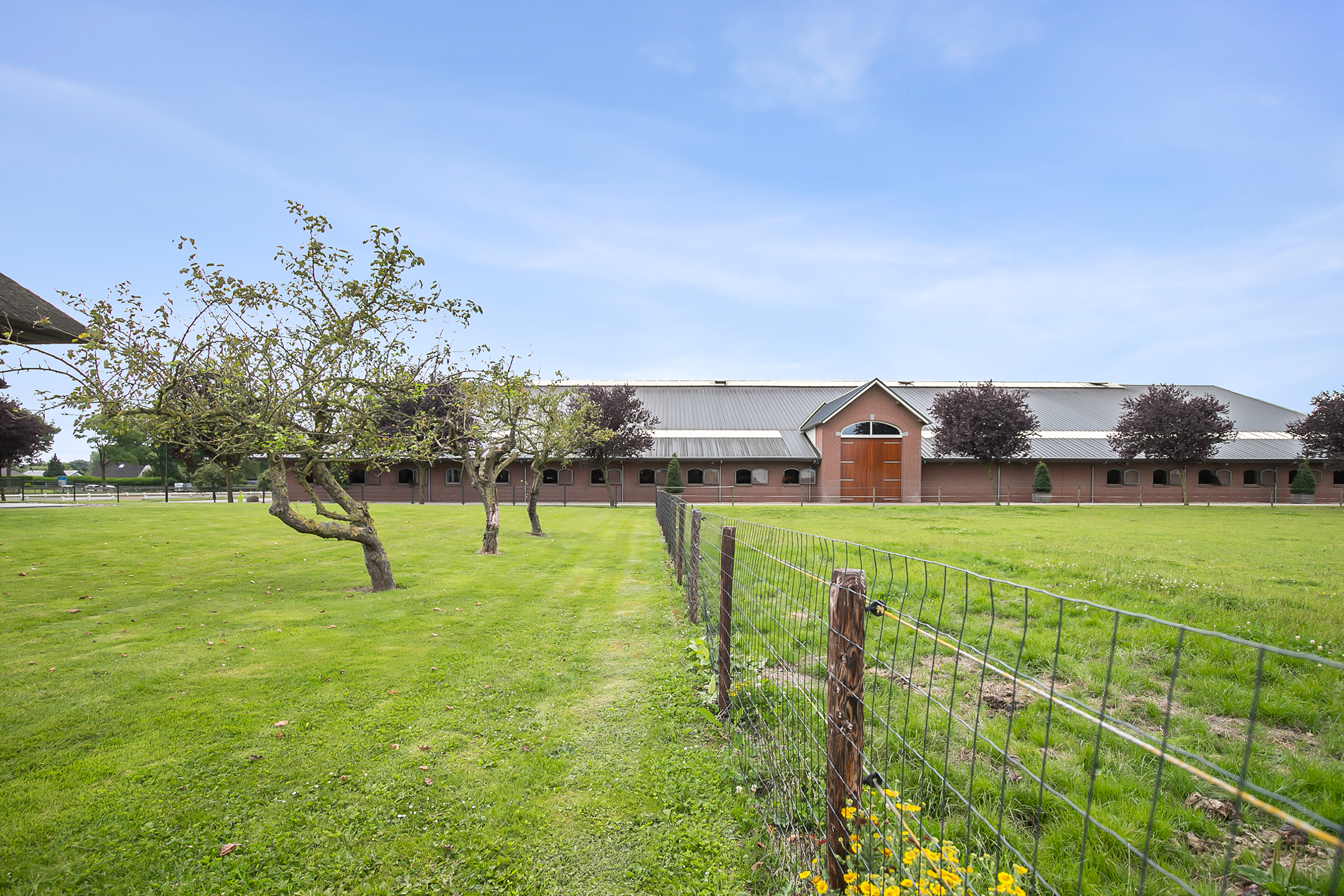 Het bijbehorende weiland is aan de achterzijde van het complex gelegen en is omheind met houten palen en lint.