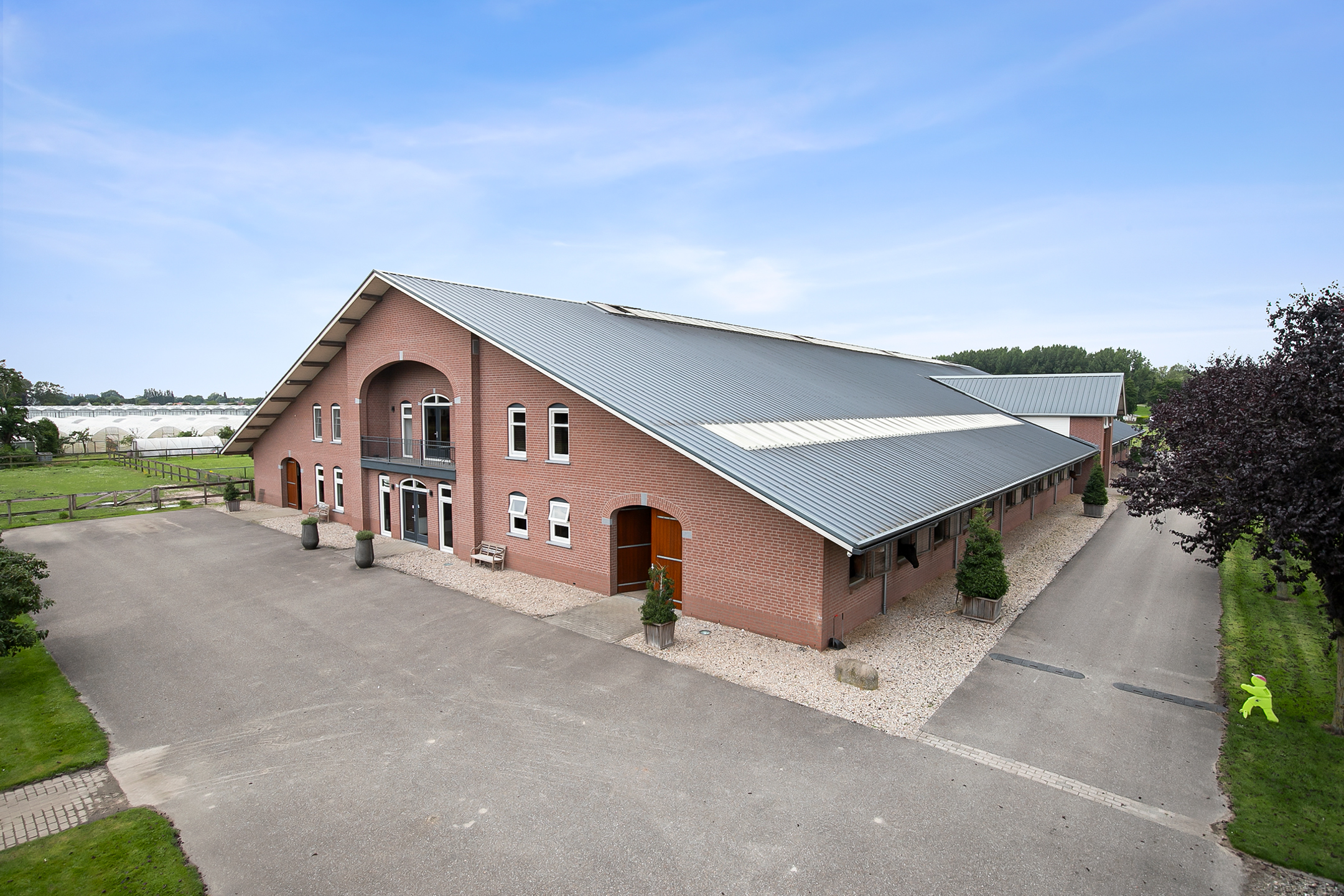 De goed onderhouden hippische accommodatie bestaat uit een vrijstaande rijhal met een binnenpiste (ca. 21x61 mtr.), een paardenstal met een ontvangstgedeelte en in totaal 39 paardenboxen verdeeld over 2 gangen en een vrijstaande veldschuur. Het erf is verder ingericht met een buitenpiste, overdekte stapmolen, een longeercirkel, diverse paddocks en een mestvaalt. Er is voldoende parkeergelegenheid aanwezig voor het stallen van o.a. trailers en vrachtwagens.