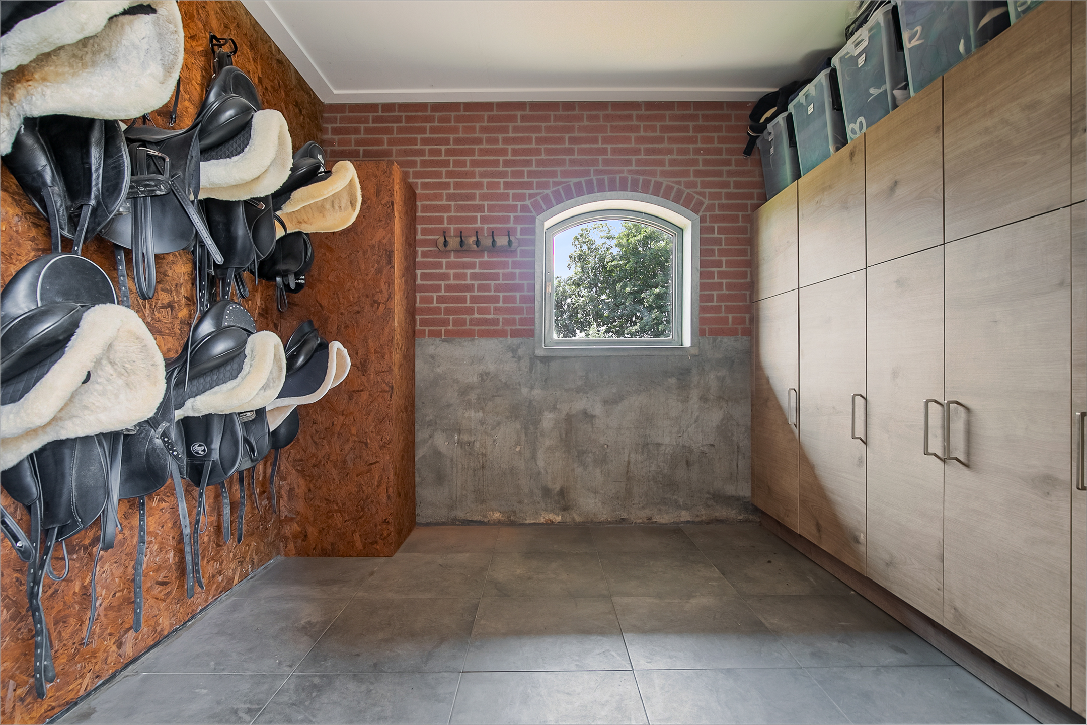 De hal aan de voorzijde van de rijhal is voorzien van een beklinkerde vloer en biedt toegang tot een berging, toiletruimtes, wasruimte en een winkelruimte. Een bordestrap biedt toegang tot de 1e verdieping. Hier is de ontvangstruimte en een appartement gesitueerd. De ontvangstruimte is voorzien van een tegelvloer, stucwerk wanden en een systeemplafond. Er is een keukenblok en een bar aanwezig. Openslaande deuren bieden toegang tot een balkon aan de voorzijde van de rijhal. Grote raampartijen bieden een fraai uitzicht op de binnenpiste en de stallen. Ook is er vanuit de ontvangstruimte toegang tot een balkon boven de binnenpiste.Het appartement is uitgerust met een woonkamer met open keuken, 2 slaapkamers en een ruime badkamer. Het appartement is voorzien van een tegelvloer. Het keukenblok beschikt over een spoelbak, inductiekookplaat, vaatwasser, koelkast en een combimagnetron. De badkamer is geheel betegeld en verder voorzien van een doucheruimte, wastafel met meubel en een zwevend toilet. Achter een praktische schuifwand is een wasruimte gesitueerd. De binnenpiste (ca. 21x61 mtr.) is voorzien van een professionele bodem (Ben Agterberg), een fraaie hardhouten bakrand. Gewelfde houten spanten zorgen voor extra sfeer. Een lichtstraat in de nok zorgt voor fraai natuurlijke lichtinval. Ook is er LED-verlichting aanwezig. De 39 paardenboxen zijn verdeeld over twee stallengangen. De boxen zijn voorzien van deels hardhouten / deels gegalvaniseerde voorwanden en metselwerk tussen- en achterwanden. De deuren van de boxen zijn draaibaar. De boxen zijn tevens uitgerust met een buitenluik. Iedere stallengang beschikt over eigen faciliteiten zoals wasplaatsen en een zadelkamer. Tussen de gangen zijn nog drie ruime loopstallen gesitueerd. De wasplaatsen zijn voorzien van een warm- en koud watervoorziening. Ook is er een plaats voor de hoefsmid en fysio aanwezig. Aan de achterzijde is nog een appartement gesitueerd. Middels een bordestrap aan de buitenzijde is er toegang. Hier is tevens een balkon gesitueerd. Het appartement beschikt over een ruime woonkamer met open keuken, 3 slaapkamers, een ruime badkamer, een bijkeuken, wasruimte en een toiletruimte.Aan de achterzijde van het perceel is een vrijstaande veldschuur gesitueerd. De schuur is opgetrokken uit metselwerk plinten met damwand gevels en het geisoleerde dak is met sandwichpanelen gedekt. Aan de voorzijde is de veldschuur voorzien van windbreekgaas. In de schuur is een voersilo aanwezig. Er zijn momenteel 14 paardenboxen en een longeercirkel gesitueerd, maar uiteraard is deze schuur geheel naar wens ook uitermate geschikt voor diverse andere doeleinden.