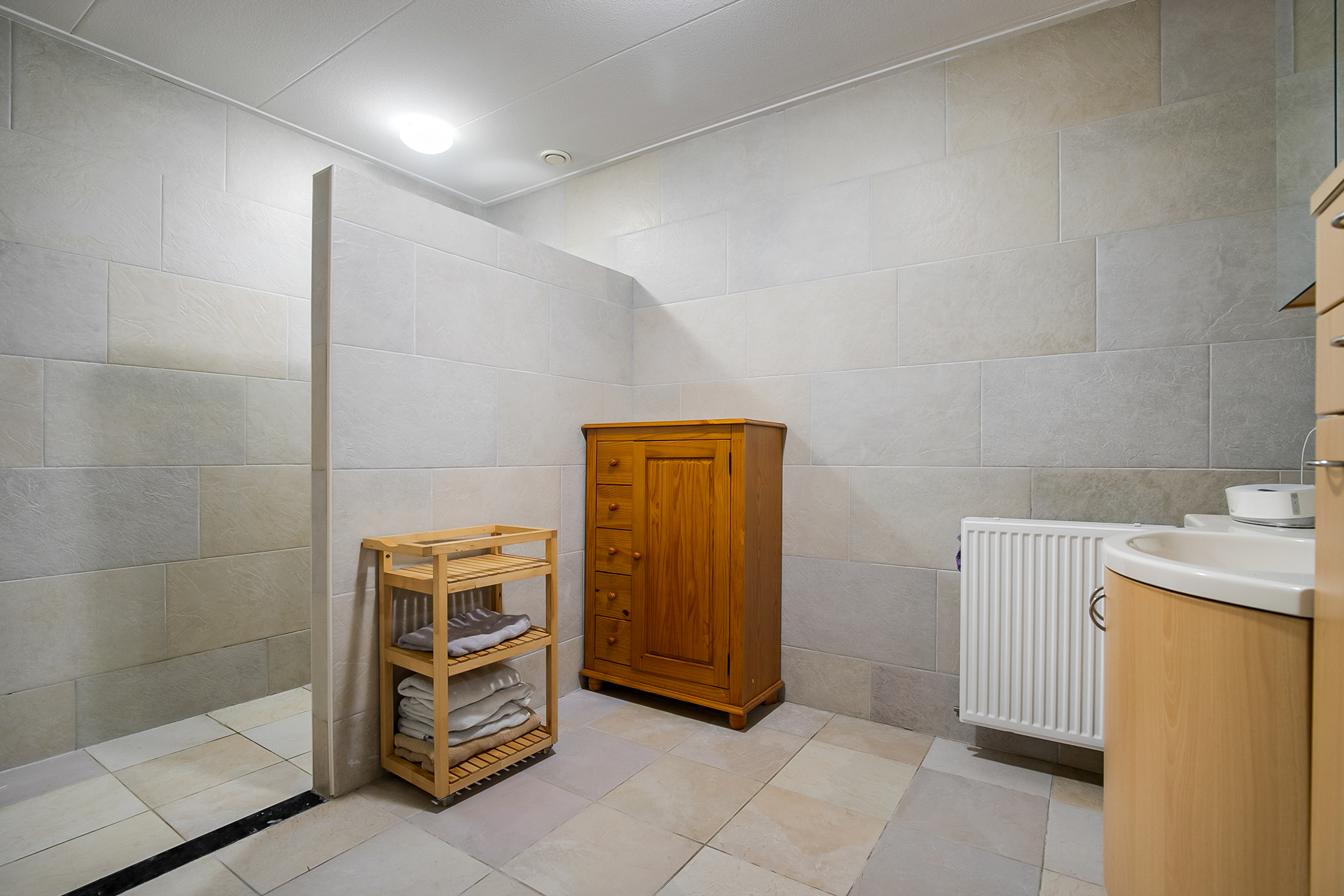 Vanuit de woonkamer is er toegang tot de logeerkamer. Deze slaapkamer is voorzien van een natuurstenen vloer, stucwerk wanden en een stucwerk plafond met inbouwverlichting. Vanuit deze kamer is er toegang tot de badkamer. Deze badkamer is afgewerkt met dezelfde natuurstenen vloer als in de rest van de ruimtes. De wanden en het plafond zijn voorzien van stucwerk. De badkamer is verder uitgerust met een ruime inloopdouche met sunshower, twee wastafels met meubel een zwevend toilet en een design radiator. Een raampartij zorgt voor natuurlijk lichtinval. Vanuit de badkamer loop je verder naar de masterbedroom.