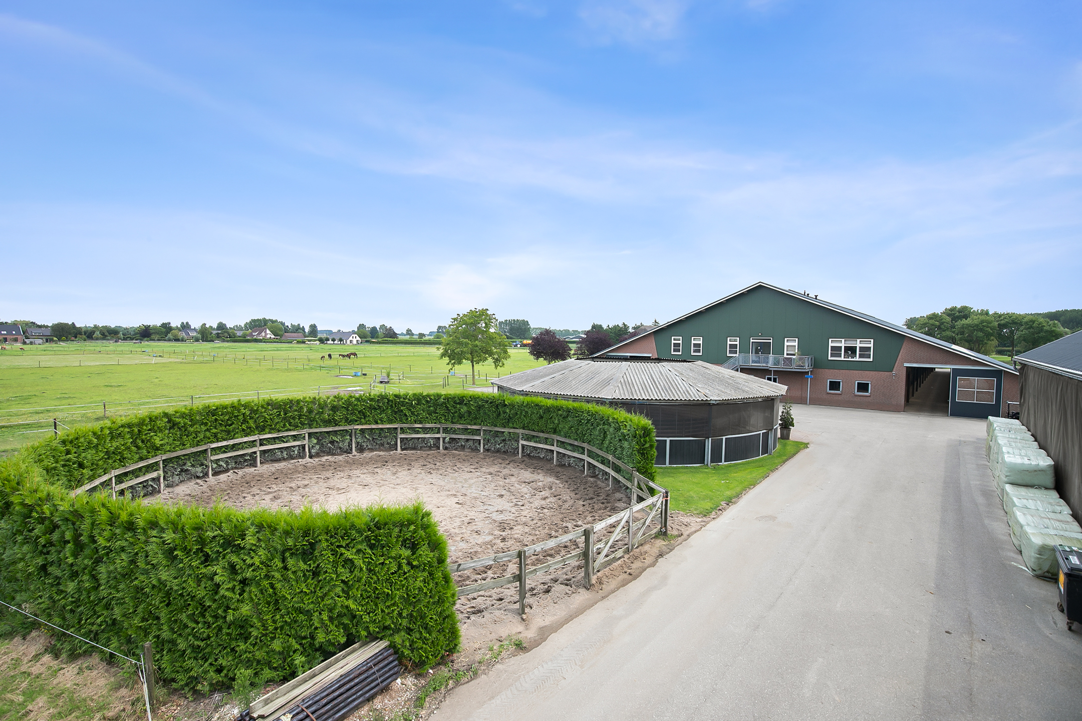De naastgelegen longeercirkel is voorzien van een houten omheining. De bodem is voorzien van zand. Een coniferen haag zorgt voor een fraaie groene omheining.