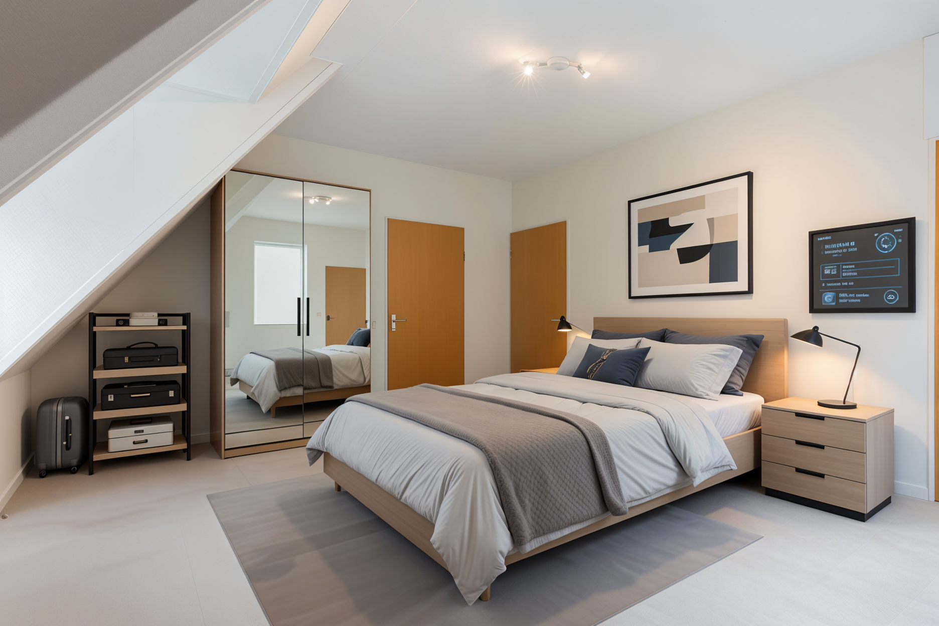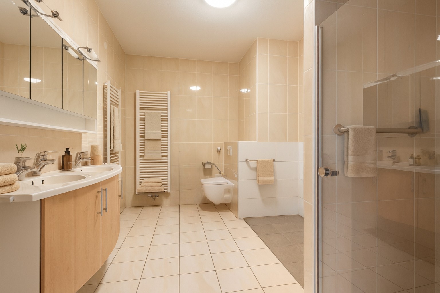 De hoofdslaapkamer beschikt over maatwerk garderobekasten, dubbele deuren naar het balkon en een luxe en-suite badkamer. Deze royale ruimte heeft een inloopdouche en een tweede douche met antislipvloer, ideaal voor minder valide bewoners. Ook is er een dubbel wastafelmeubel en een wandcloset aanwezig.