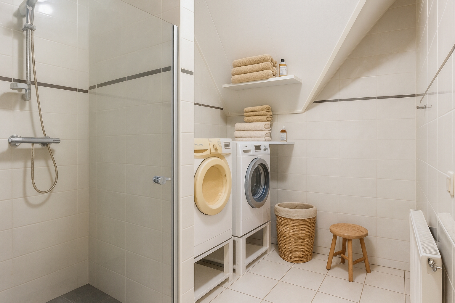 Aangrenzend bevindt zich de bijkeuken met een uitstortgootsteen, aansluitingen voor was apparatuur, opstelling van de HR-combiketel en extra bergruimte