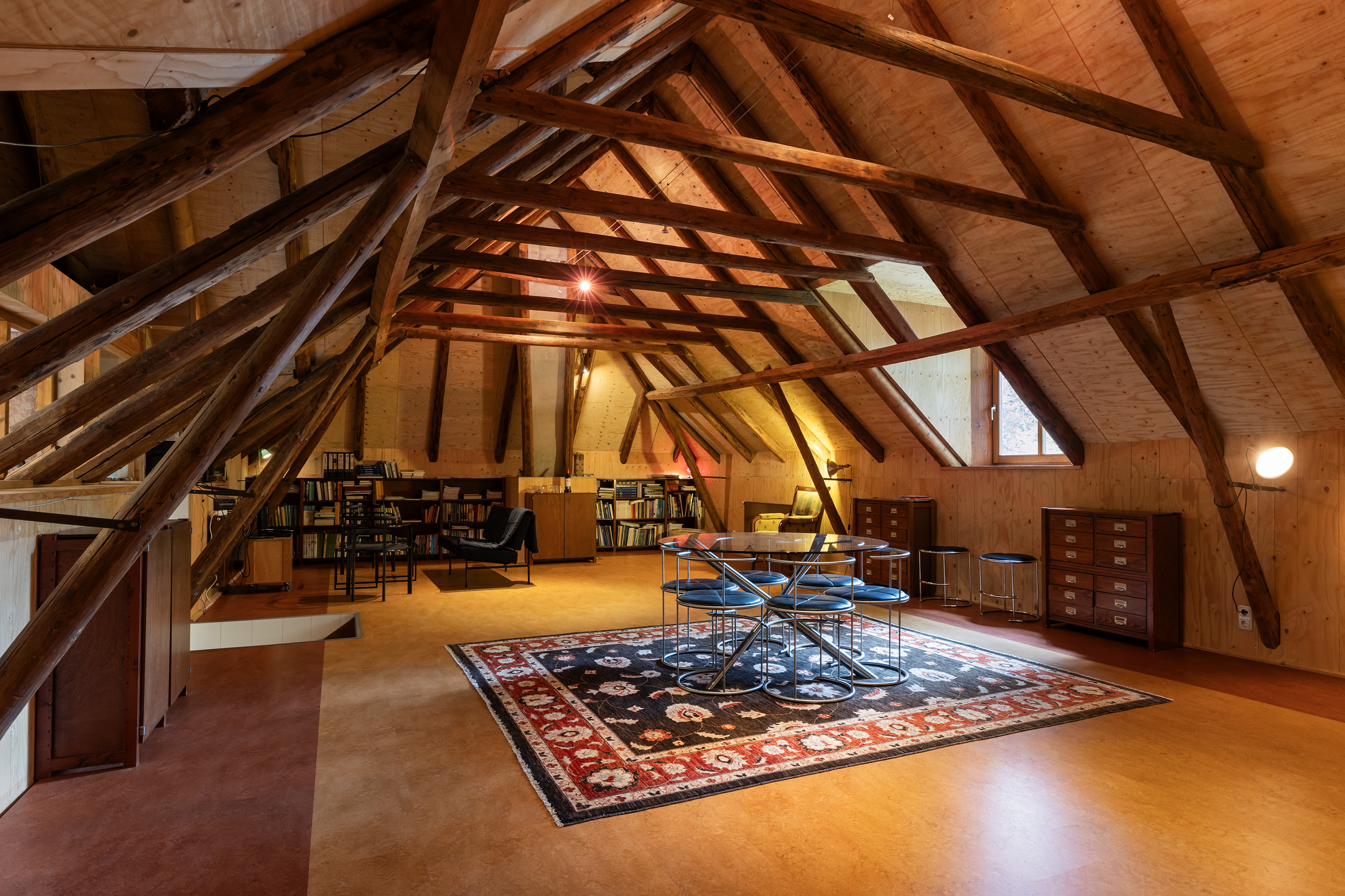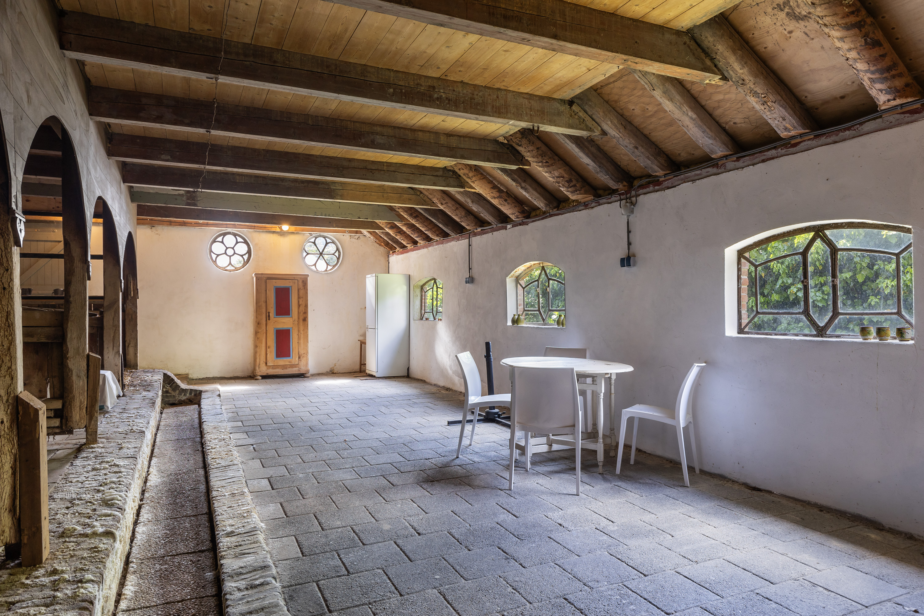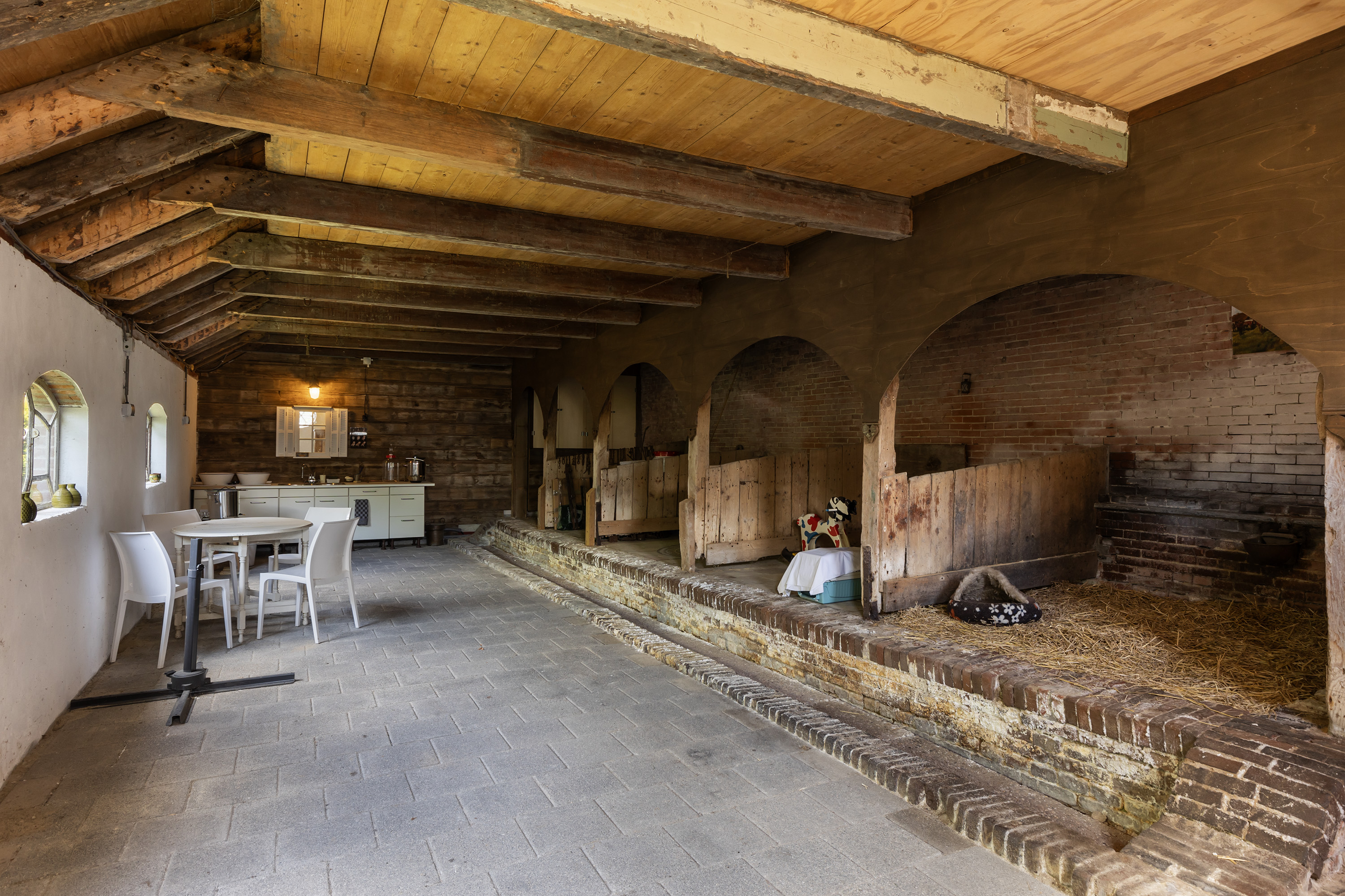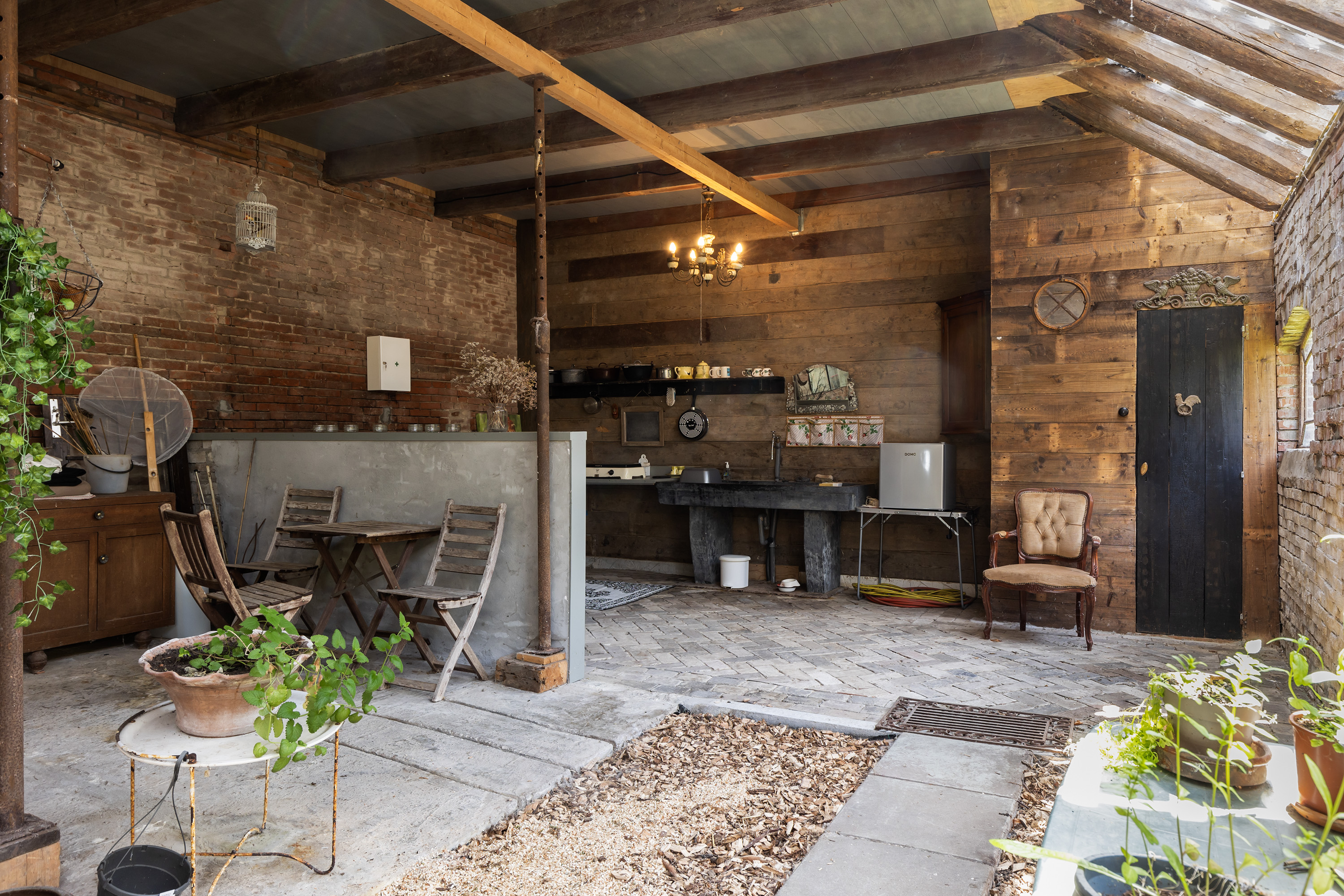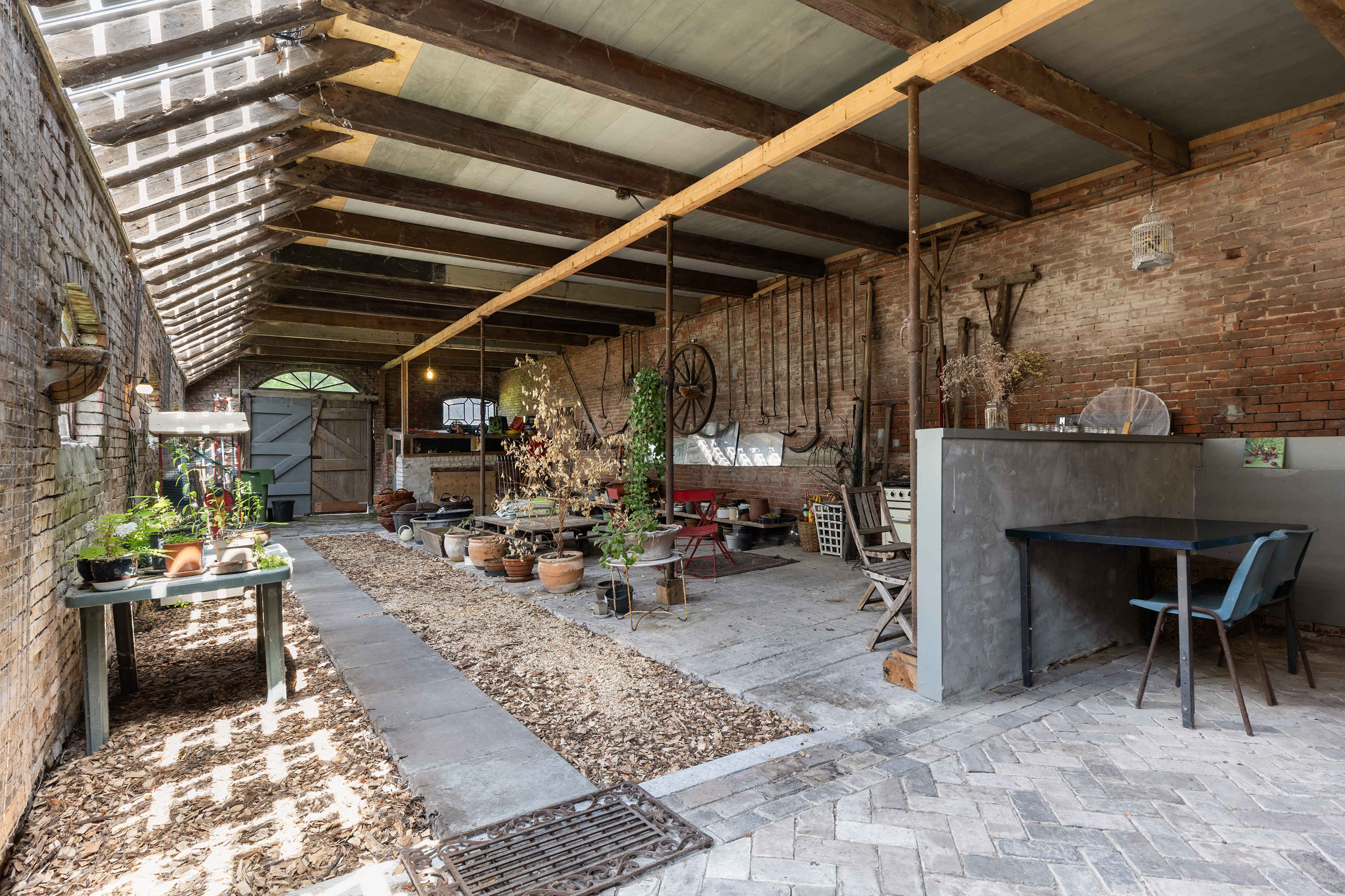 Het oorspronkelijke achterhuis is getransformeerd tot een multifunctionele ruimte met robuuste bakstenen muren en zichtbare houten balken. Lichtdoorlatende dakpanelen zorgen voor aangename daglichtinval. De ruimte doet momenteel dienst als atelier en ontvangstruimte, met baropstelling, zinken werkbladen en een gezellige zithoek, geschikt voor workshops, exposities of kleinschalige evenementen. Vanuit hier is er toegang tot het erf en de achtergelegen schuur.