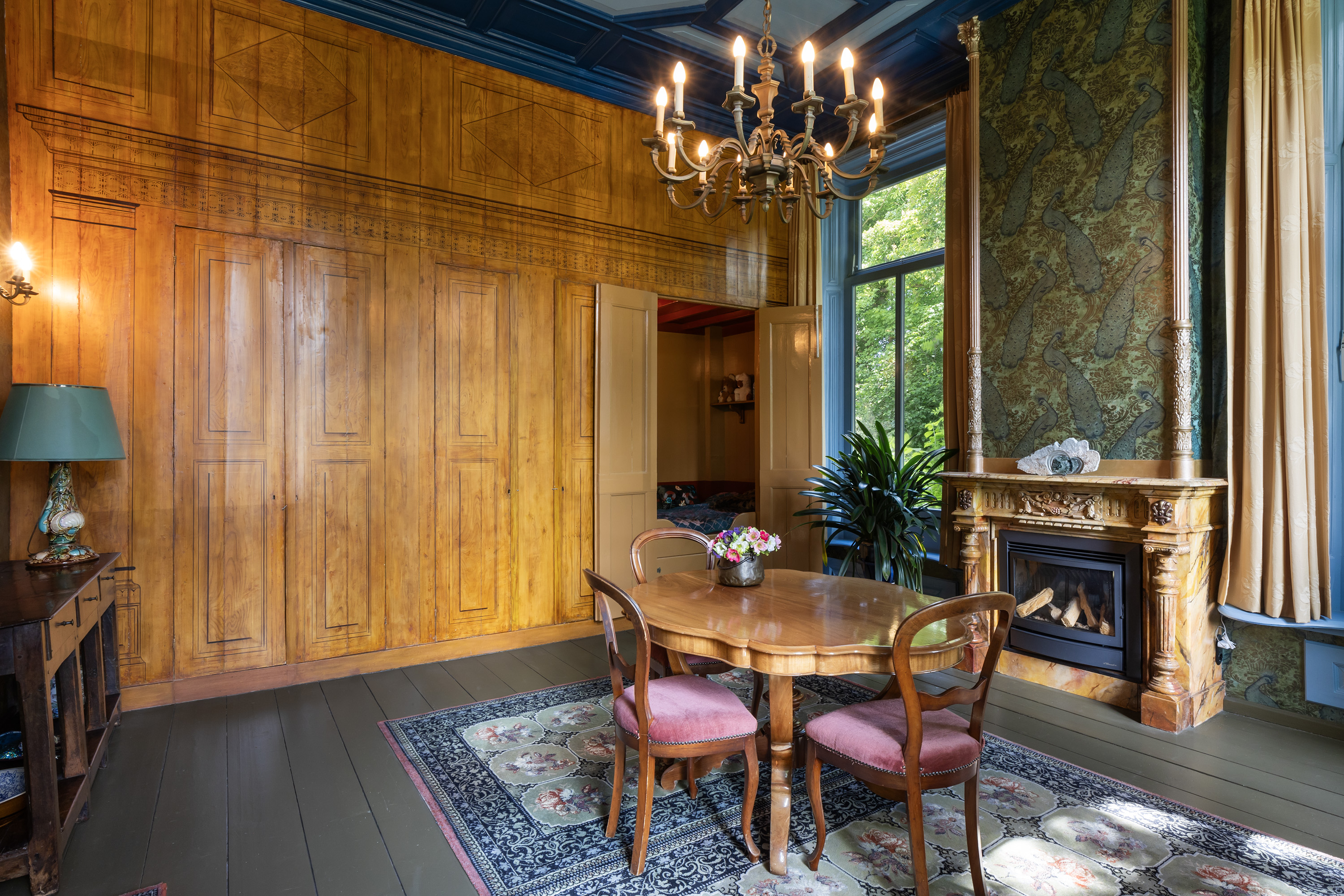 De eetkamer is een indrukwekkende ruimte met diepe ramen aan twee zijden, een monumentale schouw met stijlvol behang en een in blauwtinten geverfe plafond met sierlijsten. In de trompe-l'oeil wand zijn een bedstede en 3 kasten fraai geïntegreerd. Deze ruimte is ideaal als formele eetkamer of bibliotheek.
