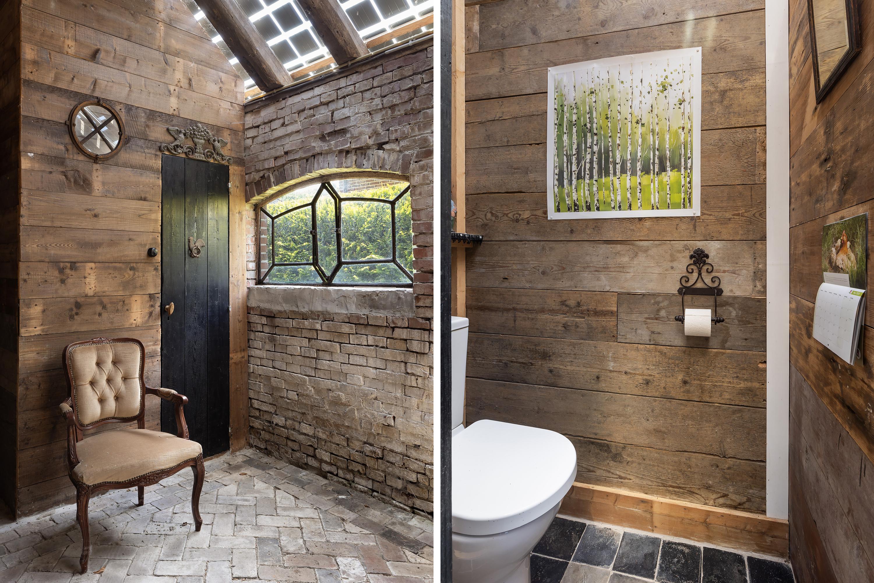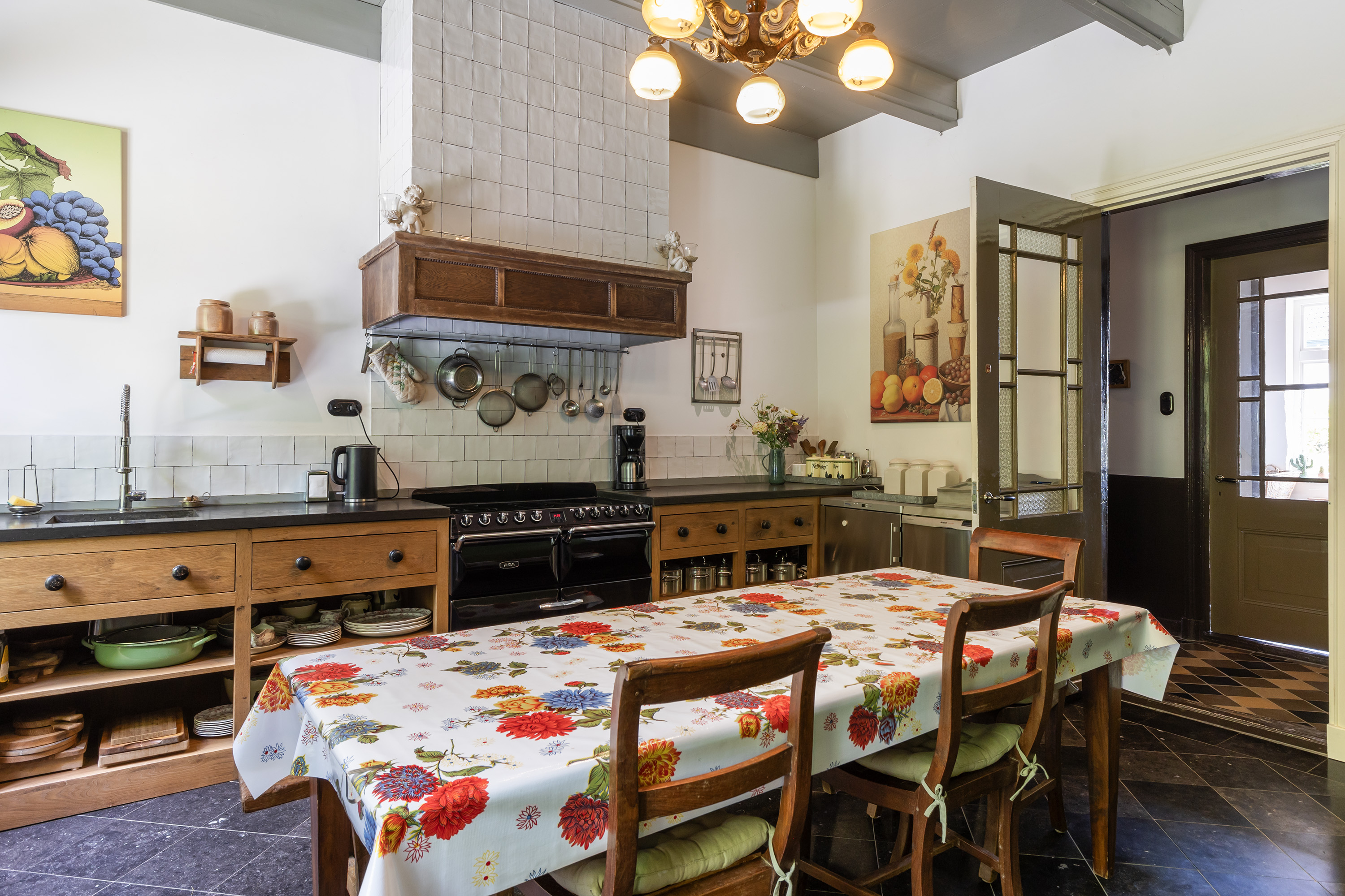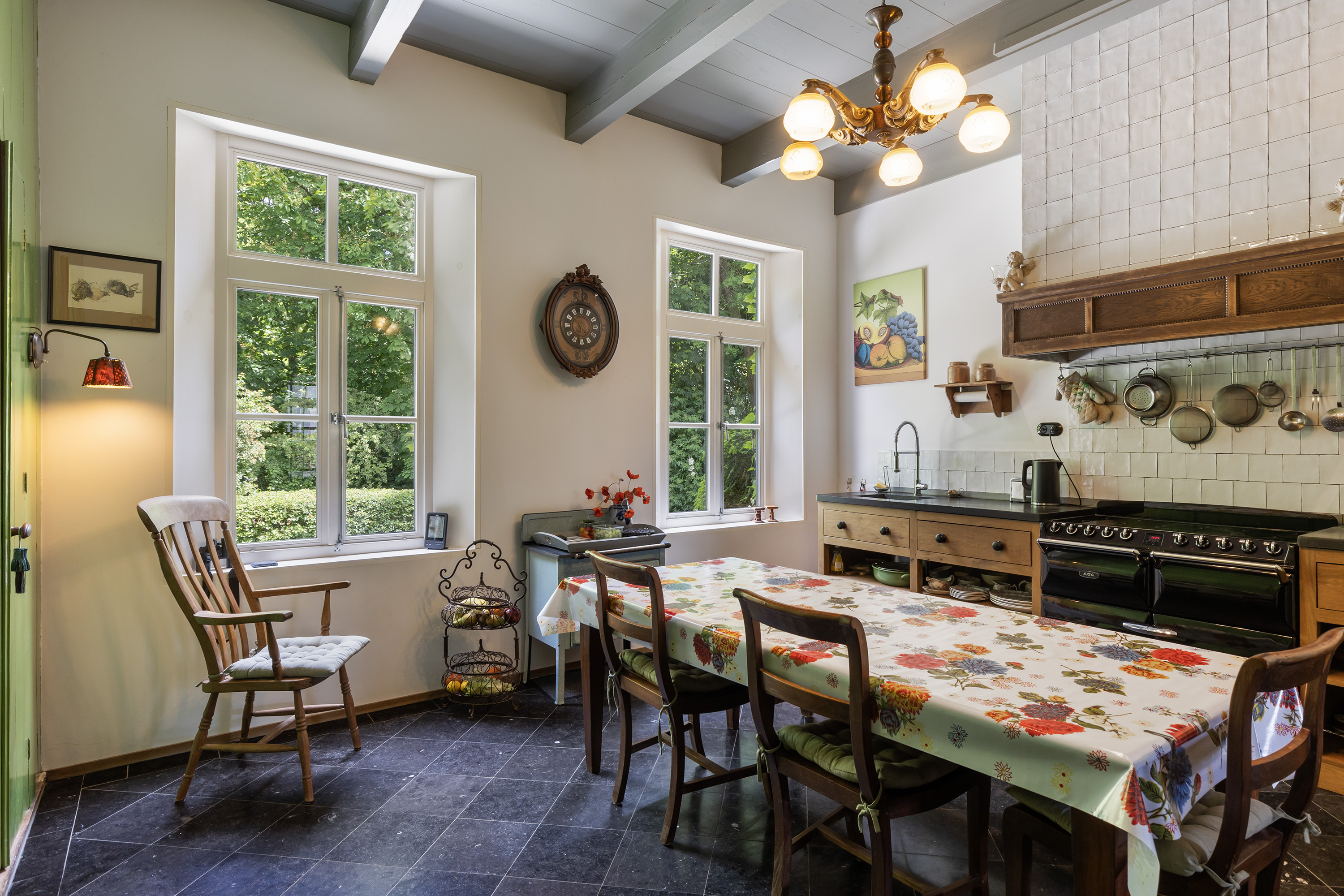 De woonkeuken sluit naadloos aan op de stijl van de woning en is ingericht met een zwart natuurstenen vloer, landelijke houten kasten, een AGA fornuis met halogeen kookplaten, elektrische grill en ovens en een betegelde schouw. Dankzij de dubbele ramen is er veel lichtinval en zicht op het groen. De keuken maakt deel uit van het lager gelegen oudste middendeel van de woning.