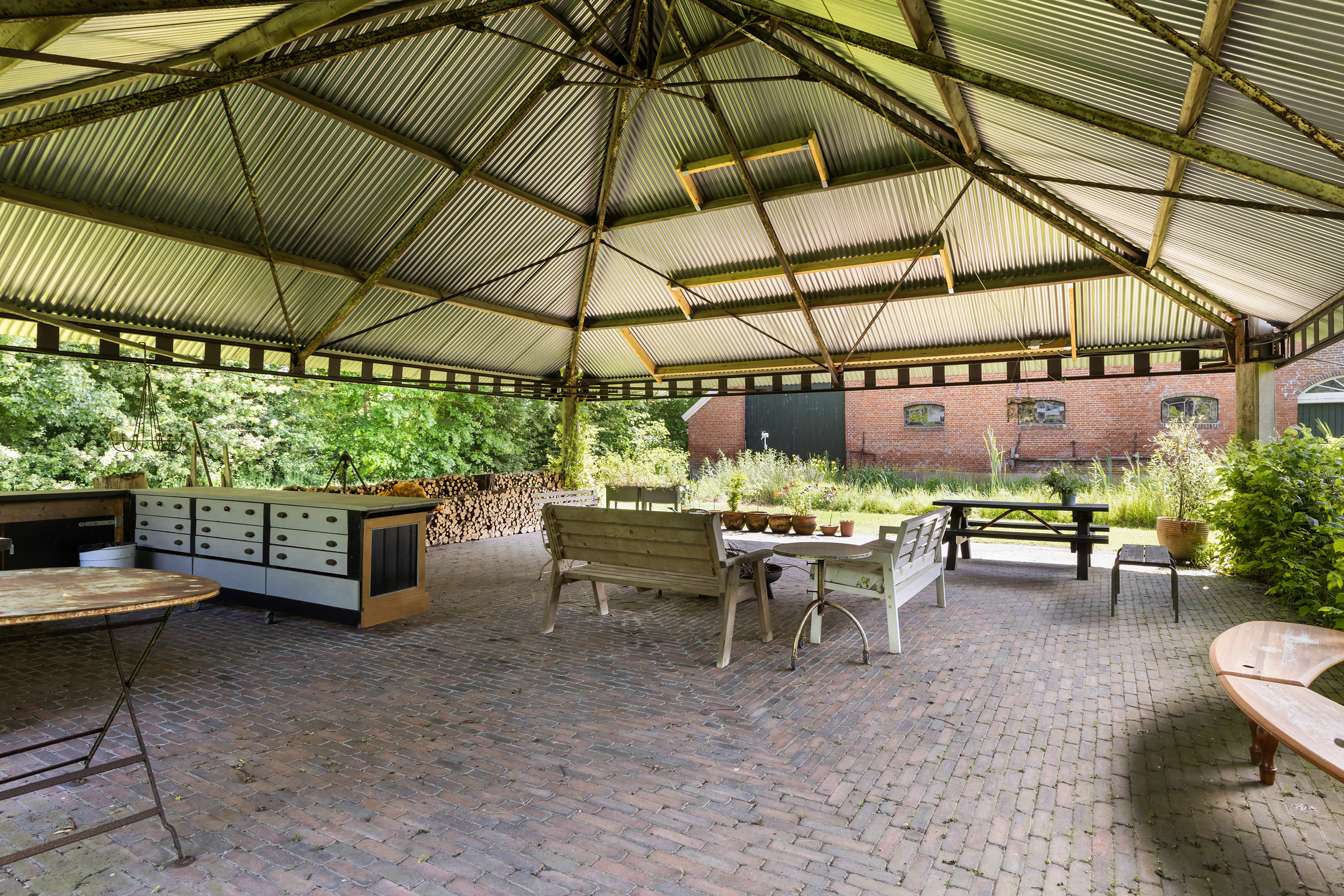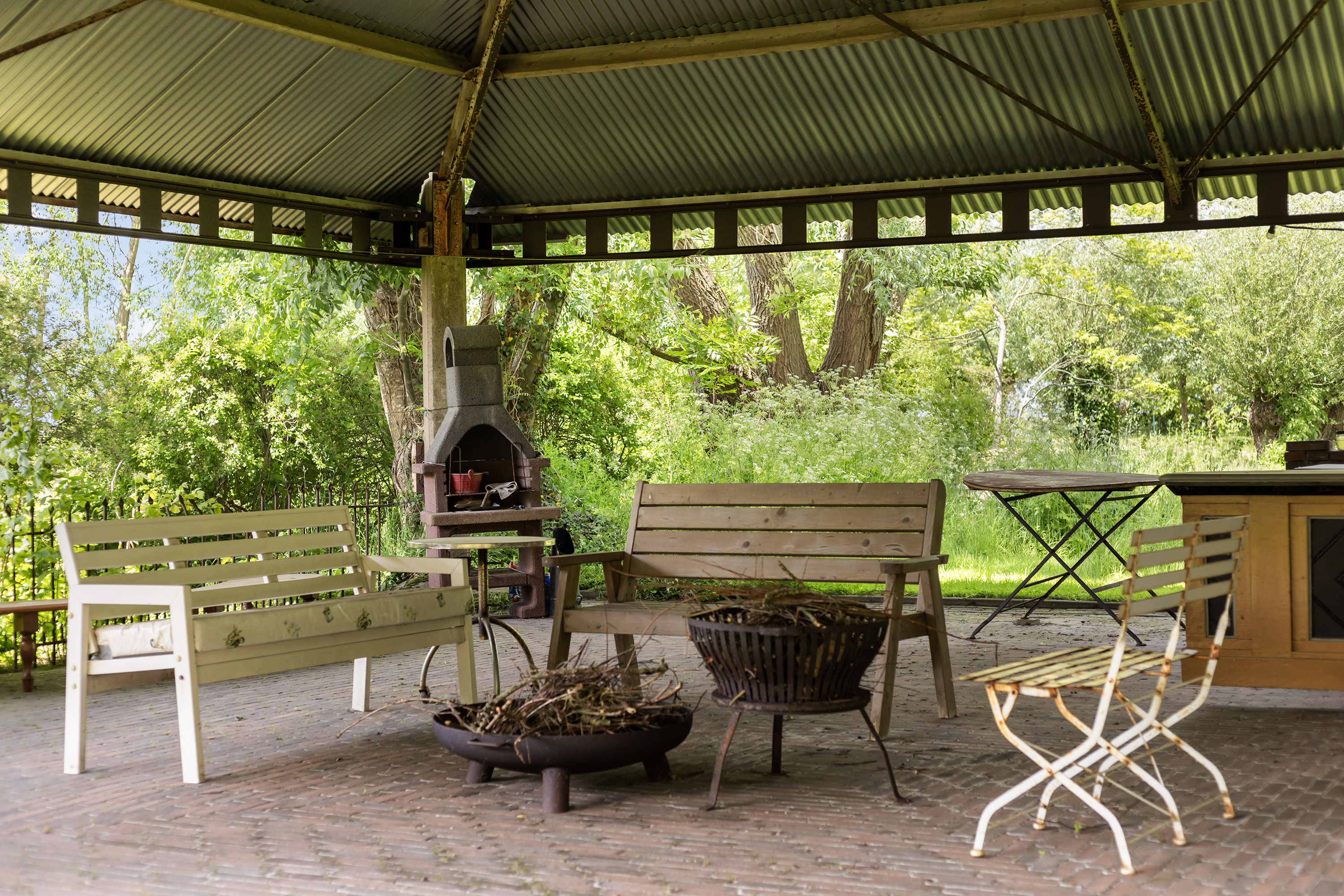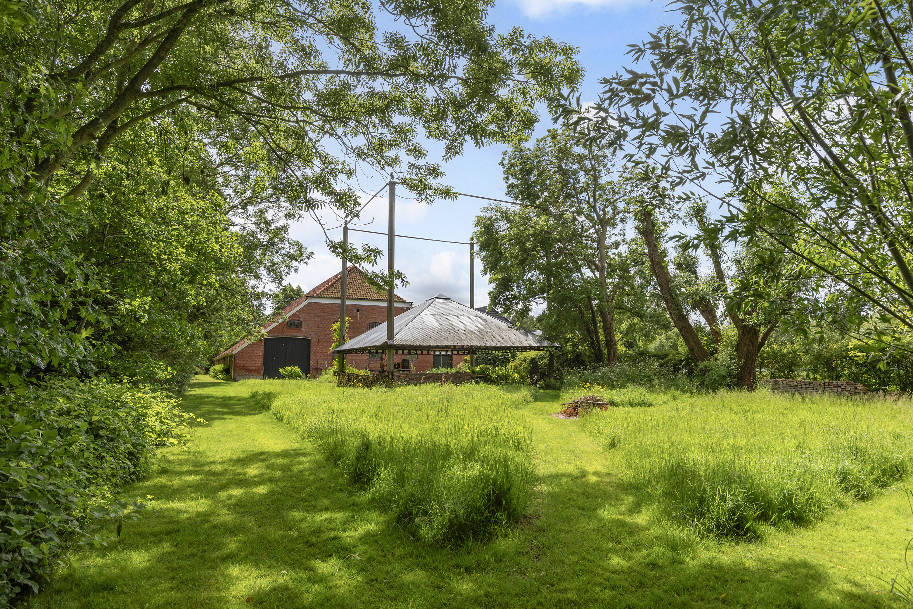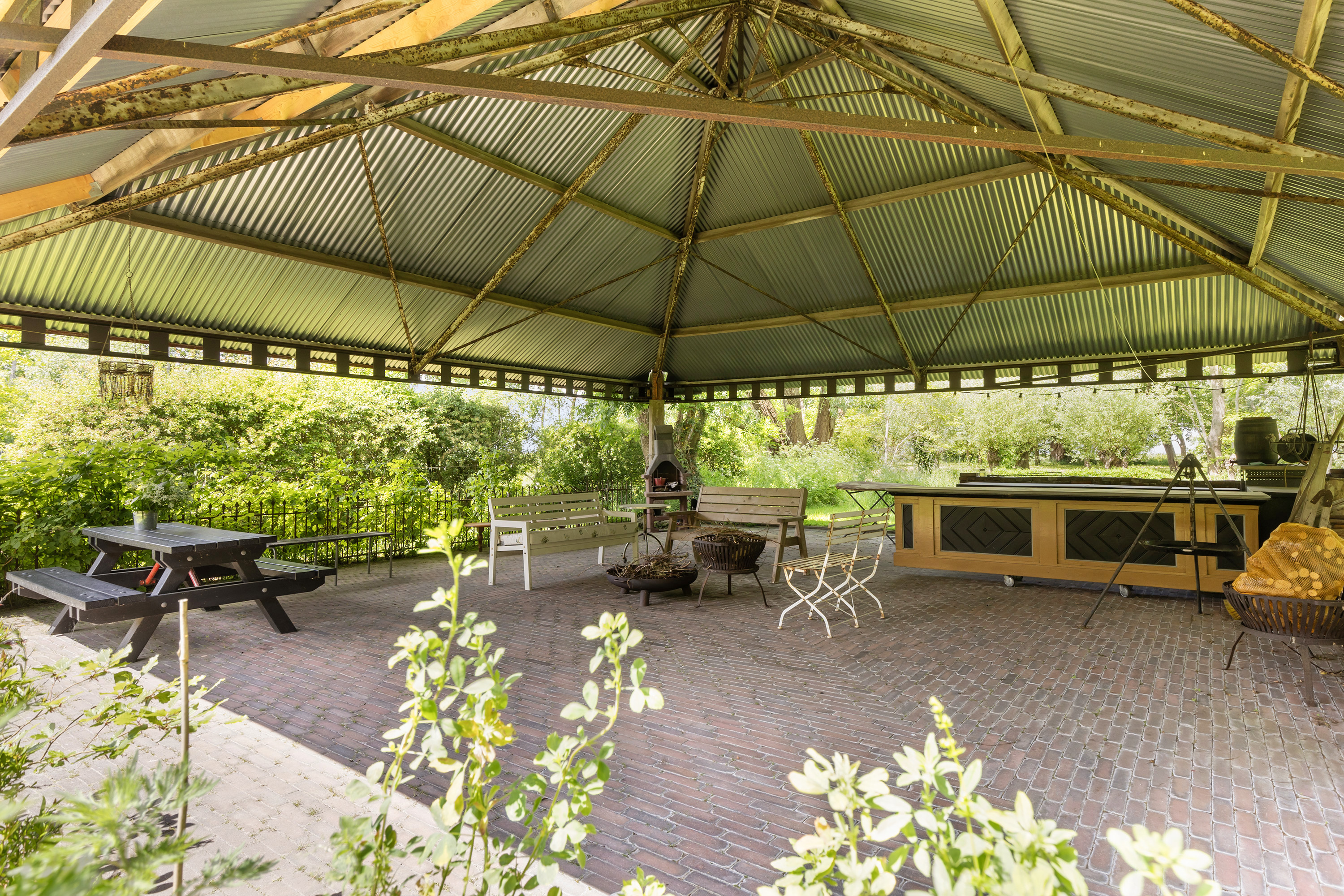 Achter de woning staat een fraaie open hooibergconstructie met een gegalvaniseerd dak, waaronder een buitenkeuken, vuurplaats, bar en meerdere zitjes zijn ingericht. Deze sfeervolle plek biedt beschutting tegen zon en regen en vormt een volwaardige buitenkamer waar het heerlijk toeven is. De tuin is diep, weelderig en toch vrij, omsloten door volwassen bomen die privacy bieden zonder het uitzicht te ontnemen. Een glazen theehuisje, tuinhuis en diverse zon- en schaduwterrassen maken de buitenbeleving compleet. Binnen- en buitenleven vloeien moeiteloos in elkaar over.