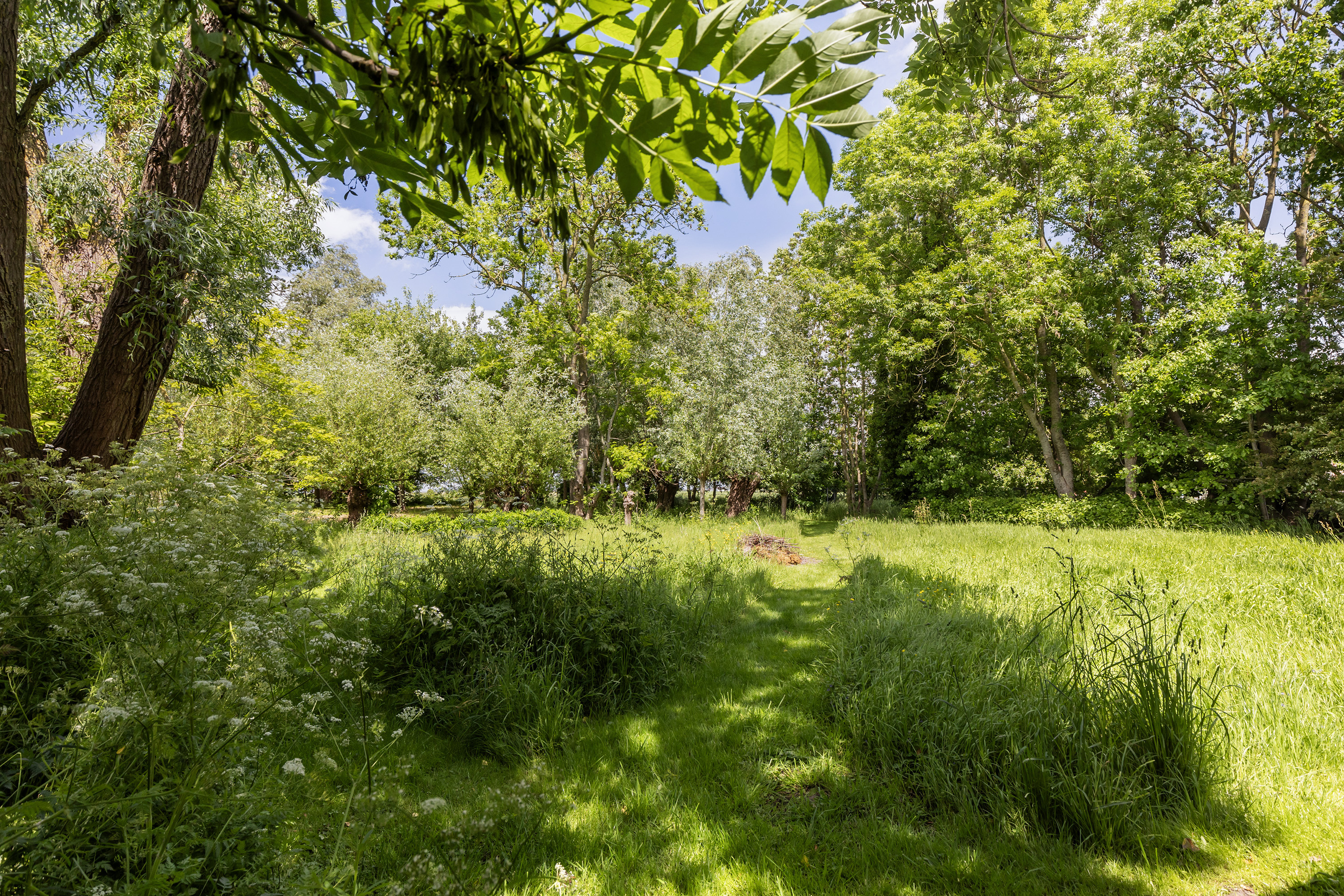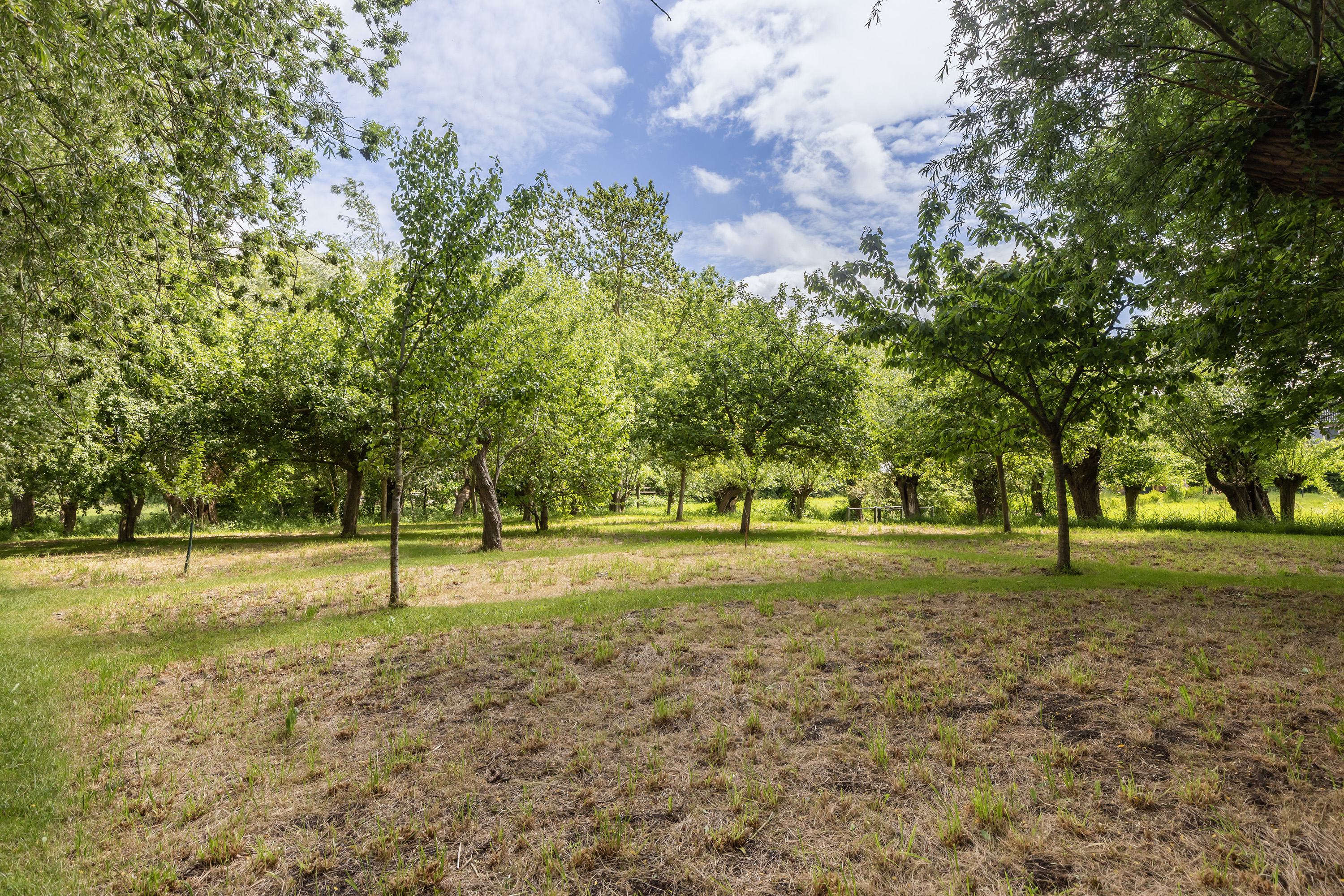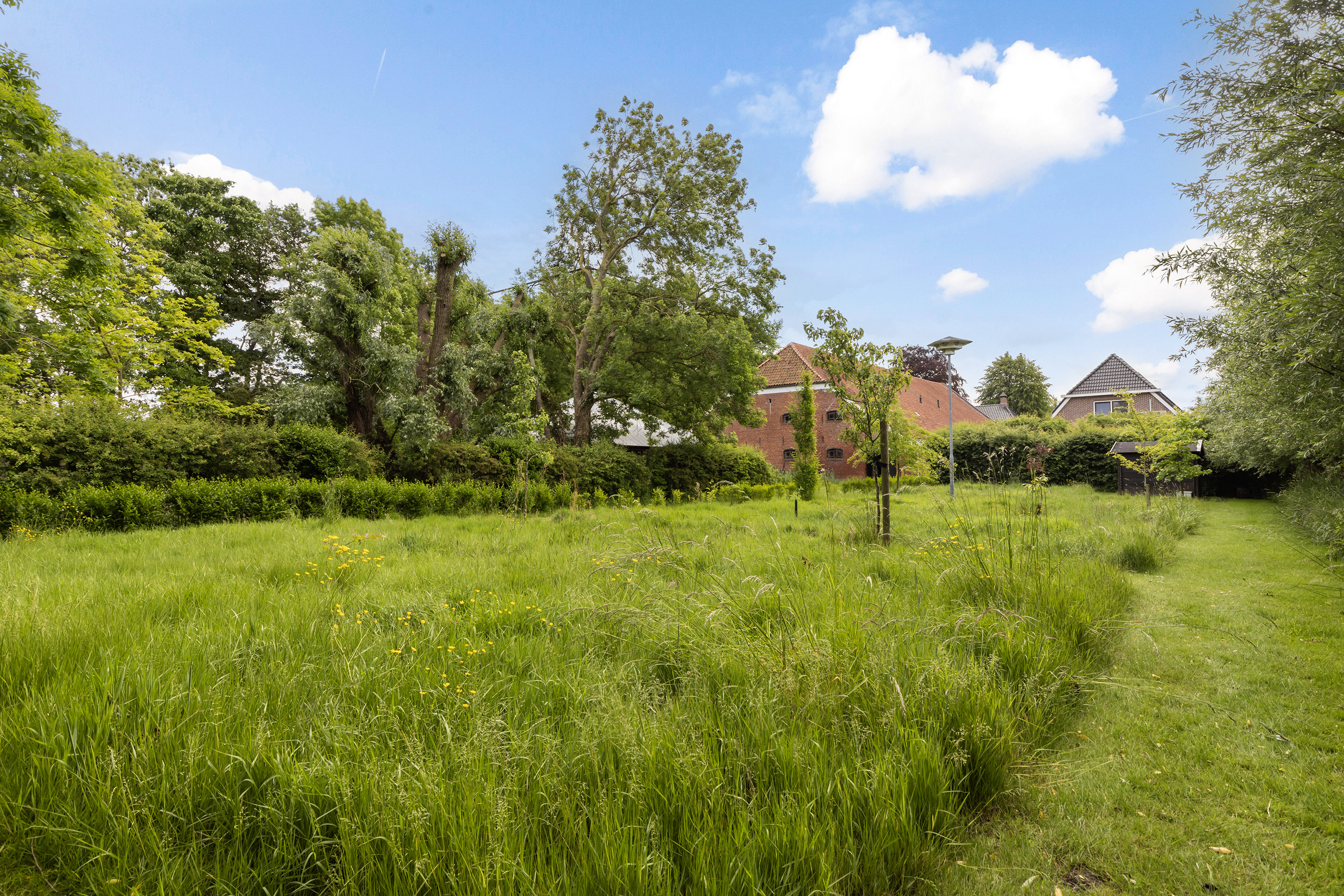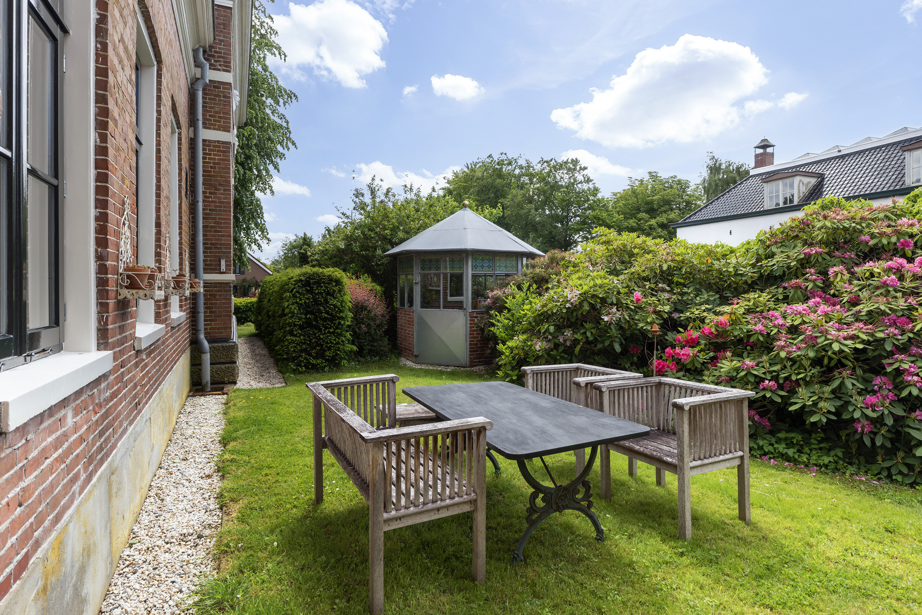 Achter de woning staat een fraaie open hooibergconstructie met een gegalvaniseerd dak, waaronder een buitenkeuken, vuurplaats, bar en meerdere zitjes zijn ingericht. Deze sfeervolle plek biedt beschutting tegen zon en regen en vormt een volwaardige buitenkamer waar het heerlijk toeven is. De tuin is diep, weelderig en toch vrij, omsloten door volwassen bomen die privacy bieden zonder het uitzicht te ontnemen. Een glazen theehuisje, tuinhuis en diverse zon- en schaduwterrassen maken de buitenbeleving compleet. Binnen- en buitenleven vloeien moeiteloos in elkaar over.
