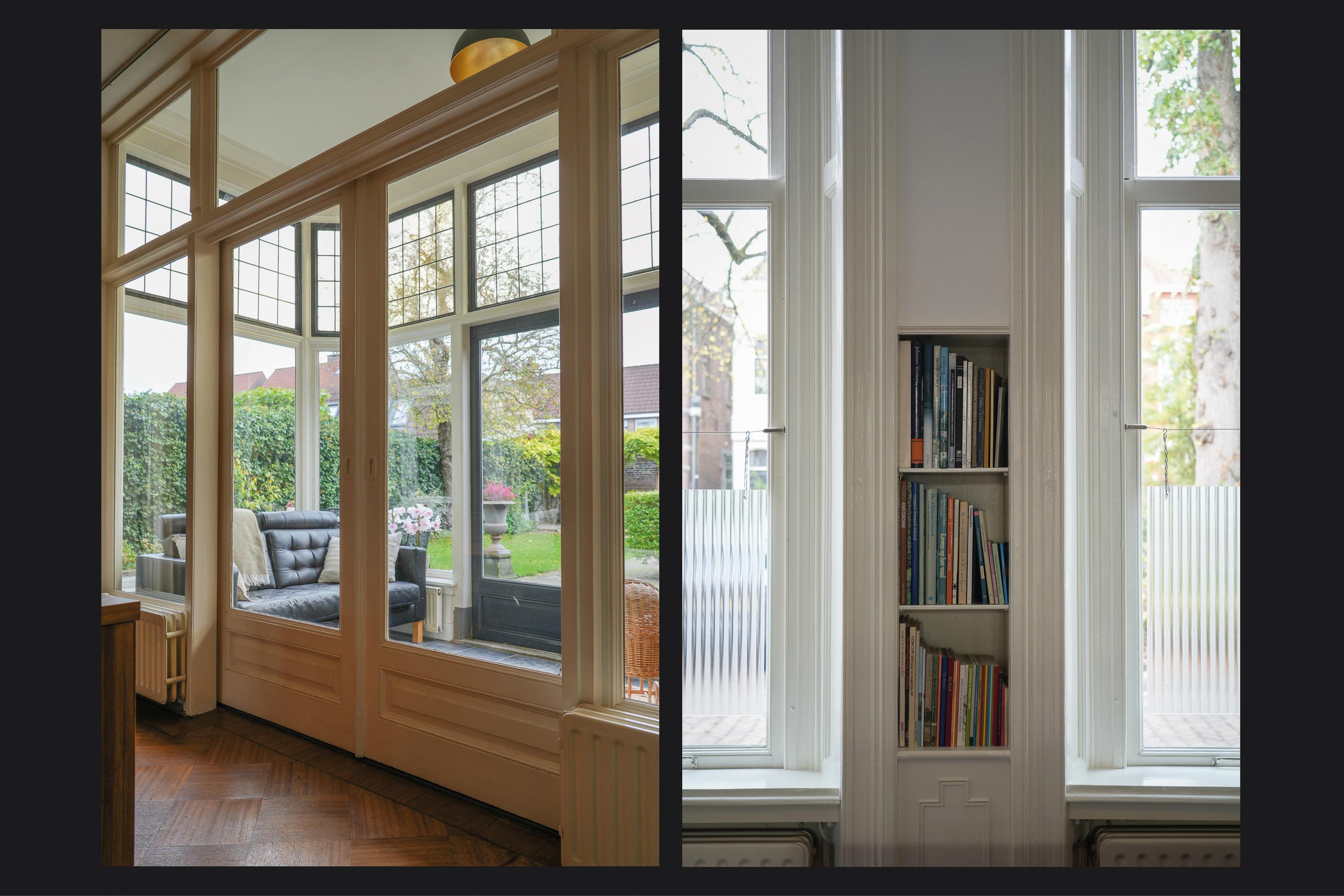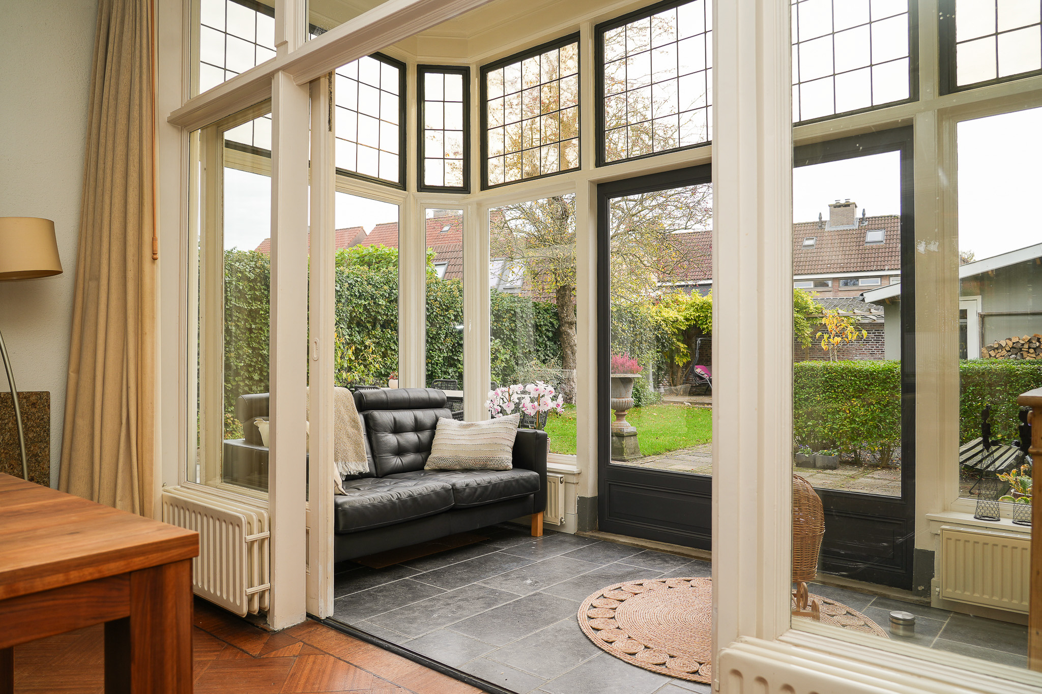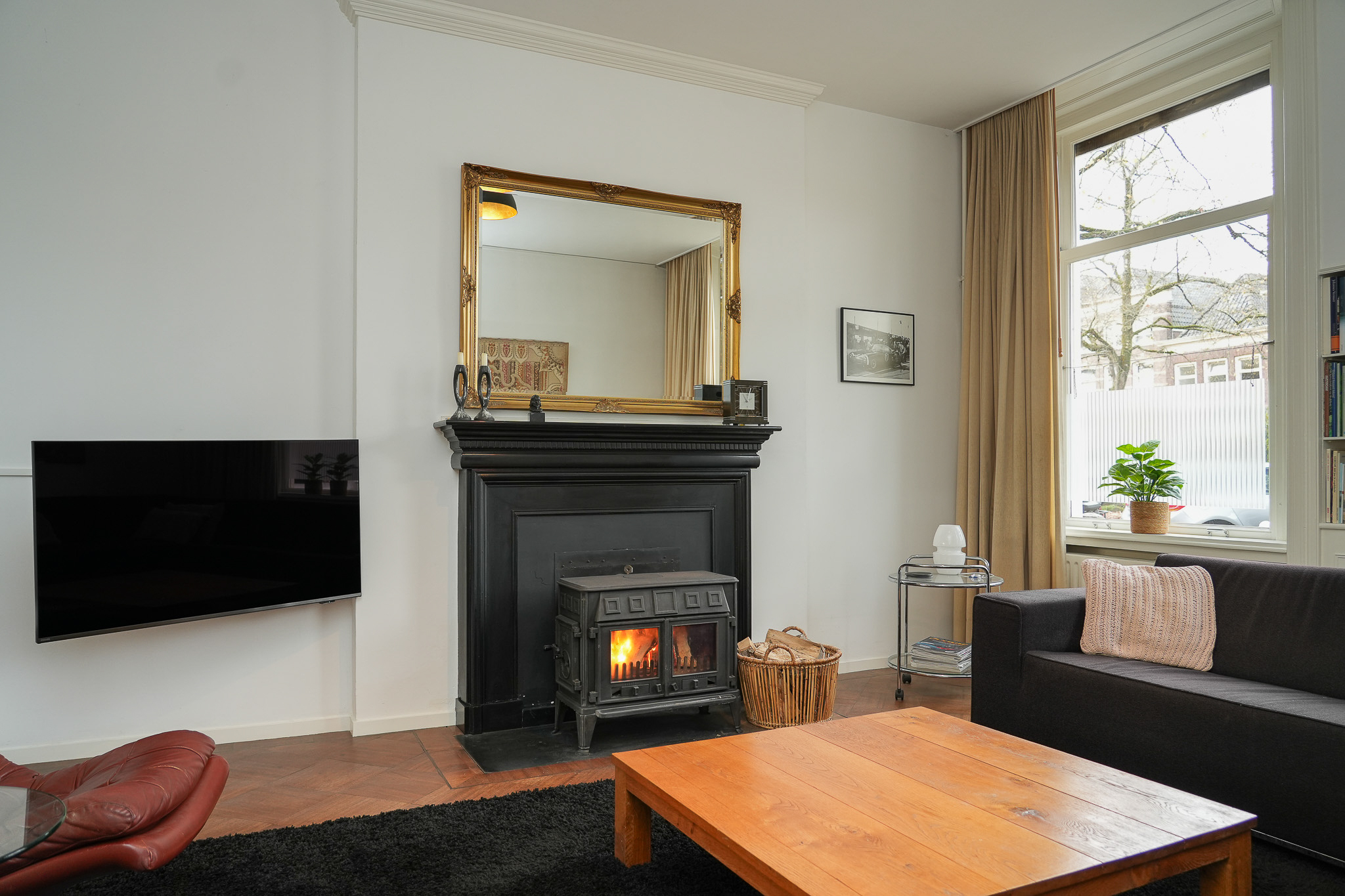 Rechts van de hal bevindt zich de woonkamer. Deze lichte ruimte heeft een plafond van ruim drie meter hoog, een schouw met goed werkend rookkanaal en vaste inbouwkasten op de plaats van de vroegere suitedeuren. In de achterkamer is in de voormalige doorgang naar de school een extra kast gemaakt. Aan de achterzijde bevindt zich een verwarmde tuinkamer met plavuizenvloer – ideaal als speelkamer, want de ruimte kan worden afgesloten met glazen schuifdeuren.