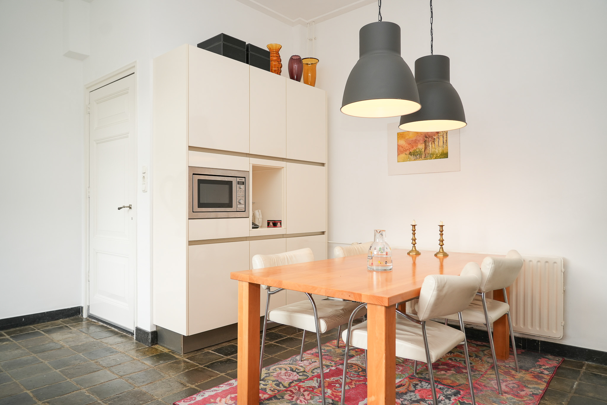 Vanaf het aanrecht is er mooi zicht op de tuin. Er is voldoende ruimte voor een grote eettafel en een brede deur opent naar buiten.