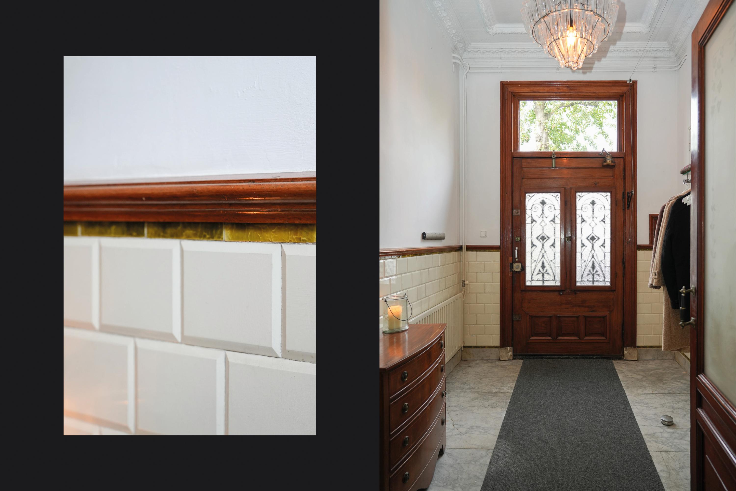 In de fraaie lijstgevel leidt de originele paneelvoordeur naar de vestibule. Deze ruimte heeft een ongekende grandeur, enerzijds door het hoge geornamenteerde stucplafond en anderzijds door het fraaie houtwerk met gaaf bewaard gebleven geëtst glas. De vloer is belegd met marmer en de facettegels op de wanden zijn intact gebleven. In de achtergelegen hal leidt een 19e-eeuwse trappartij naar de verdieping. Vanuit de hal geven prachtige paneeldeuren toegang tot de woonkamer, werkkamer, woonkeuken, kelderkast en het toilet. De vloer is hier belegd met authentieke patroontegels. De woonkeuken is een heerlijk lichte ruimte, ingericht met een Siematic keukenmeubel voorzien van diverse apparatuur en een diep natuurstenen werkblad uit één stuk.