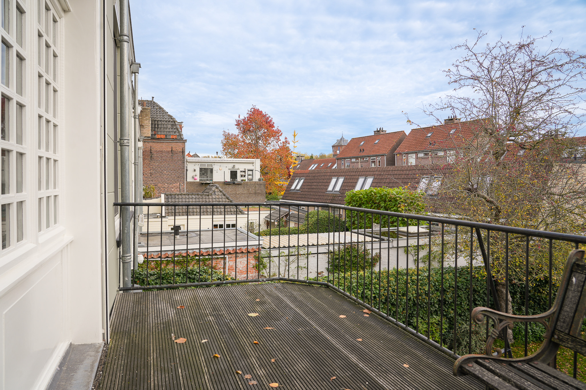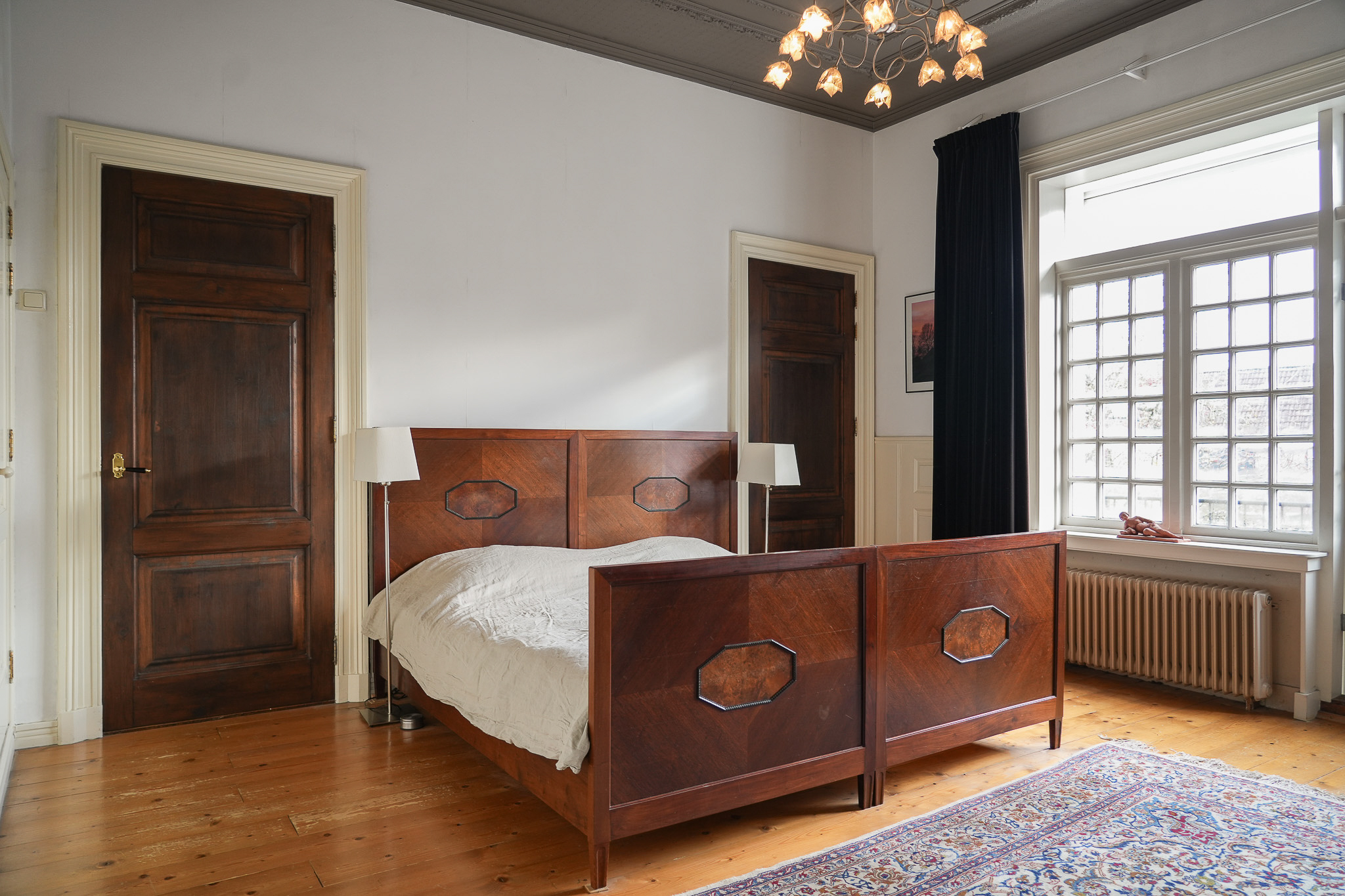 Aan de achterzijde ligt de grootste slaapkamer met antieke schouw, geornamenteerd stucplafond, garderobewand en balkon. Aangrenzend bevindt zich de wasruimte met aansluitingen voor wasmachine, droger en de cv-ketel. De badkamer is compleet ingericht met ligbad, inloopdouche, twee wastafels en vloerverwarming. De toiletruimte grenst aan de overloop.