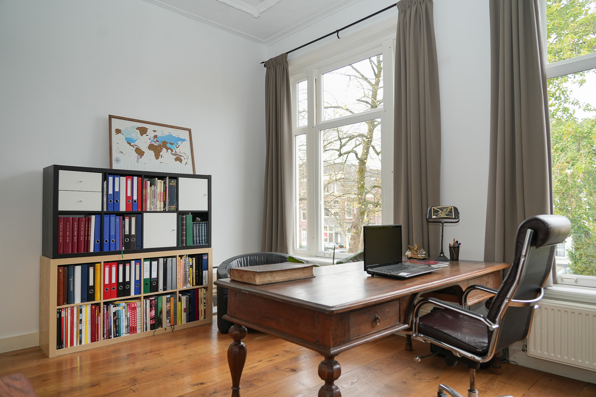 De werkkamer ligt aan de voorzijde en kijkt uit over de straat en het plantsoen. Onder de vensterbanken zijn vaste kasten gemaakt en op de vloer liggen eiken delen.