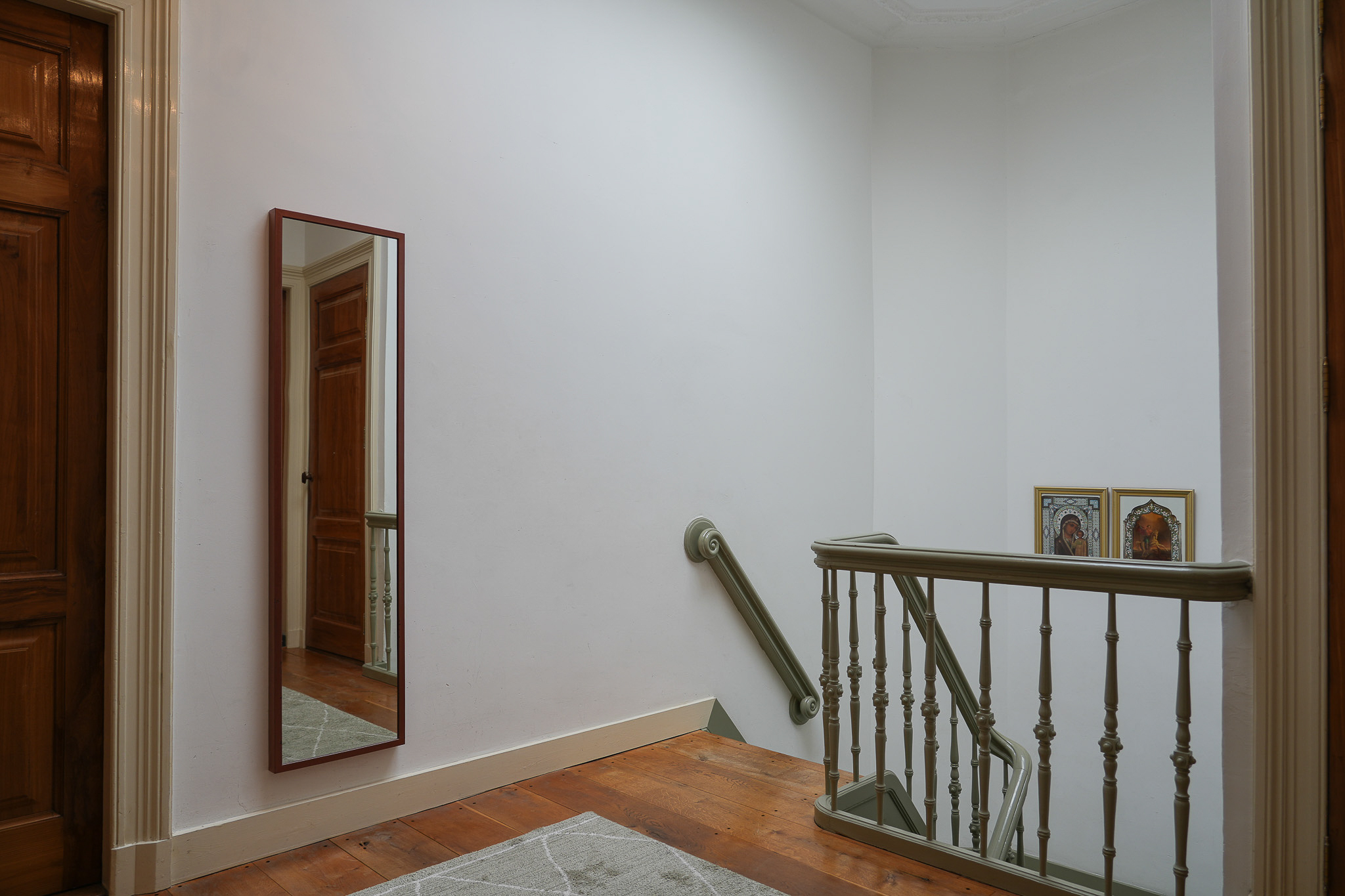 Boven gekomen baadt de overloop in een zee van licht, dankzij de lichtstraat in het platte dak. Prachtige drie-vaks paneeldeuren geven toegang tot de aangrenzende vertrekken. Twee slaapkamers bevinden zich aan de voorzijde en kijken uit over het plantsoen. In het voorportaal van één van deze slaapkamers aan de voorzijde is een trap voorbereid, omdat er in het verleden plannen waren om het pand met een extra verdieping te vergroten.