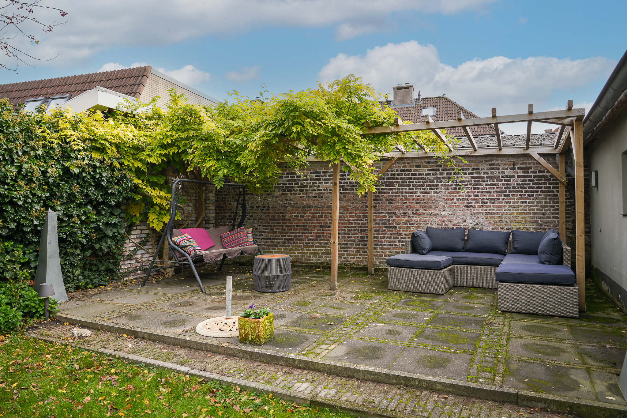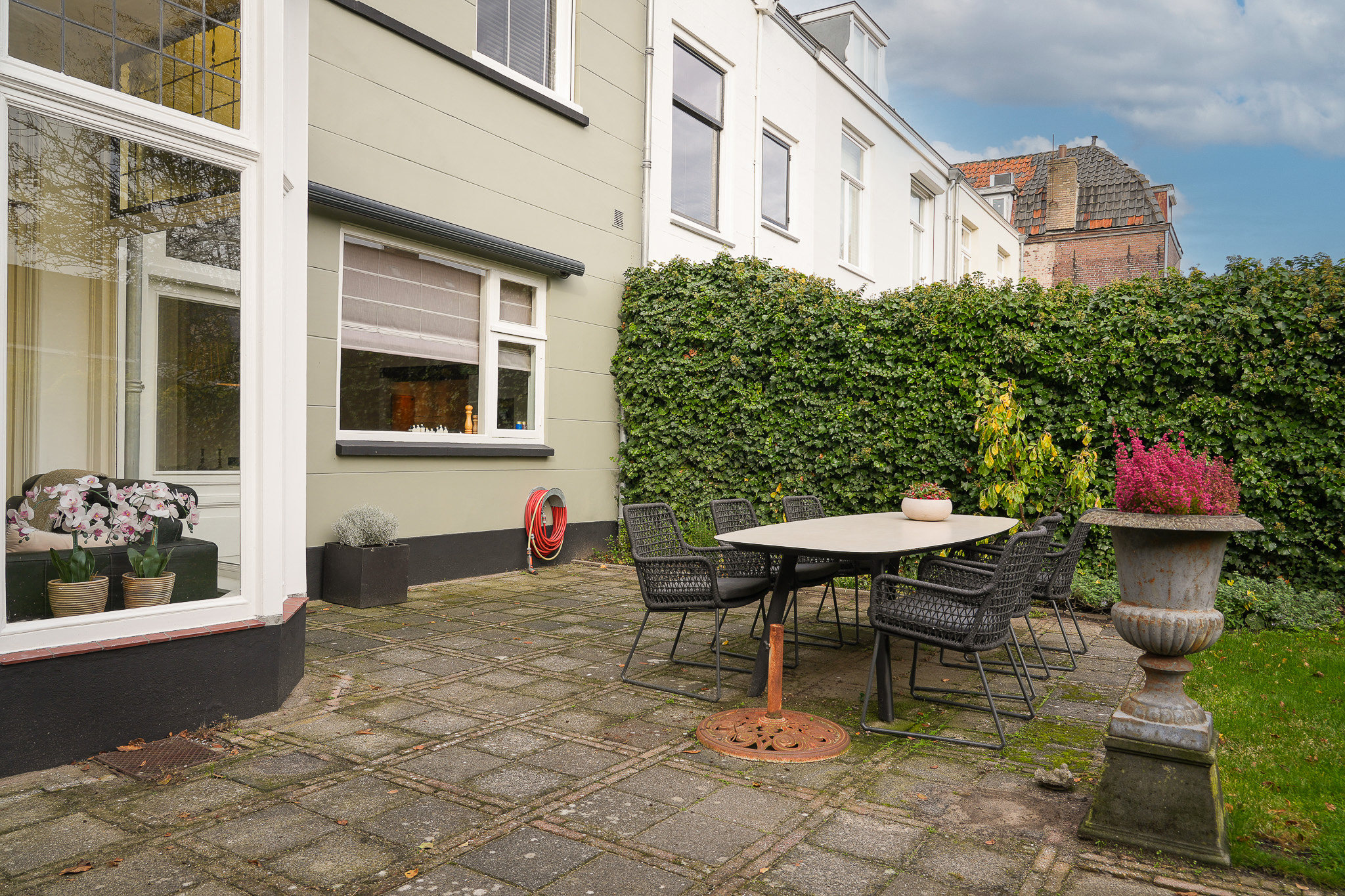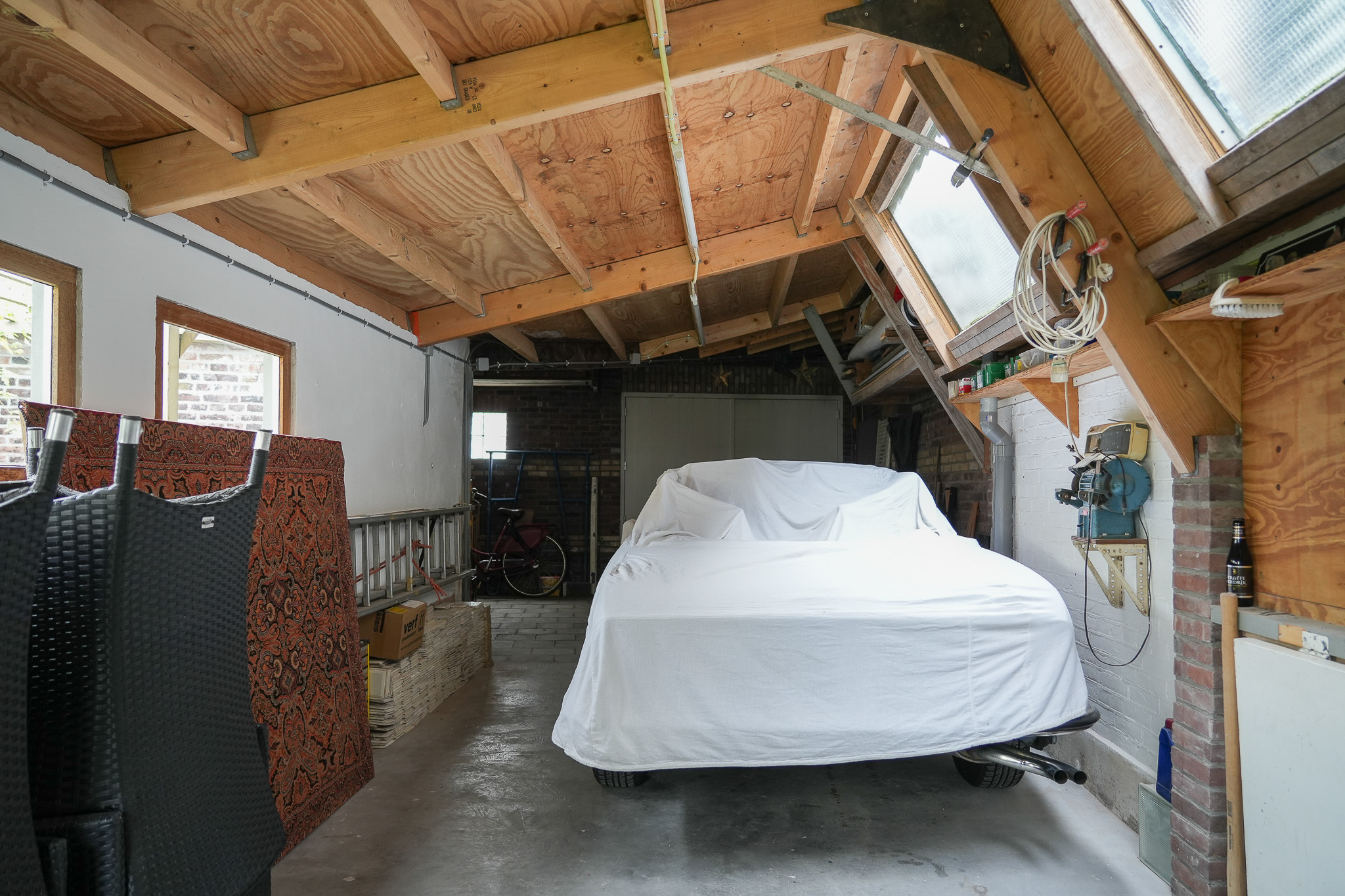 Achter de woning ligt een unieke, 9,5 meter brede en 15 meter diepe tuin op het oosten en zuiden. Er is altijd wel ergens een plekje in de zon of schaduw te vinden. In 2021 hebben de eigenaren het perceel kunnen uitbreiden, waardoor er ruimte ontstond om een groot pannengedekt bijgebouw te bouwen. Deze ruimte van 59 m² leent zich bij uitstek als stallingsruimte voor een oldtimer of boot, dan wel als atelier. De dubbele garagedeuren komen uit op de parkeerplaats direct achter de woning.