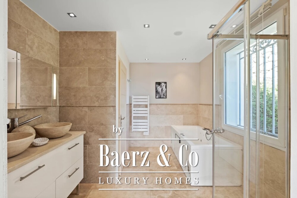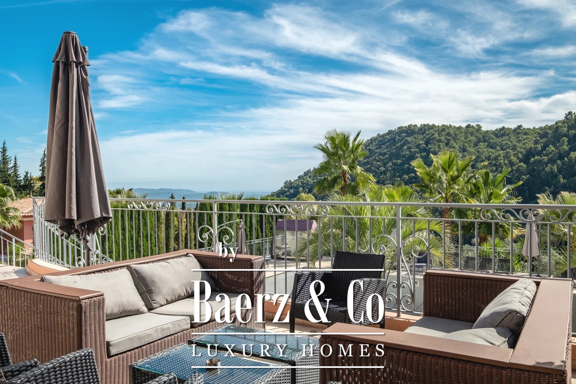 Een zelfstandig appartement met twee ruime slaapkamers, badkamers, keuken en woonkamer biedt extra mogelijkheden voor privacy of logés. De aangelegde tuin van 3.000 m² omvat een ruim zwembad, een poolhouse en brede terrassen die uitkijken richting de horizon. Voorzieningen zoals airconditioning, open haard, lift, videobeveiliging, elektrische poort en overdekte garage verlenen het huis discretie en comfort. Deze villa belichaamt een verfijnde levensstijl met panoramisch uitzicht over de Middellandse Zee.