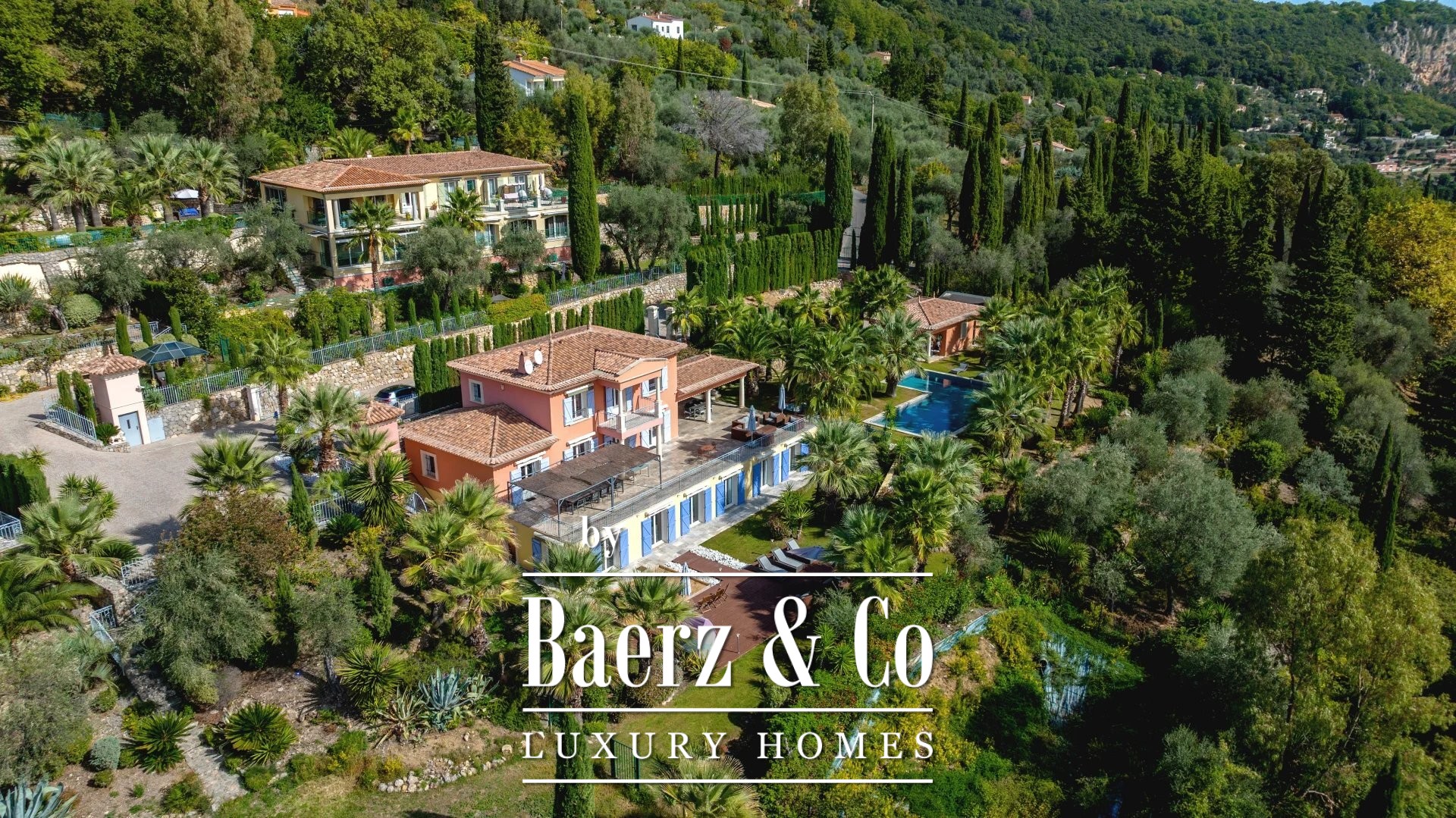 Buiten bevindt zich een verwarmd zwembad met poolhouse, omringd door weelderige vegetatie en een royaal terras voor privé samenkomsten. Het uitzicht op zee en de bergen zorgt voor een onovertroffen gevoel van locatie, terwijl een dubbele garage, alarmsysteem, videofoon en afsluitbare toegang optimale beveiliging en discretie waarborgen. Deze luxe villa in Grasse is bestemd voor wie licht, ruimte en sereniteit waardeert in het hart van de Provence.