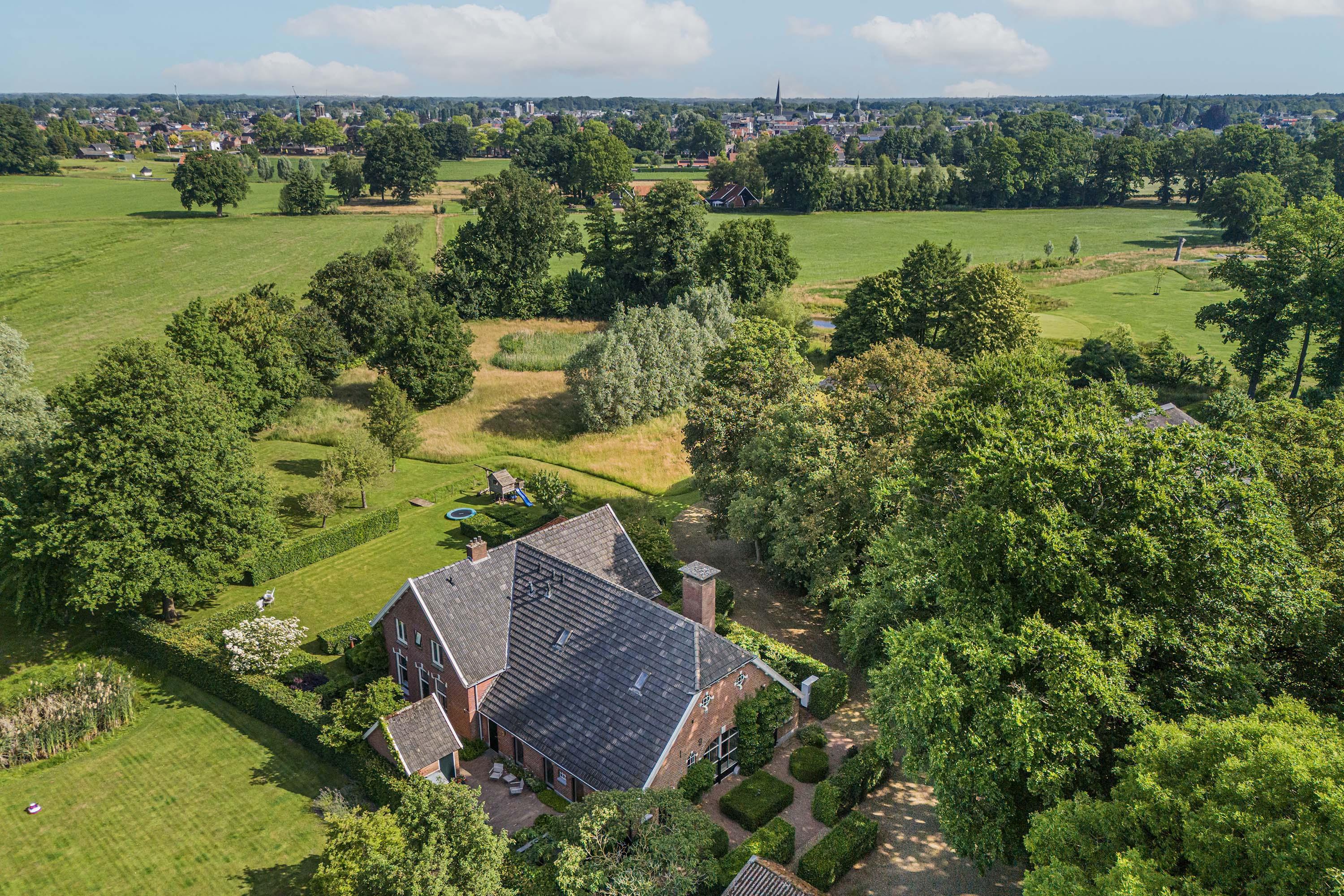 Op een toplocatie net even buiten Haaksbergen, verscholen in het groen met een fenomenaal uitzicht over landerijen naar de dorpsrand, ligt deze prachtig verbouwde volumineuze woonboerderij met enkele bijgebouwen op een perceel van circa 1 hectare.