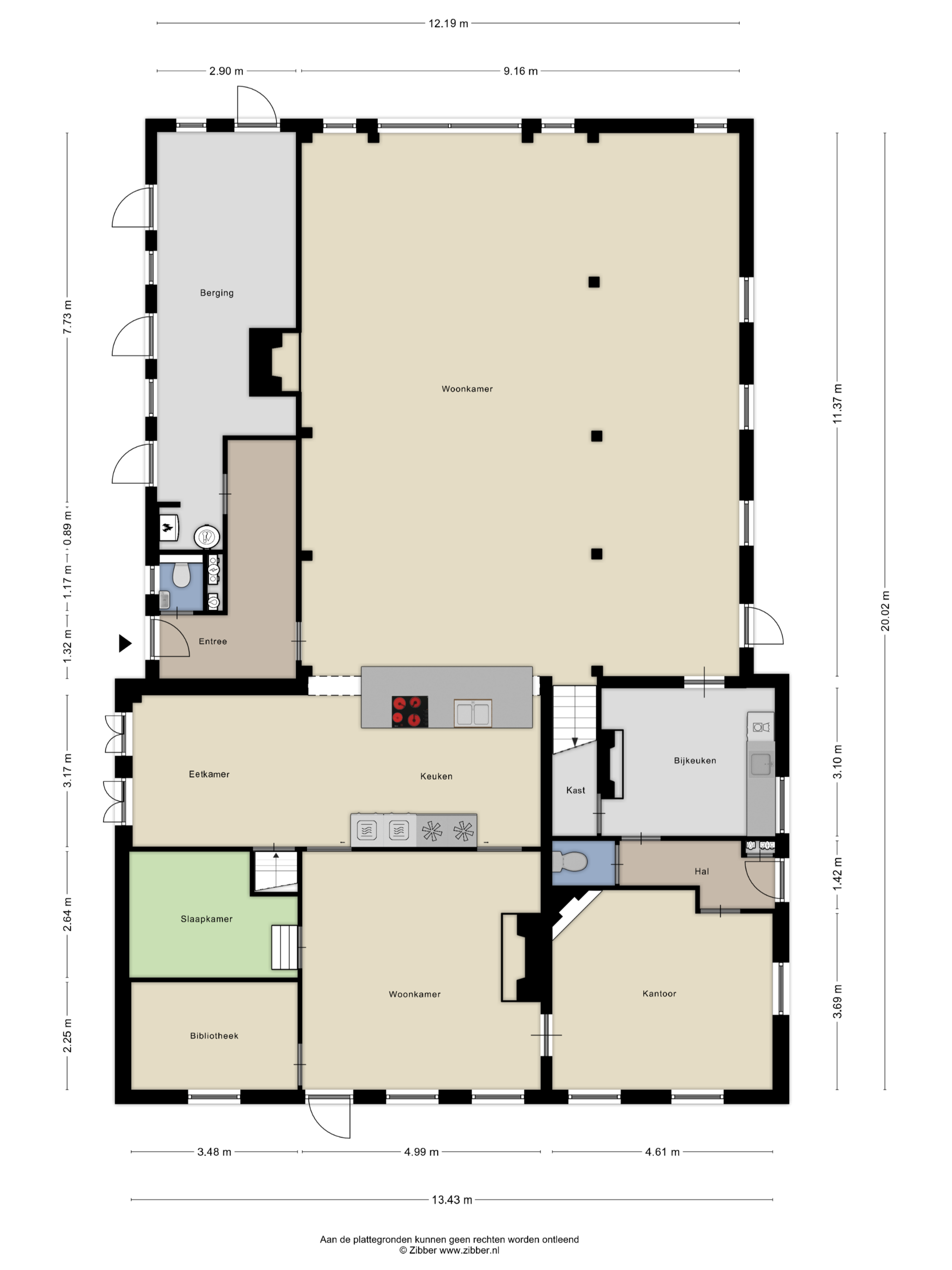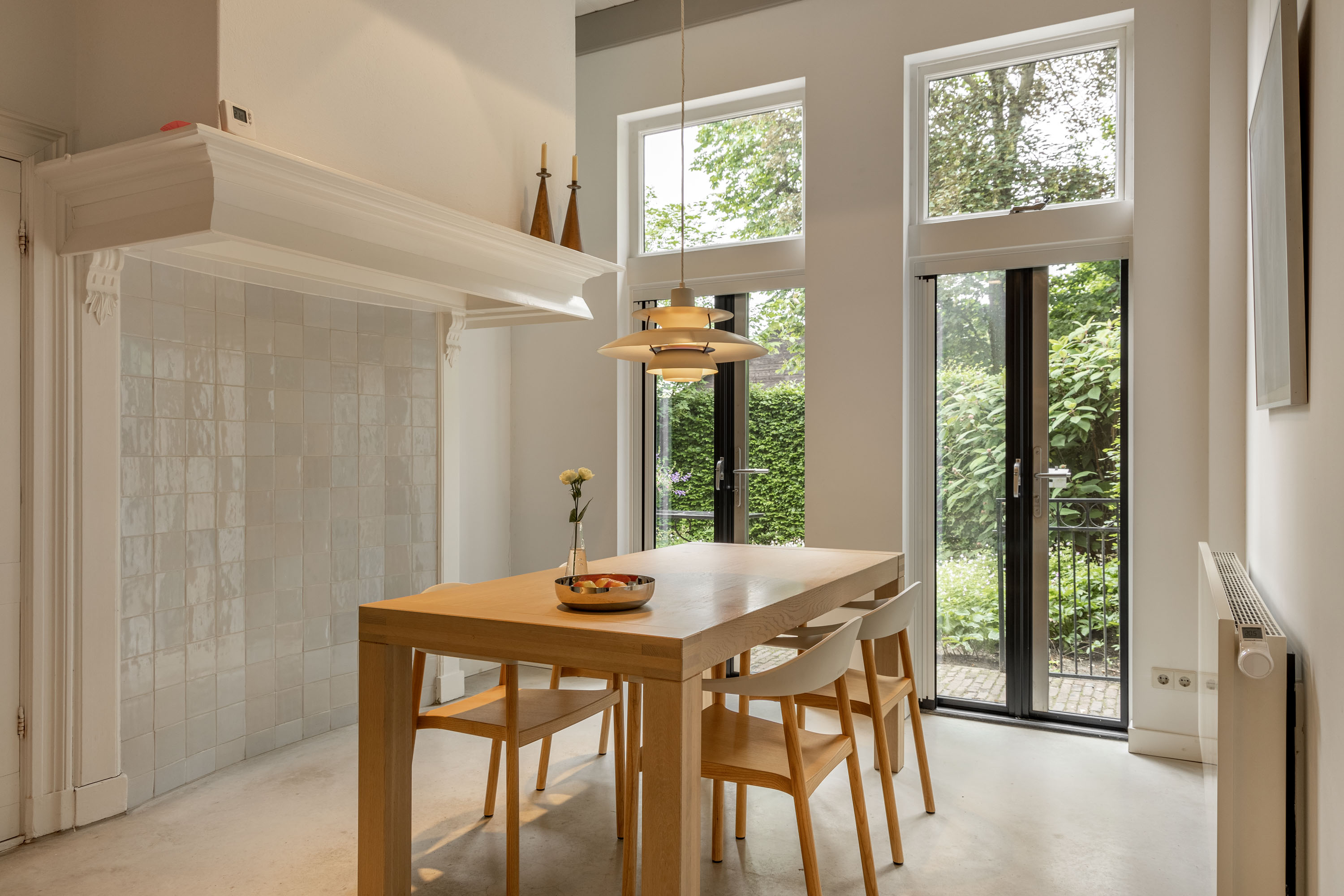 Verder zijn er op de begane grond nog een opkamer welke dienst doet als logeerkamer, een bibliotheek, de oorspronkelijke woonkamer met bijbehorende originele wand- en vloertegels en een schouw in gebruik als 2e zitkamer, een werkkamer met een geweldige lichtinval door de hoge vensters, een achterhal met gastentoilet en een bijkeuken.