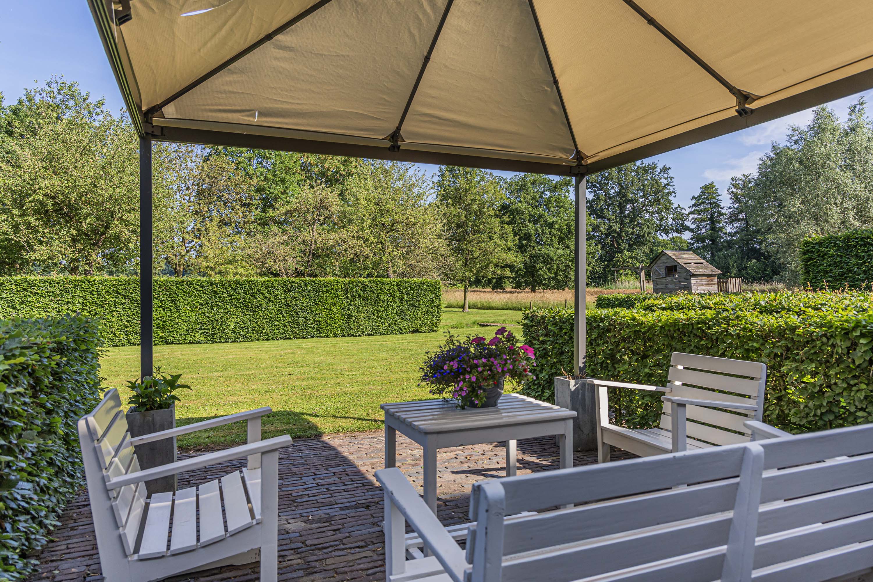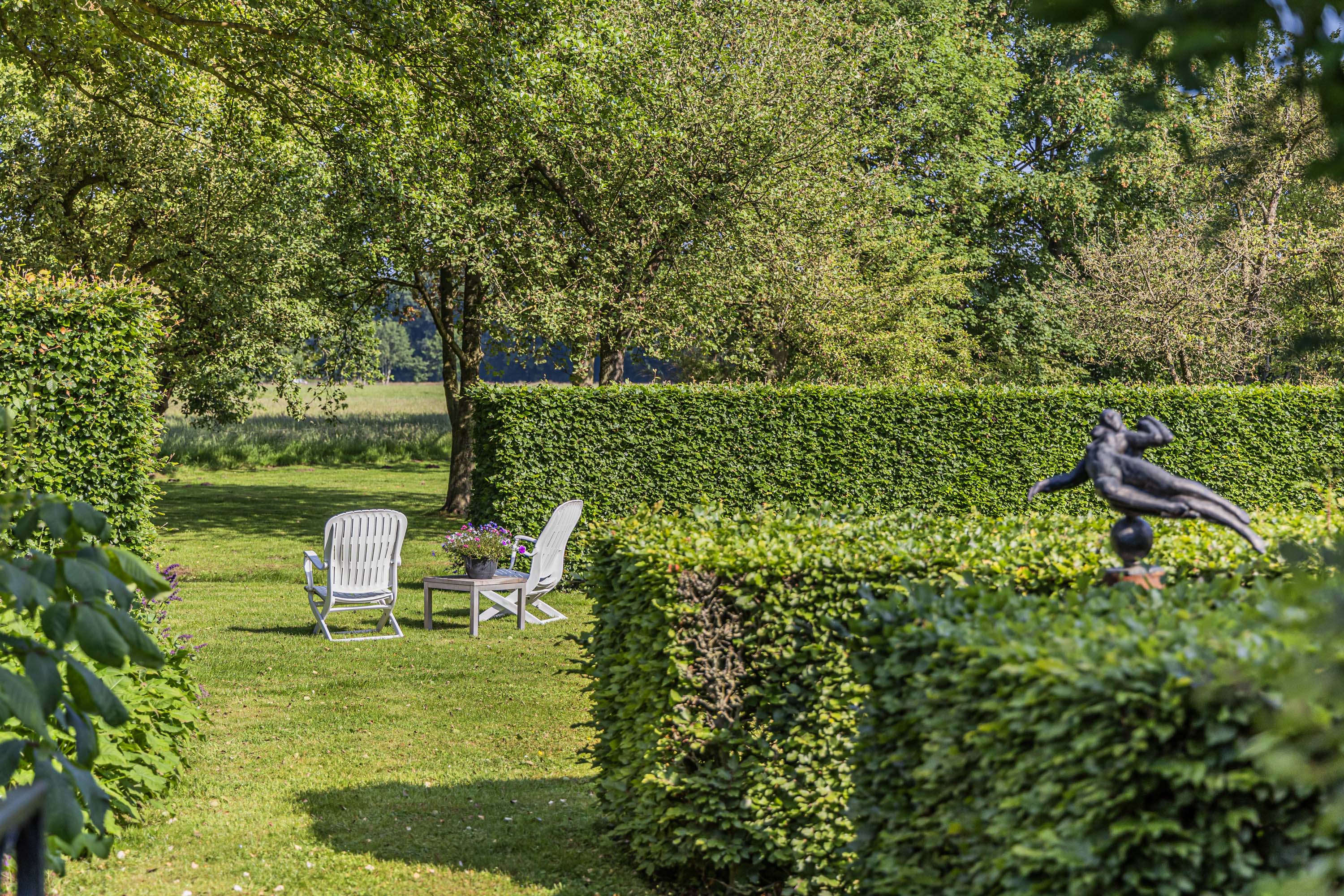 Vanuit de Hasseltweg worden bezoekers via de eiken omzoomde oprijlaan begeleid naar dit prachtige woonerf. Hier is voldoende ruimte om meerdere auto’s te stallen. De woning is omgeven door een groene oase van diverse hagen en afscheidingen geheel aangelegd naar een ontwerp van de internationaal vermaarde tuinarchitect Piet Oudolf. Hij heeft van de breed naar achter uitwaaierende kavel omgetoverd tot een waar paradijs. Er zijn meerdere zitjes, allemaal afgescheiden van elkaar met eigen privacy en karakter. Op elk moment van de dag is het hier meer dan optimaal genieten. De tuin wordt doorbroken door een slootje waardoor er een mooie natuurlijke tweedeling is ontstaan; rond de woning prachtig aangelegd, de andere zijde van de sloot een natuurweide met diverse fruitbomen (appel, peer, pruim en een mooie kastanje) en een poel waar verscholen in het hoge gras elk jaar een reeënfamilie de kalfjes groot brengt. Op een afgescheiden gedeelte van het perceel zijn 28 zonnepanelen gesitueerd. De afscheiding aan de achterzijde is geheel natuurlijk gebleven, een enkele solitaire boom of een groenblijvende struik, dit om volop te kunnen genieten van het weidse uitzicht en elke avond een prachtige zonsondergang.