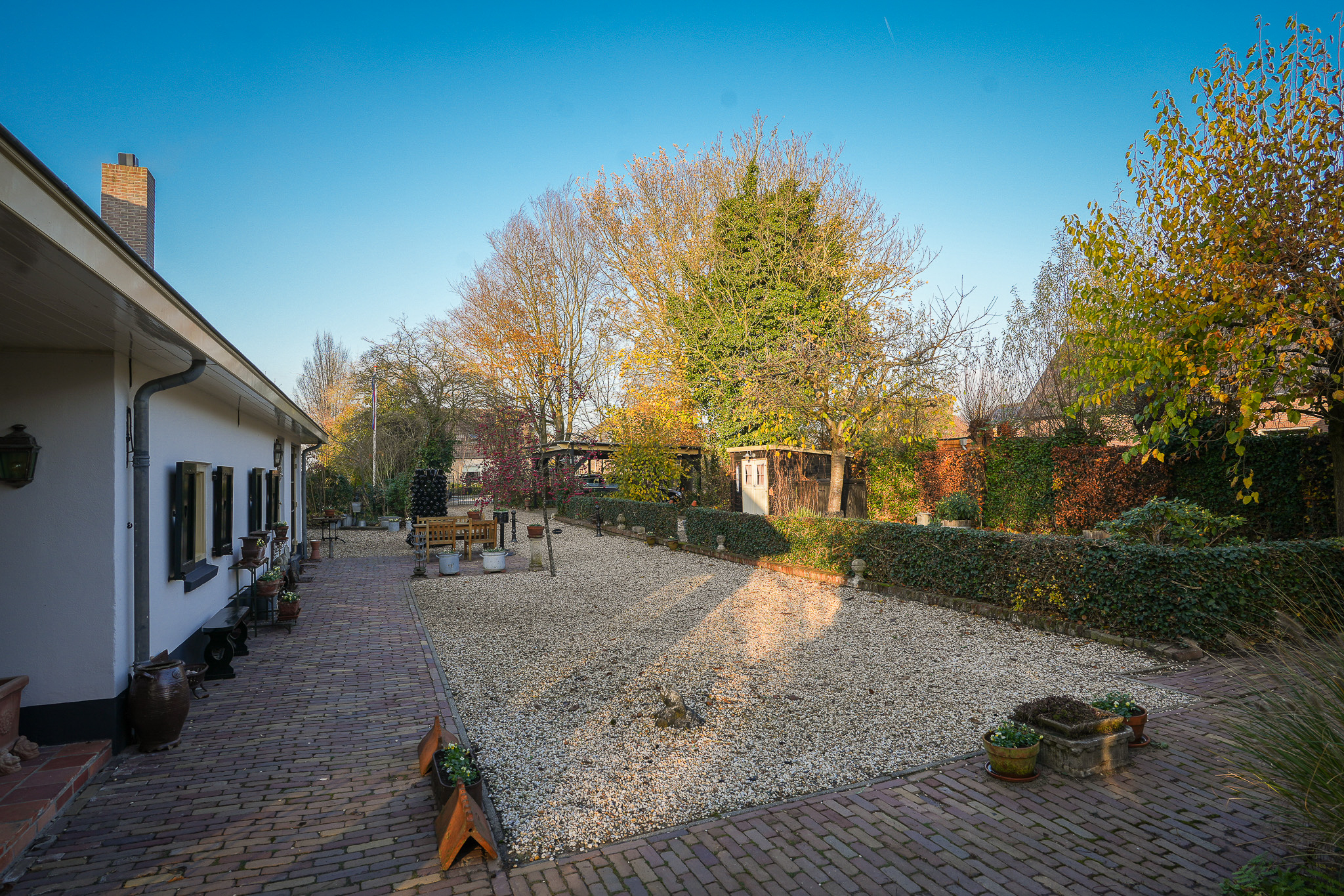 Het perceel van bijna 5.000 m² met onder meer een onderhoudsarme bloementuin is een waar paradijs voor vogels en insecten. Het perceel is omzoomd door knotwilgen, aan de voorzijde staan een oude pruimenboom en een karakteristieke treurwilg. Links van de woonboerderij bevindt zich een oprit voor meerdere auto’s, waarvan er twee onder de carport passen.