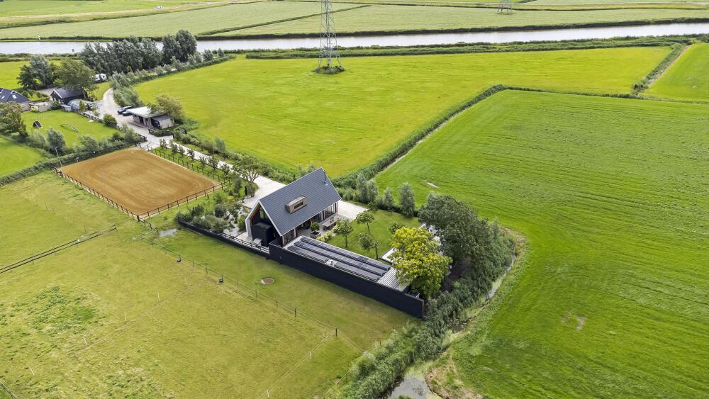 Het ruim 1.7ha weiland omzoomd door een sloot heeft twee toegangen en ligt direct achter de stallen aan het Van Harinxmakanaal. In de huidige situatie lopen de paarden op het perceel achter de woning, dit zal in de nieuwe situatie door ruilverkaveling dus veranderen naar de voorkant (kanaal- en zichtkant) van de woning. De paardenbak 20x40 is voorzien van soepele bodem en verlichting. Het is tevens mogelijk de woning zonder het weiland aan te kopen.