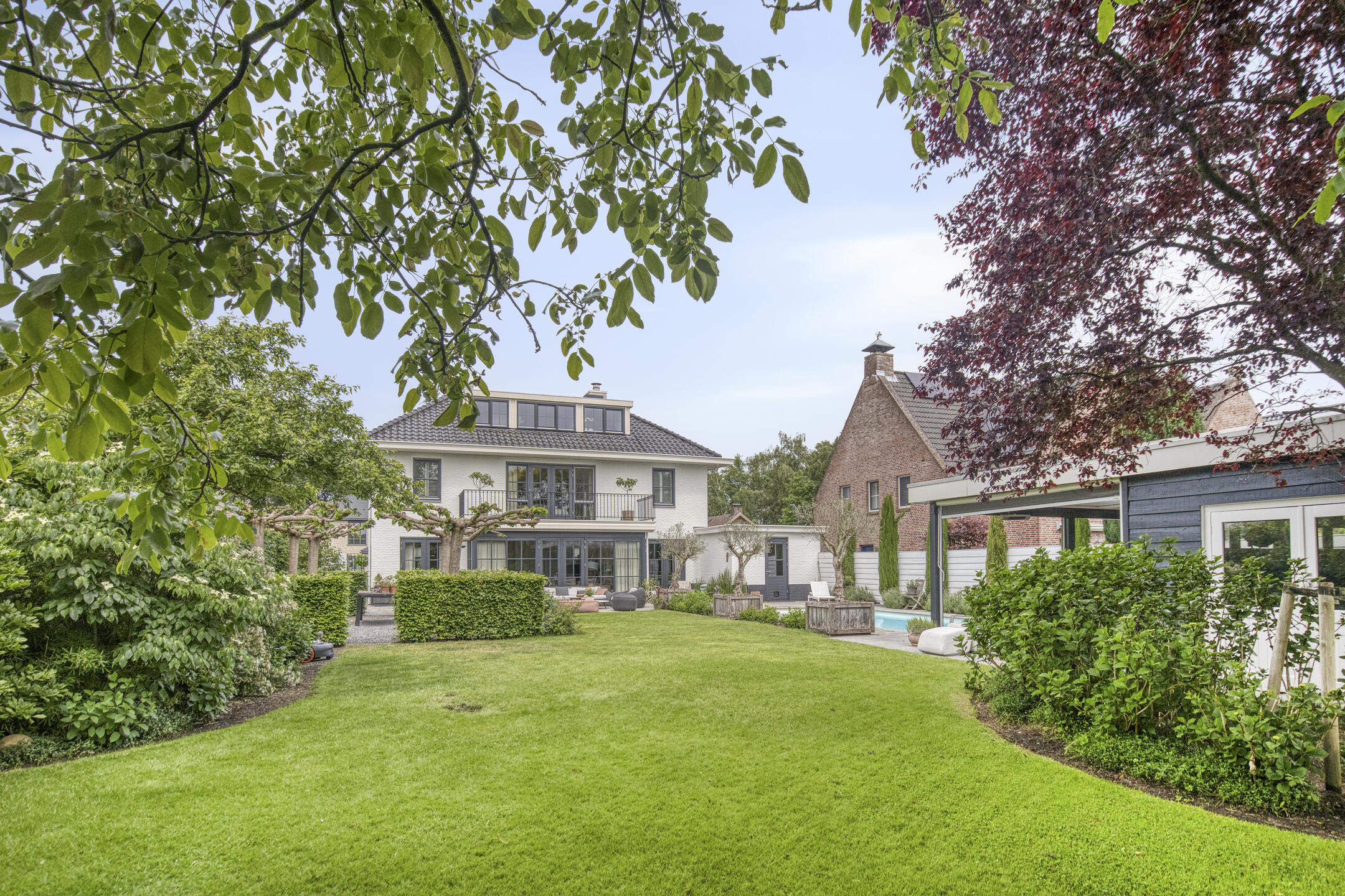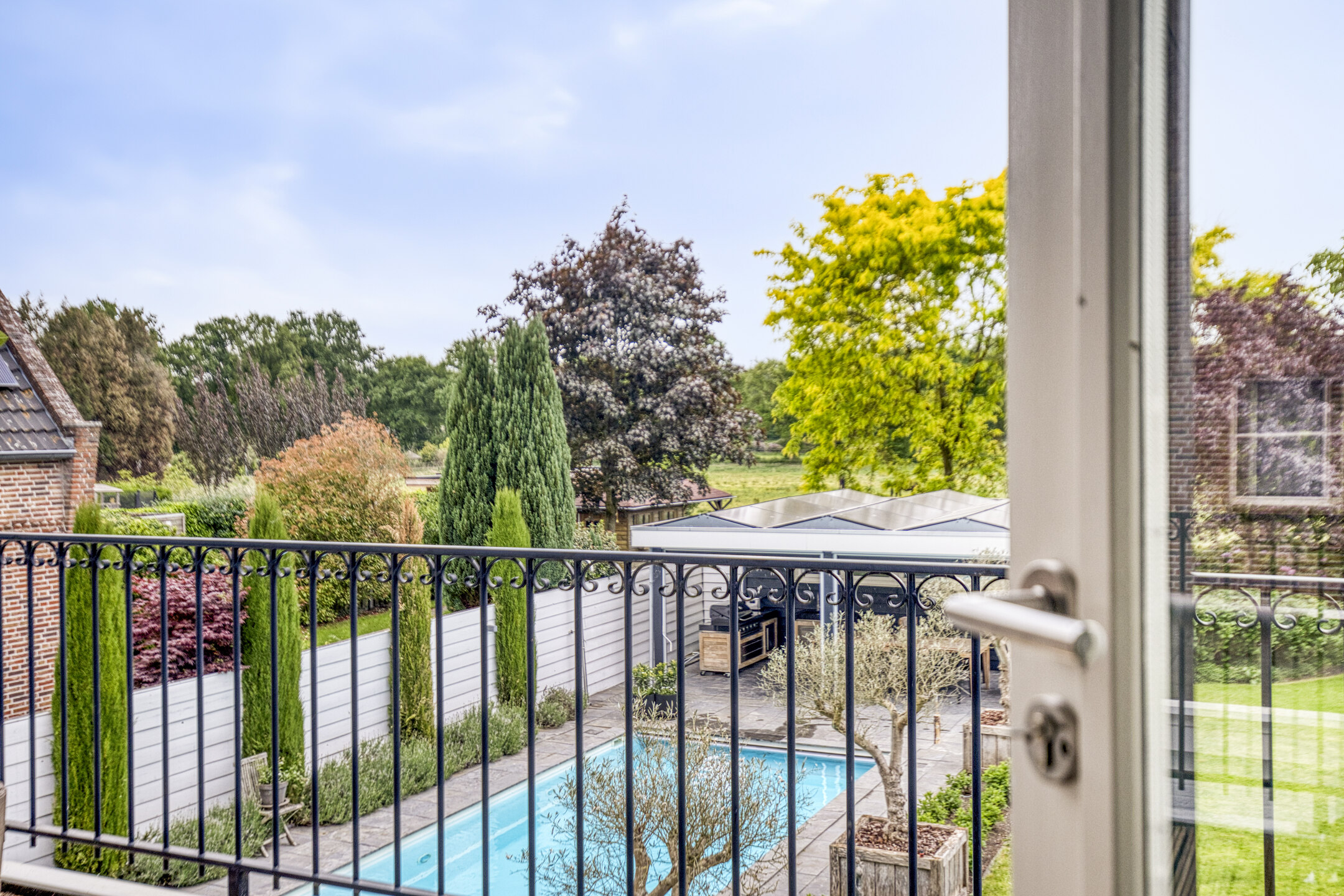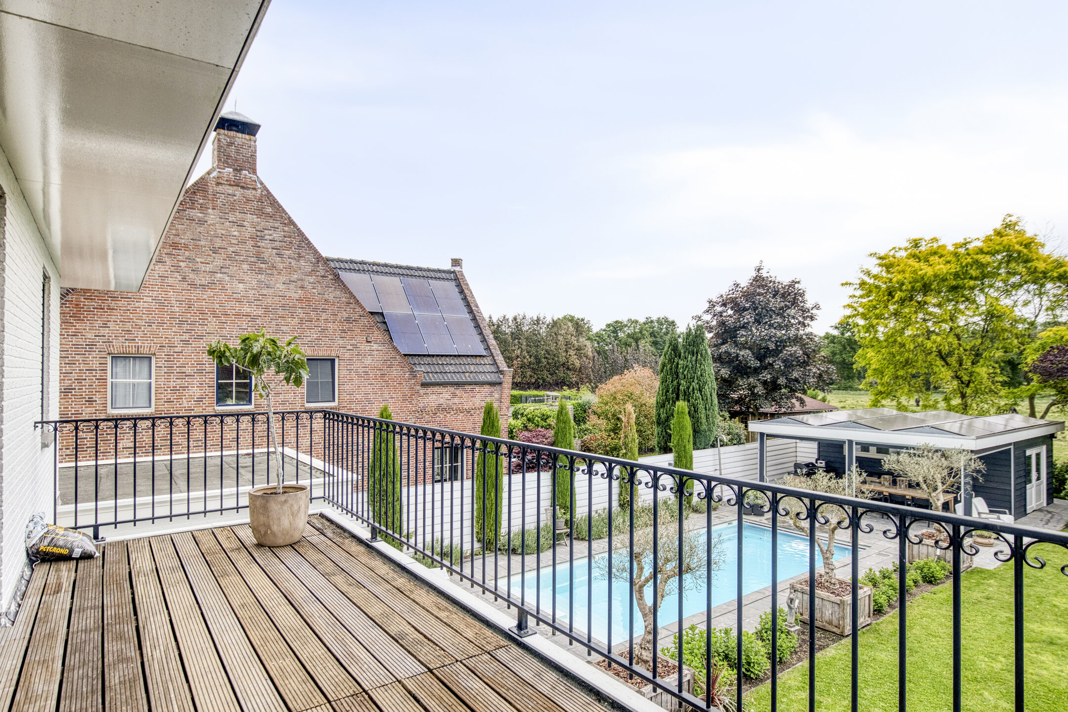 De absolute blikvanger? Het riante zwembad met een stijlvol poolhouse met omkleedruimte, veranda en een volledig geautomatiseerde technische pomp/filter- installatie t.b.v. het zwembad en sproei-installatie t.b.v. de tuin. Zo heeft u nergens omkijken naar, enkel genieten.