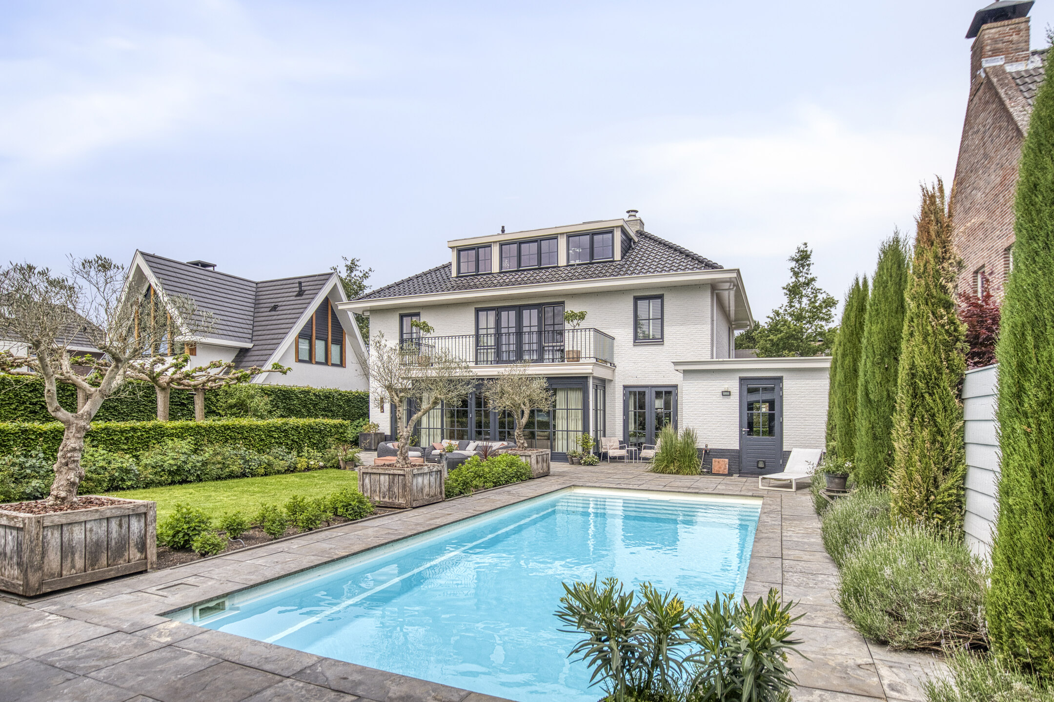 Bij binnenkomst valt direct de imposante entree op: licht en ruimte komen u tegemoet, een voorbode van wat deze villa te bieden heeft. De halfopen living vormt het hart van het huis, met prachtig zicht op de tuin en openslaande deuren naar het terras.