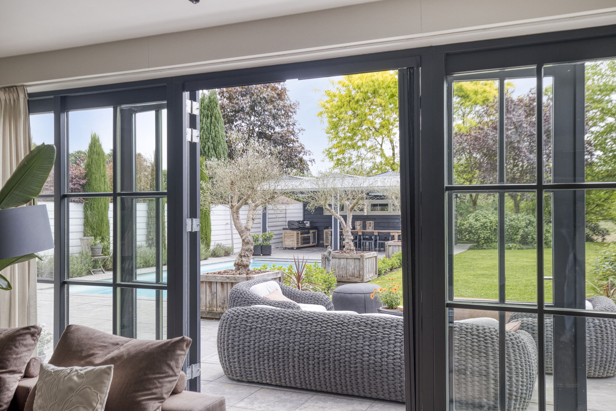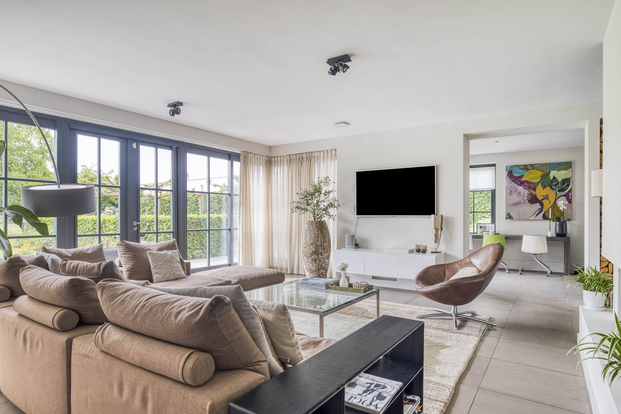 Aan de rechterzijde van de woning bevindt zich een tweede living, een ideale plek voor rust, hobby’s, thuiswerken of als speelruimte voor de kinderen. Ook deze ruimte heeft openslaande deuren naar de tuin.