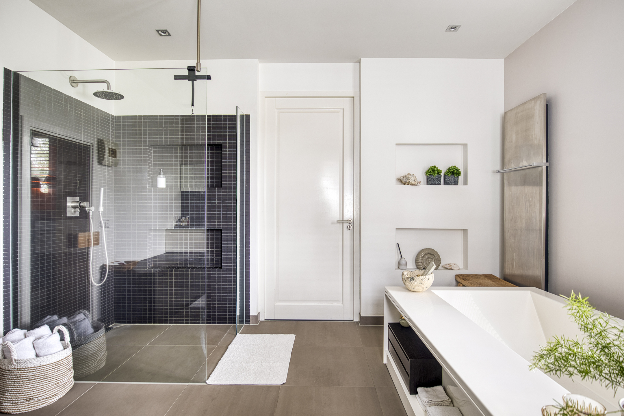 betegelde Boffi badkamer en-suite, voorzien van een vrijstaand ligbad, inloopdouche, 2e wandcloset, badkamermeubel met een wastafel, meer- persoons sauna en een designradiator;