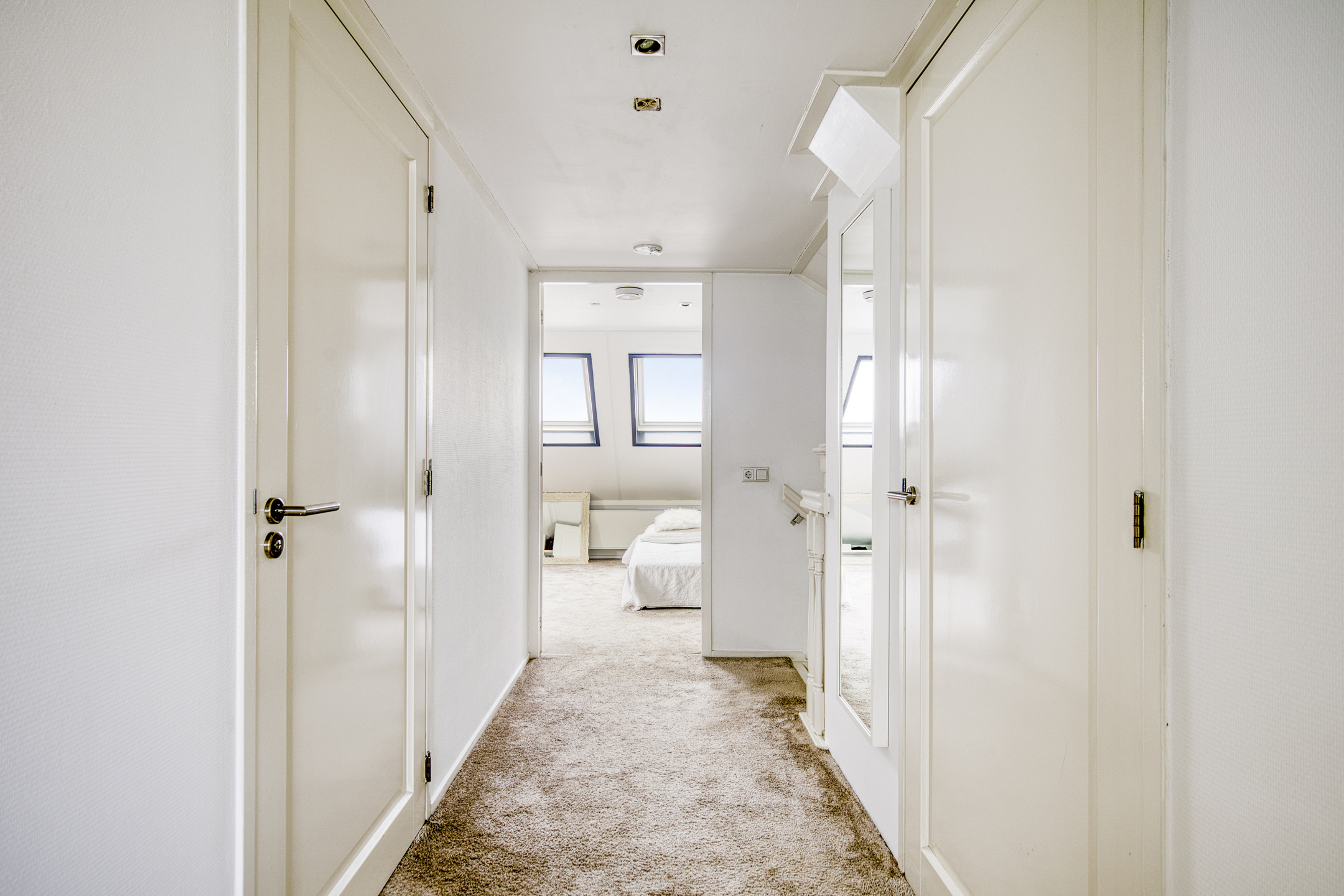 Overloop, wandafwerking stucwerk, vloer afgewerkt met tapijt, plafond afgewerkt met stucwerk;