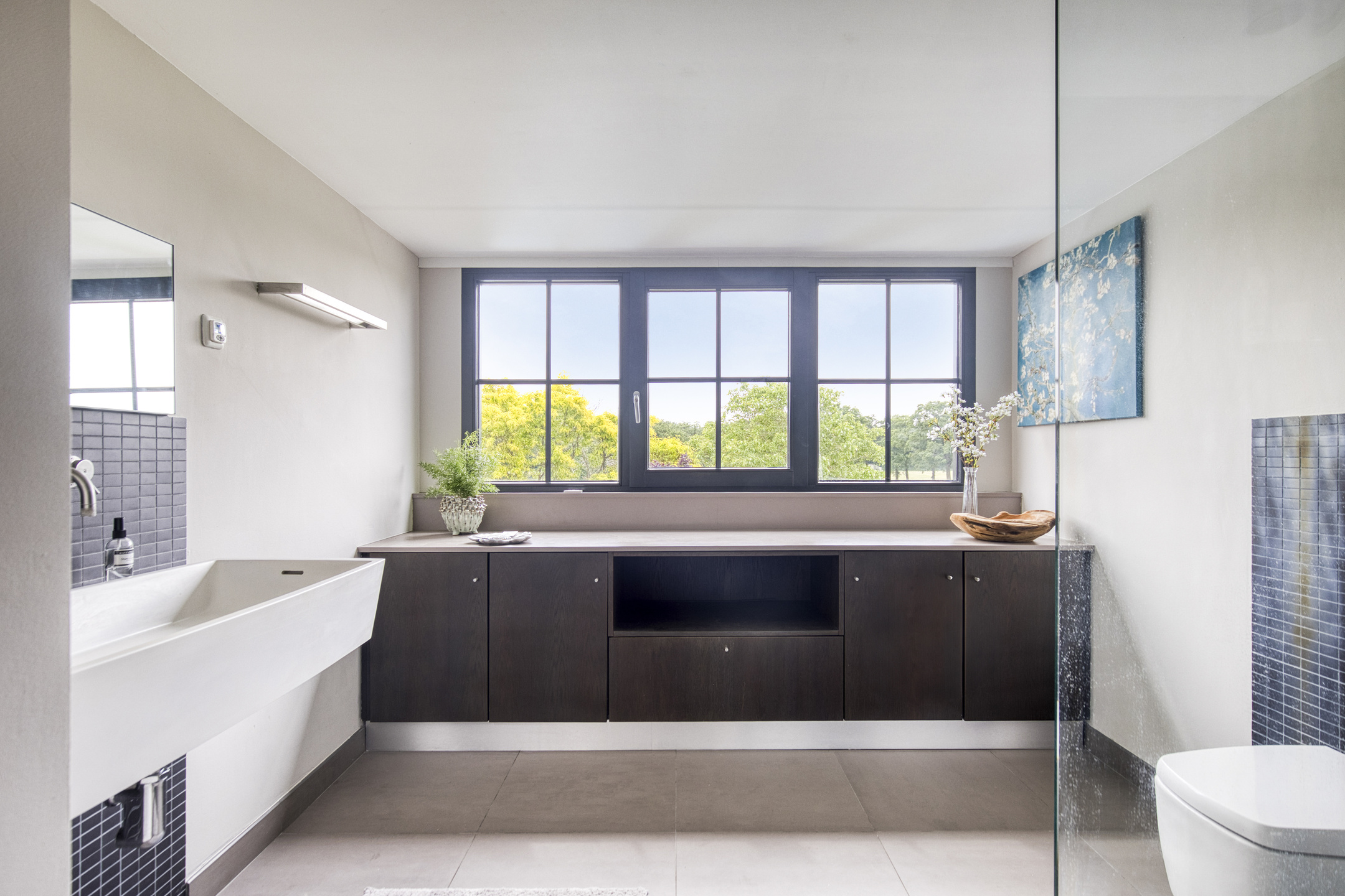 2e betegelde Boffi badkamer, voorzien van een inloopdouche, 3e wandcloset, badkamermeubel met een wastafel, dressoirkast en een dakkapel.