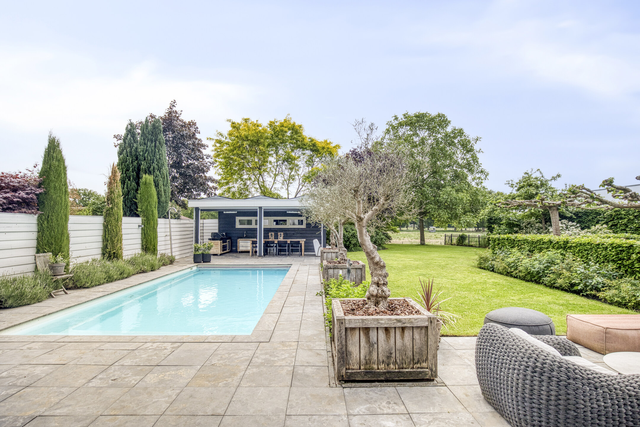 Luxe houten poolhouse vv. veranda met vloerverwarming, op maat gemaakte kasten, kleedruimte, zonne-screens, opstelplaats HR-combiketel, sproei installatie t.b.v. tuin en een bergruimte vv. zwembadpomp/filter (geautomatiseerd).