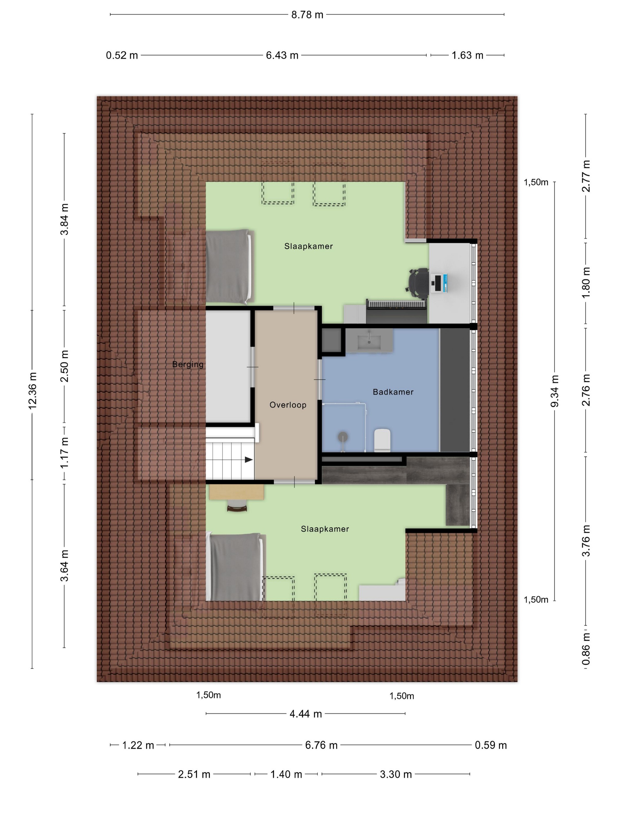slaapkamer links, voorzien van op maat gemaakte kasten, studiehoek, 2-tal dakramen en een dakkapel aan de achterzijde vv. airco-installatie, wandafwerking stucwerk, vloer afgewerkt met tapijt, plafond afgewerkt met stucwerk en dakplaten in het zicht;