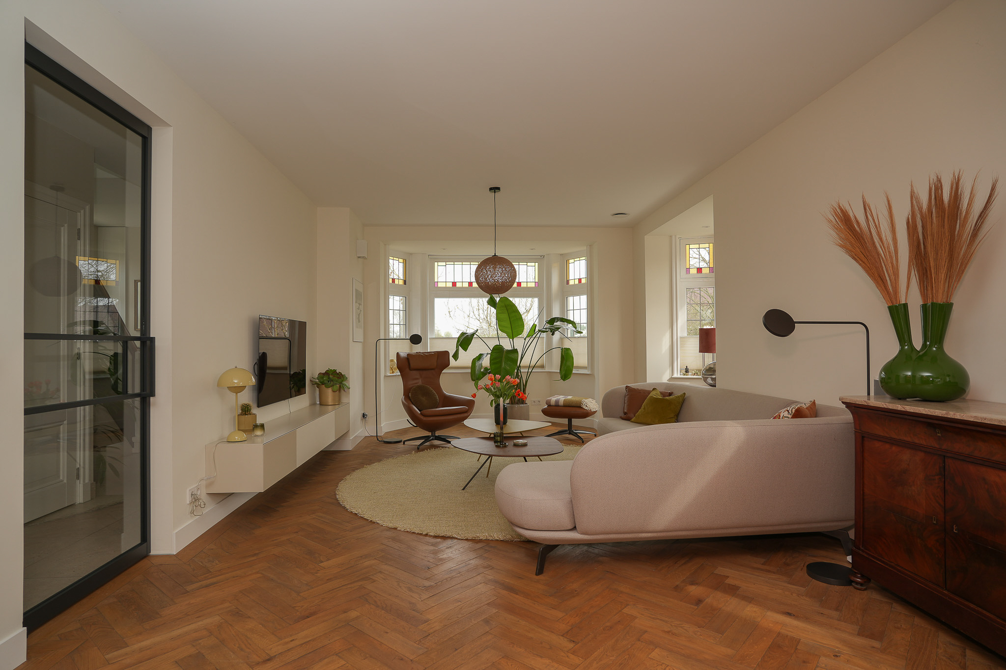 Een stalen taatsdeur leidt naar de woonkamer aan de voorzijde. Hier komen karakter en comfort op een natuurlijke manier samen. De erkers, het glas-in-lood en de visgraat parketvloer geven de ruimte een warme uitstraling die naadloos aansluit bij de uitstraling van de woning.