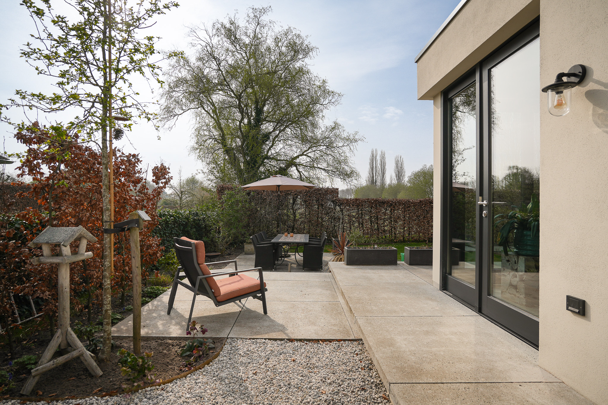 Aan de achterzijde is over de volle breedte een moderne aanbouw gerealiseerd, waardoor een royale woonkeuken is ontstaan waarin de binnen-buitenbeleving centraal staat. De grote schuifpui zorgt voor een directe verbinding met de onder architectuur aangelegde tuin.