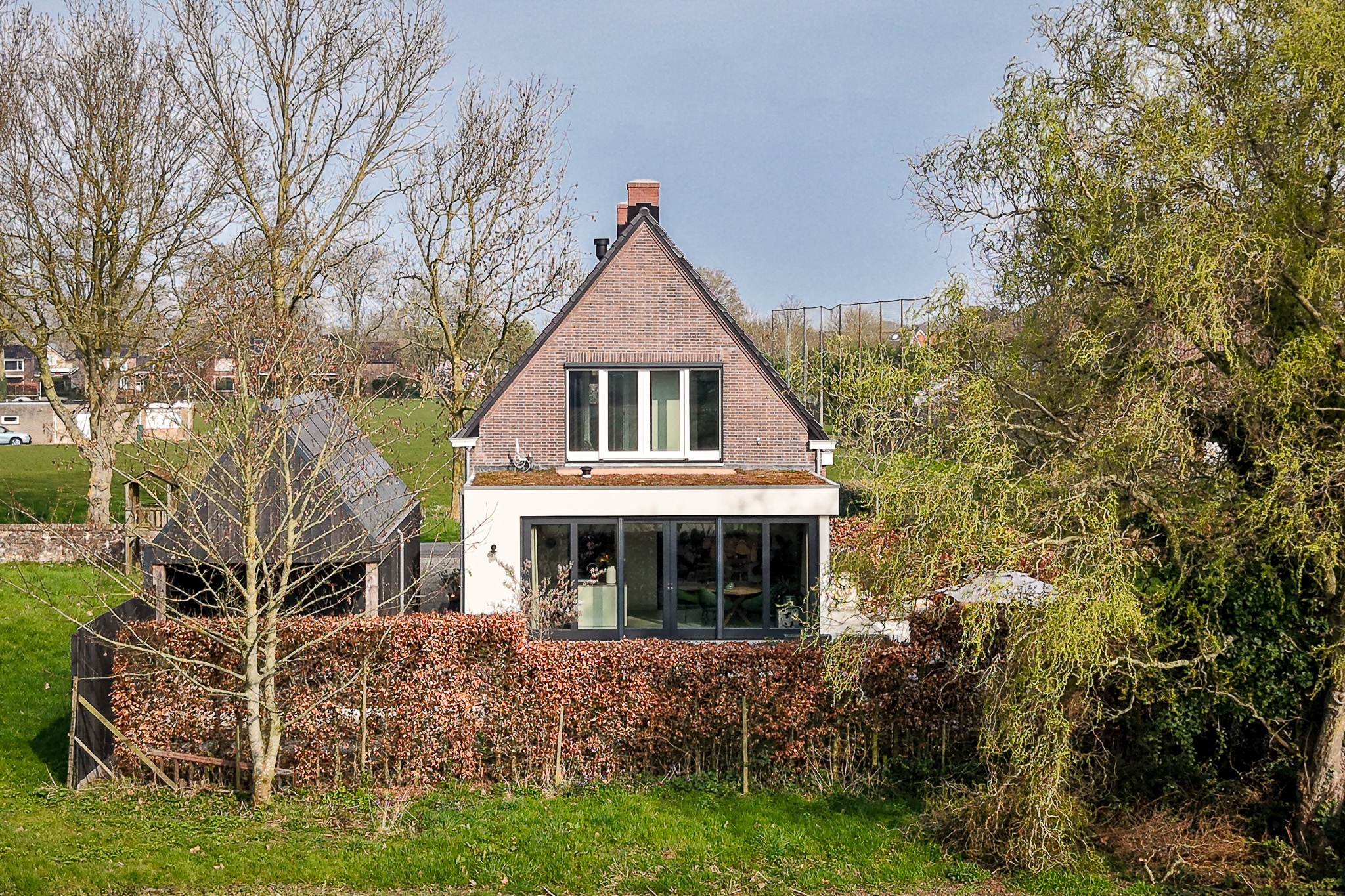 Naast de woning bevindt zich het bijgebouw, dat zich in de lengterichting uitstrekt langs de tuin en daarmee op natuurlijke wijze onderdeel vormt van het geheel. Aan de tuinzijde grenst een veranda, waar momenteel een comfortabele loungehoek is gecreëerd.