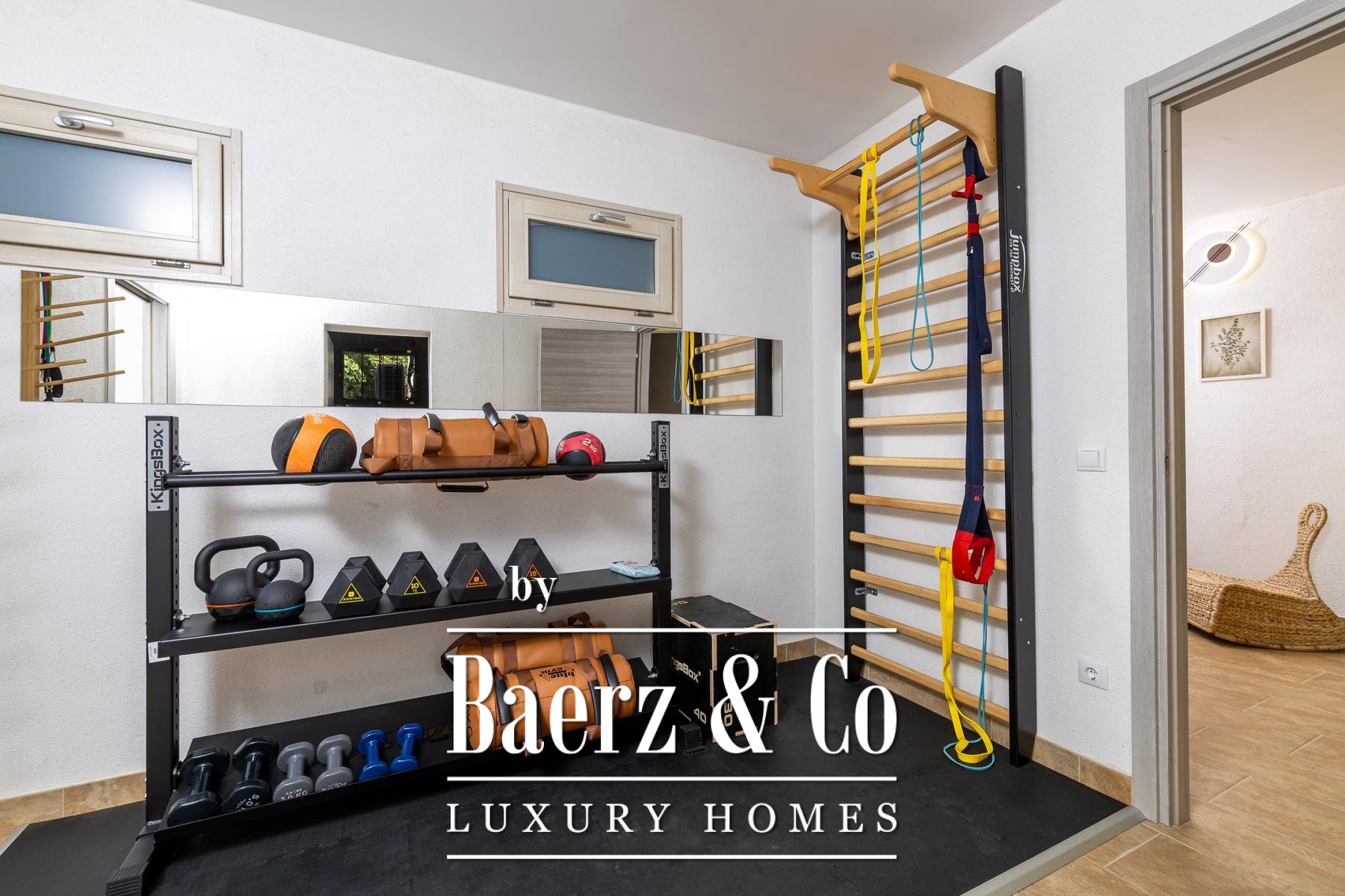 De residentie beschikt over vier slaapkamers en vier badkamers, verdeeld over zorgvuldig ingedeelde etages. In het souterrain bevinden zich ontspanningsruimtes en functionele voorzieningen zoals een privé-gym, kinderkamer, speelruimte, wasruimte en berging, allemaal verbonden via een centrale gang voor een soepele overgang.