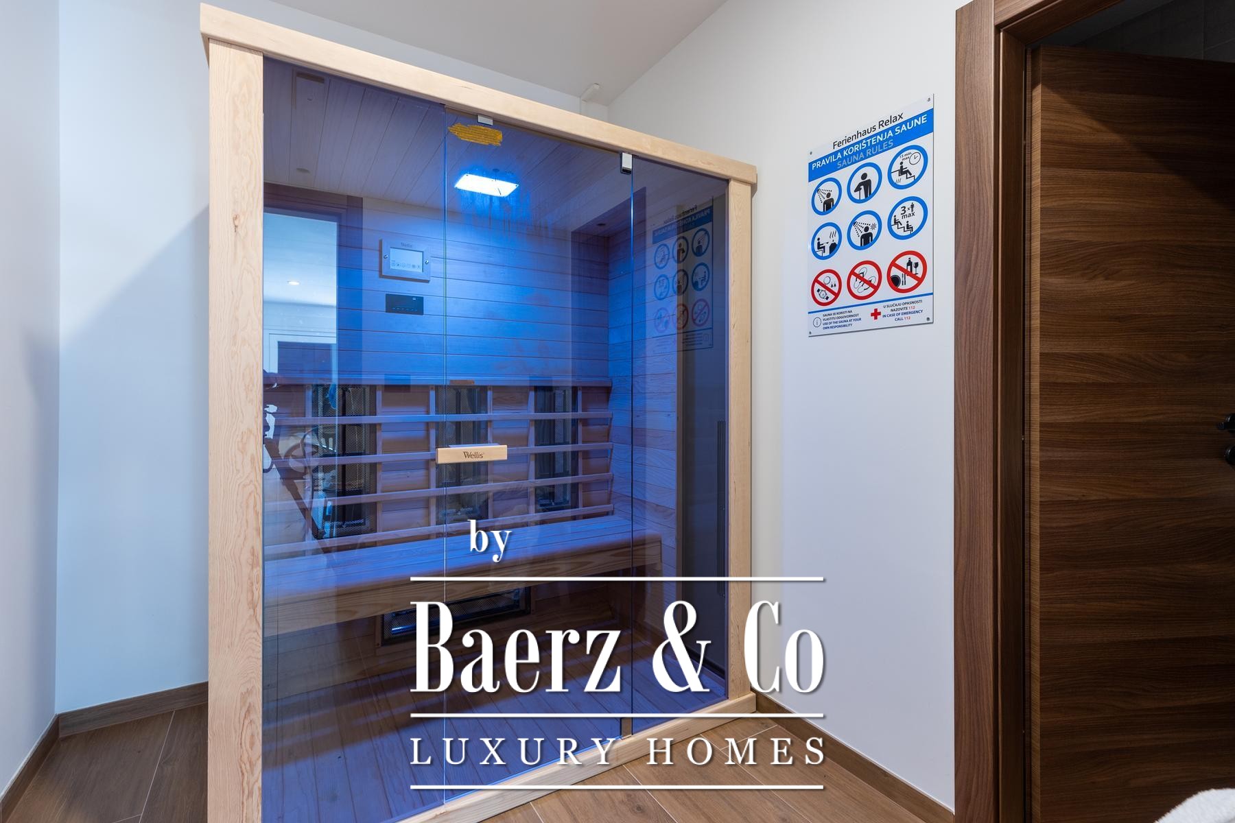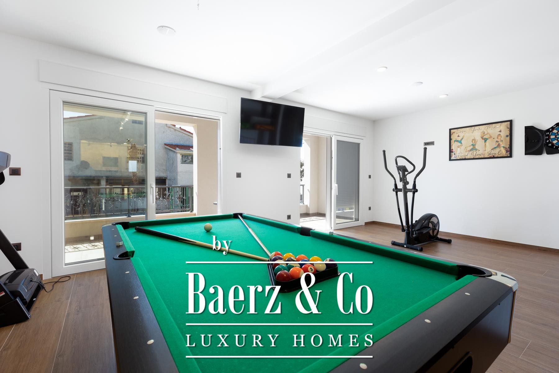 Newly built house in Kaštel Lukšić, divided into three residential floors and a roof terrace, the gross area of the house is 350 m2, located on a plot of 530 m2.The house consists of a ground floor, two floors and a roof terrace with a beautiful view, has five rooms, a spacious garden with parking for several cars, a swimming pool with a sunbathing area and an summer kitchen with a fireplace, behind of house is a basement.On the ground floor there is a social area with a kitchen and dining room, a mini fitness room and an entertainment area, a toalet and a large terrace in front, a mini sauna and a bathroom connected to the courtyard with a swimming pool and a sunbathing area. Outdoor heated pool measuring 5x6 meters, a sunbathing area and a summer house with a fireplace in an authentic style of wooden beams and a fireplace, on the other side of the house there is a garden with greenery.The first floor is connected by internal stone stairs and consists of: an entrance hall, an open-plan living room with a dining area, two comfortable bedrooms, two bathrooms, a laundry room-pantry and a large terrace to the south with a sea view.The second floor consists of: an entrance hall, an open-plan