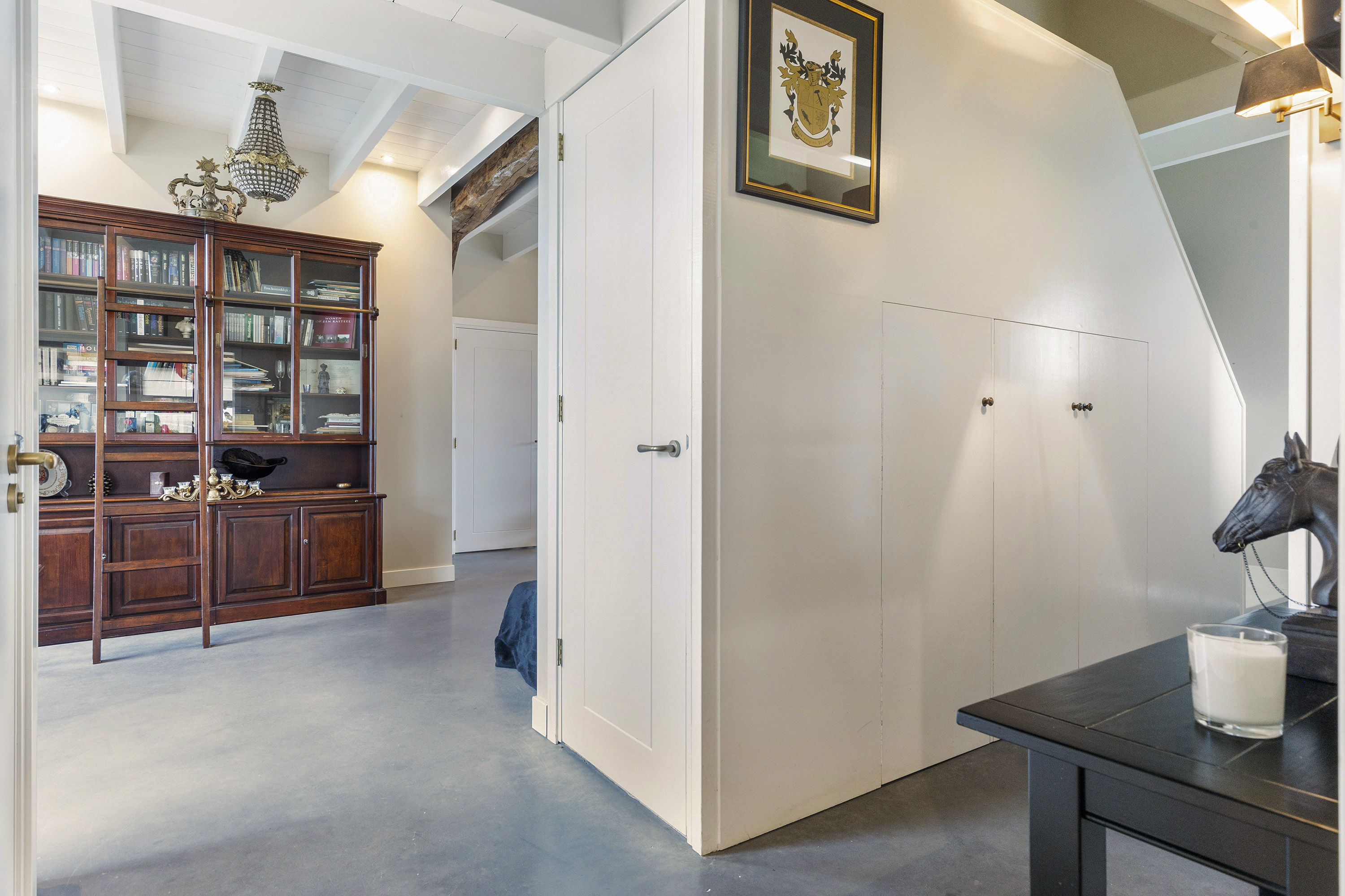 Via de karakteristieke tweedelige voordeur met venster betreedt u de royale hal, waar direct de ruimtelijkheid en kwaliteit voelbaar zijn. Hier bevinden zich de meterkast (18 groepen) en een praktische ingebouwde kastruimte onder de trap.