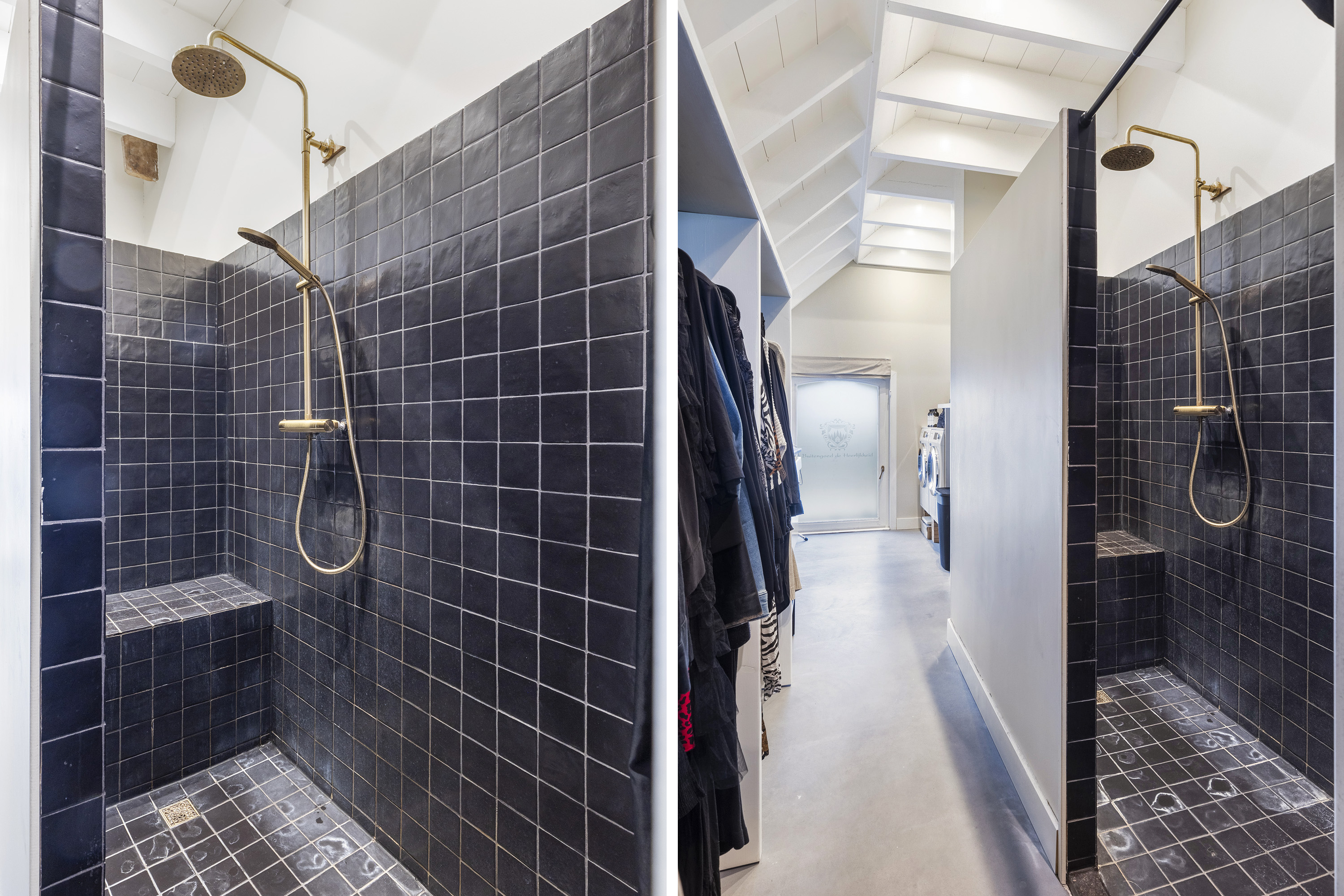 Op de begane grond bevindt zich daarnaast een royale hoofdslaapkamer met een open, loftachtige indeling en uitzicht op de tuin. De slaapkamer staat in verbinding met een en-suite kleedruimte en een inloopdouche met zwarte betegeling, een wastafelmeubel, toilet en een separate wasruimte.