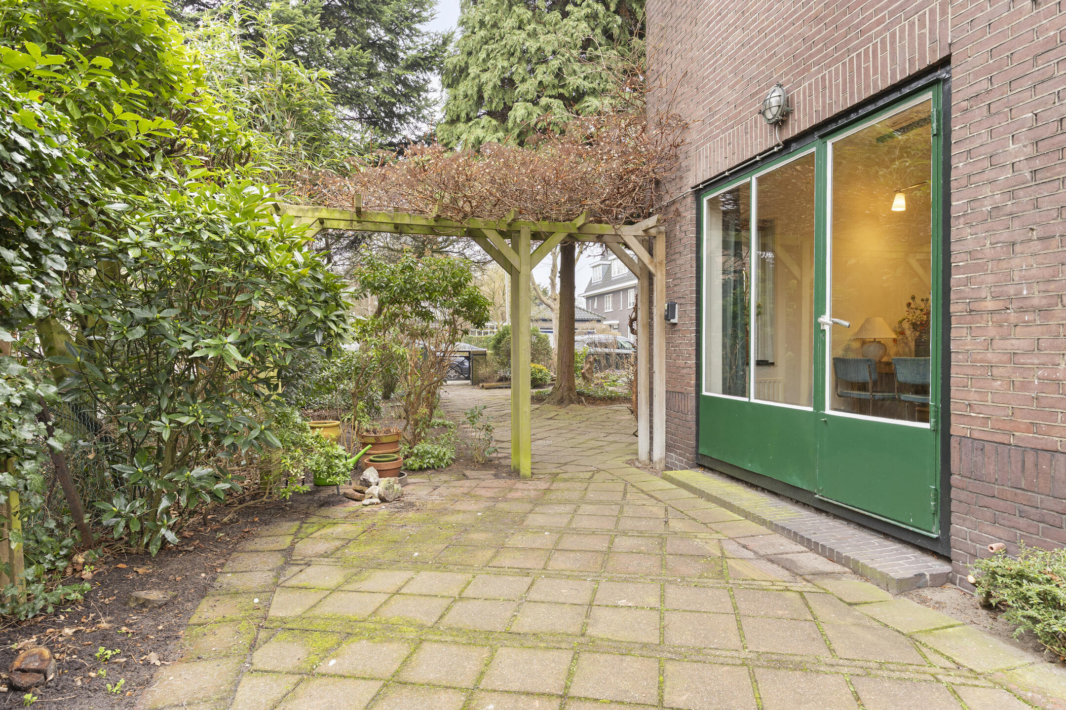 De woning ligt op een ruim perceel met aan drie zijden tuin, waarmee de mogelijkheid wordt geboden om op elk moment van de dag te genieten van de zon of juist de schaduw. De openslaande deuren vanuit de woonkamer, de deur vanuit de keuken, de achterdeur van de bijkeuken en de deur vanuit de garage verbinden huis en tuin vanuit alle vertrekken op de begane grond.